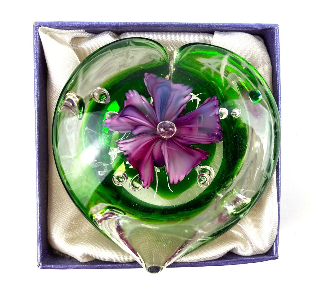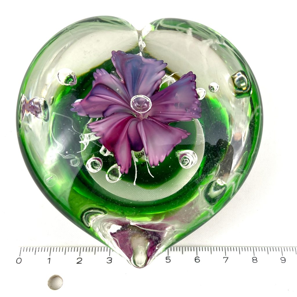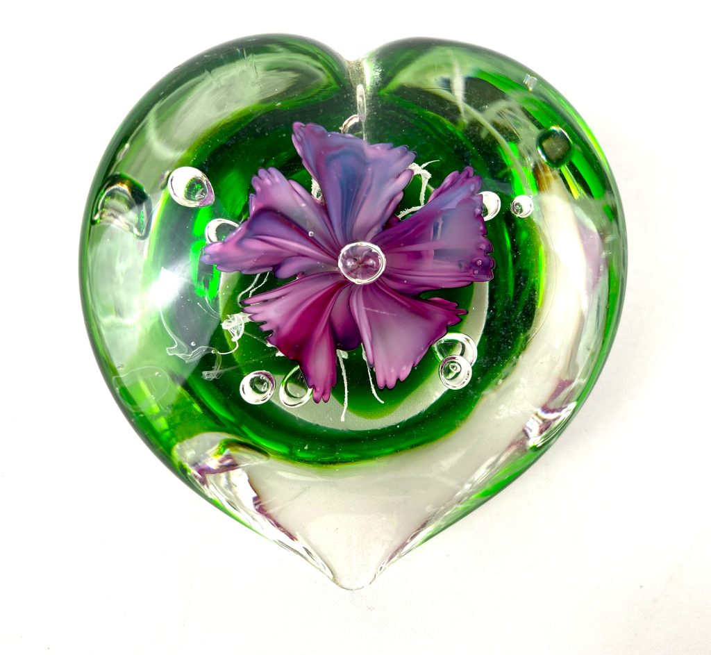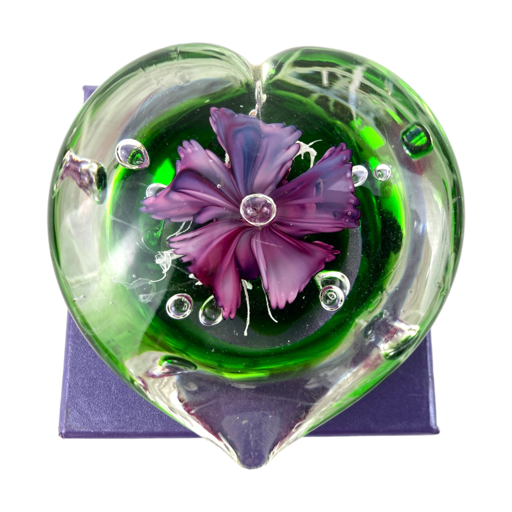 Glazen hartvormige presse-papier in groen/ transparant met van binnen een prachtige lila bloem.