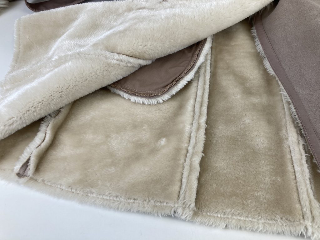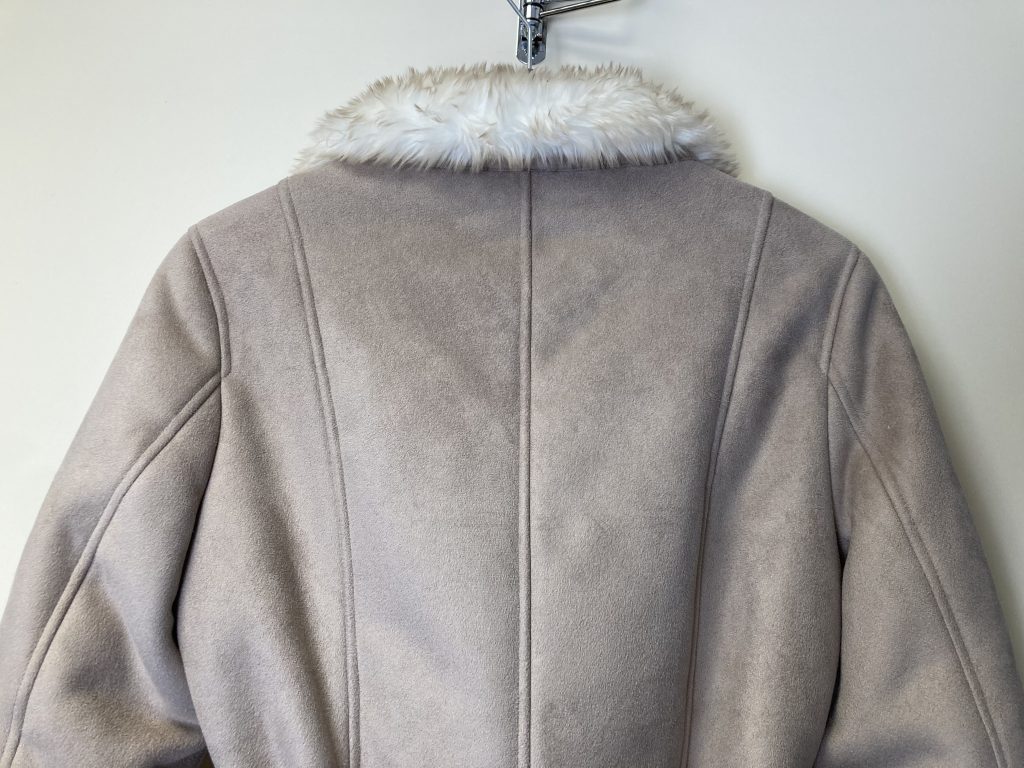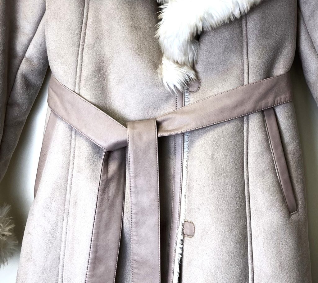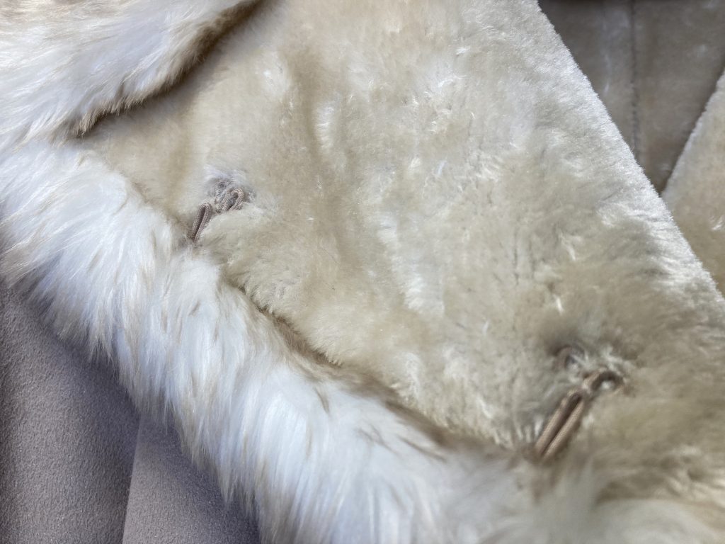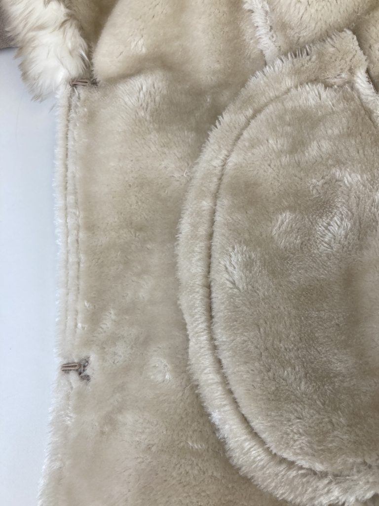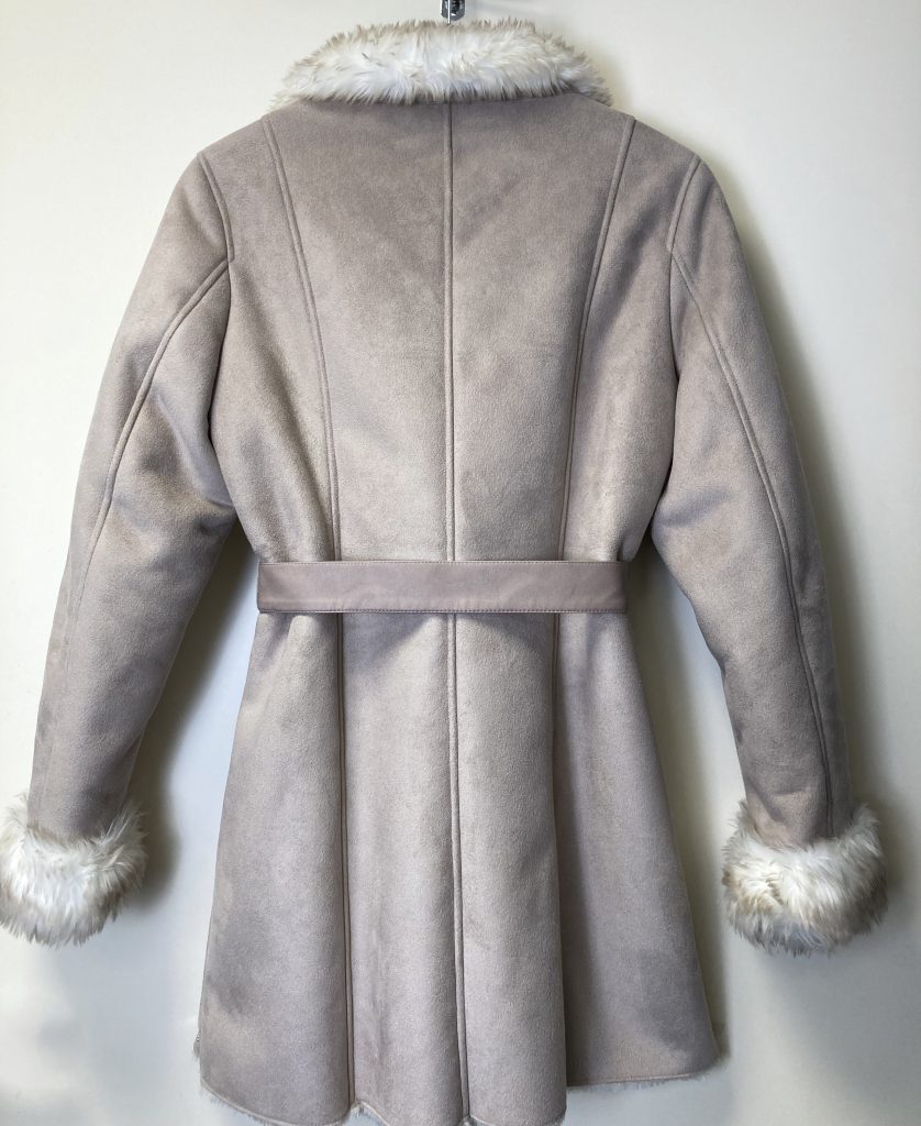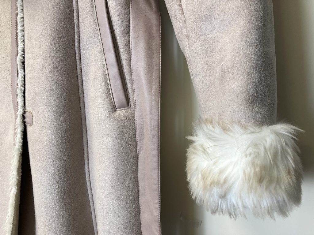 Kleur: beige. Met imitatie bont -kraag, -manchetten en -voering. Inclusief ceintuur. Wasbaar op 30 graden.