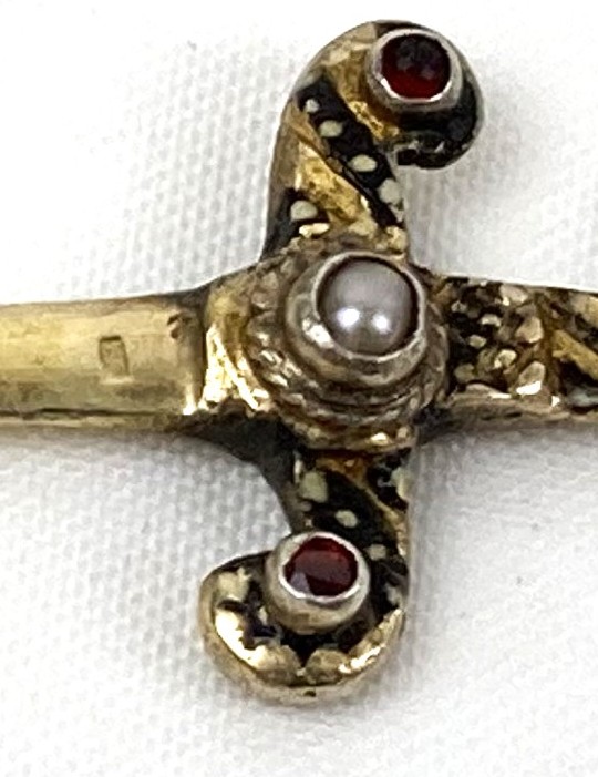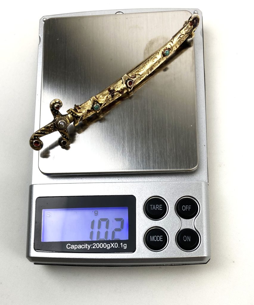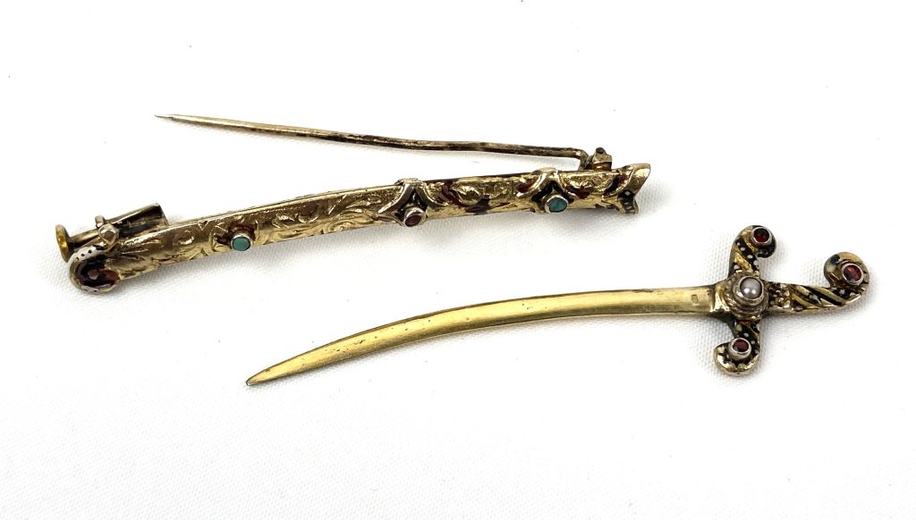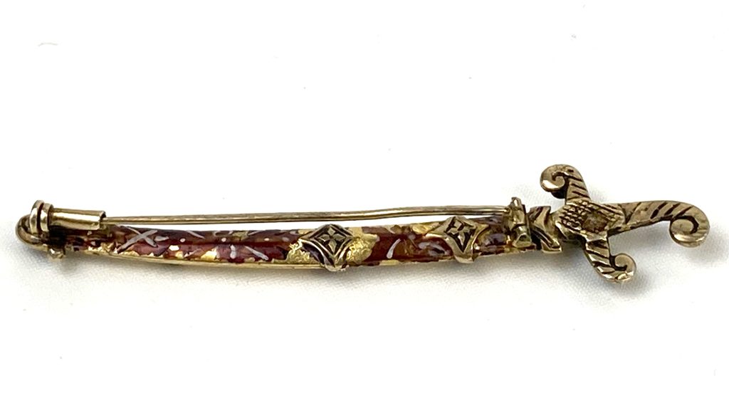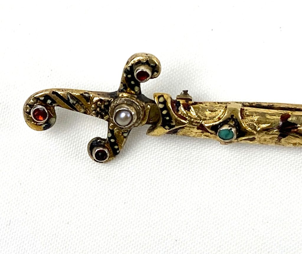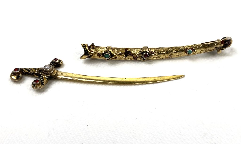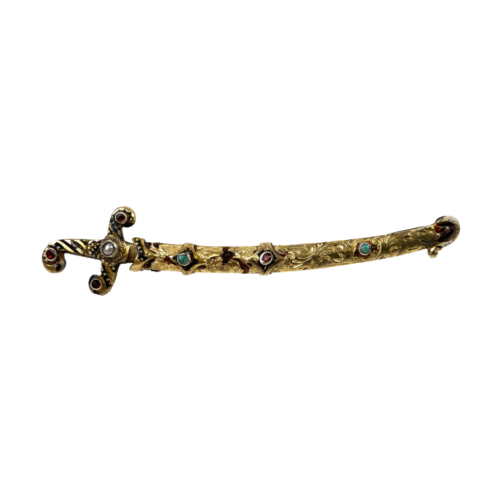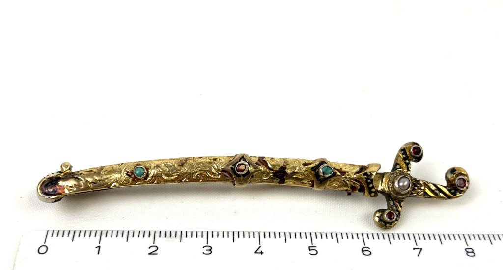 Art déco broche in de vorm van een sabel. Ingelegd met edelstenen.