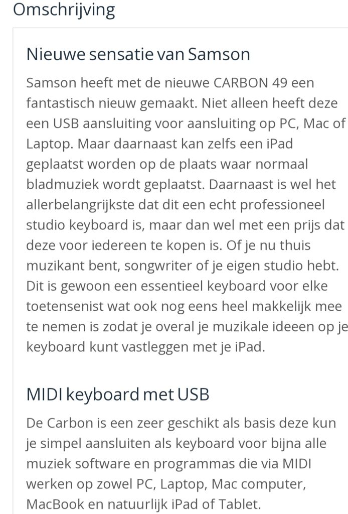 Carbon 49 USB Midi controller keyboard. Merk: Samson. Met doos en muziekboek. Zonder gebruiksaanwijzing. Voor meer info: zie foto’s. Winkelprijs € 92,-.