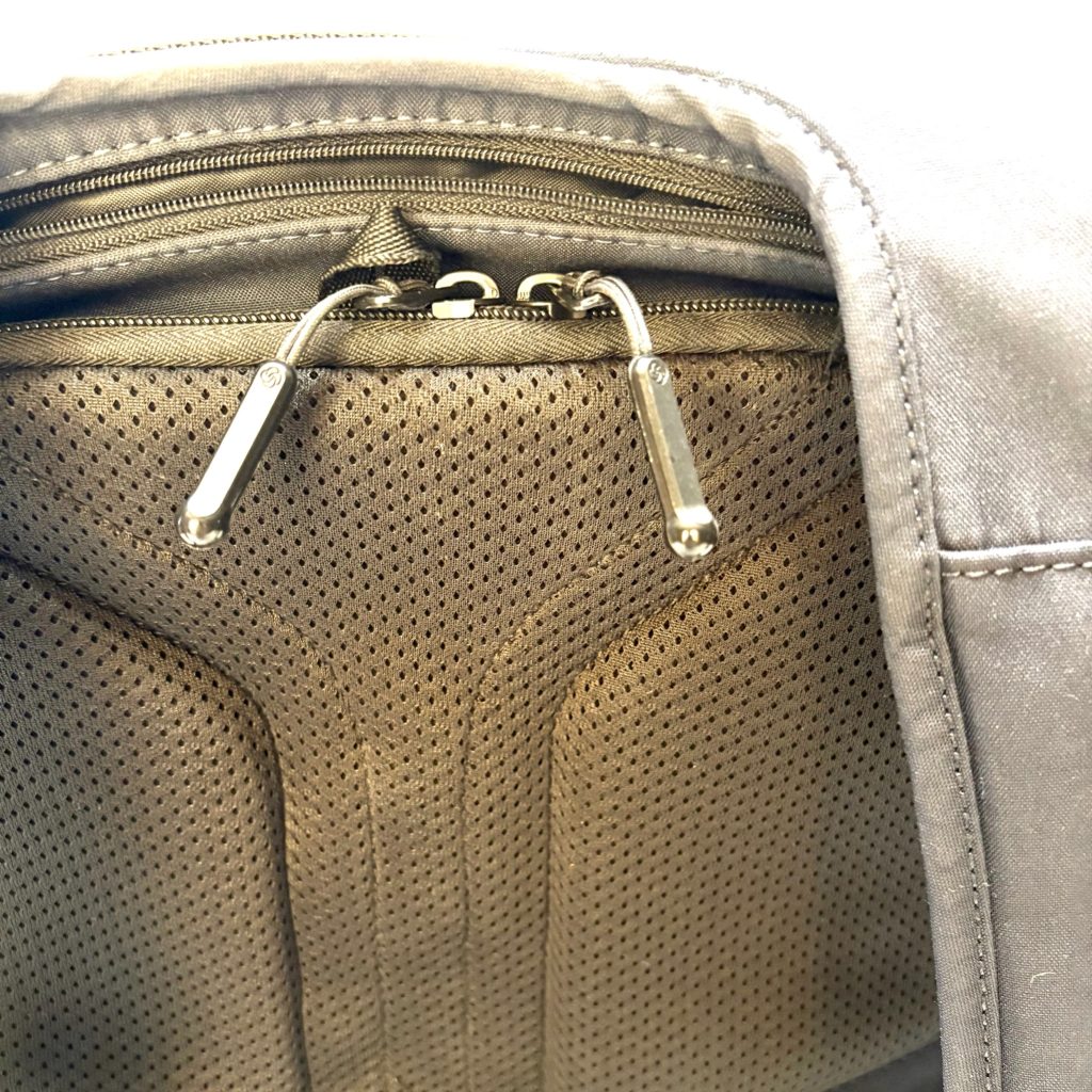 Het hoofdvak van de tas is alleen toegankelijk via de achterkant. De verborgen zijvakken en bovenvak zijn voorzien van een RFID-beveiliging.