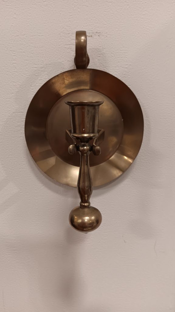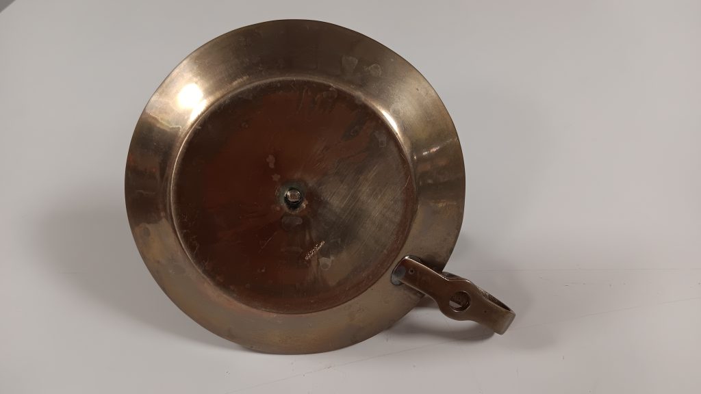 Deze vintage scheepskandelaar is van messing, is 15 cm hoog, en de diameter bedraagt 13,5 cm (handvat/ophangoog niet meegerekend).