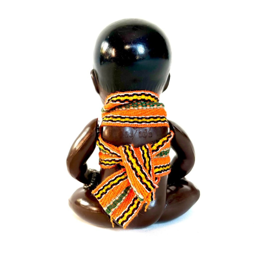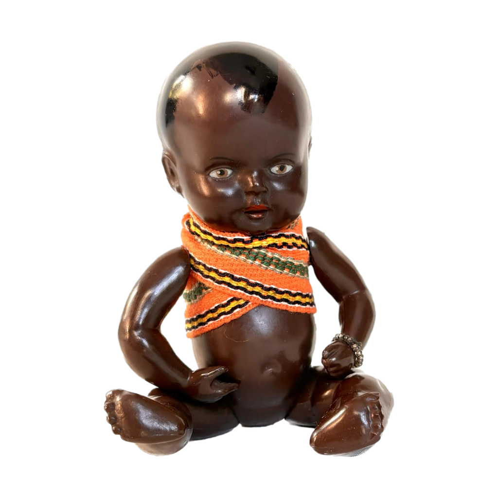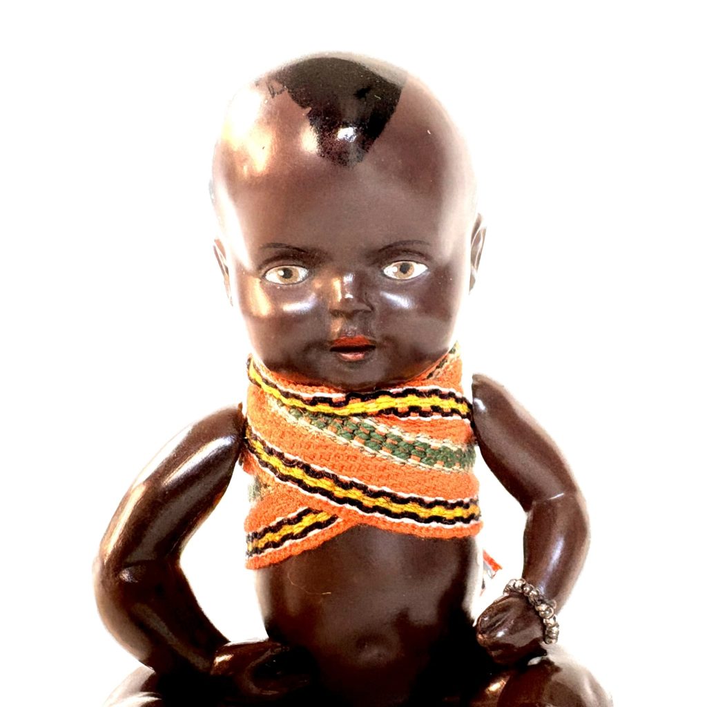 Het poppetje is zo’n 75 jaar oud en gemaakt van celluloid of Tortulon, een vroege kunststof die halverwege de vorige eeuw werd gebruikt. Het kleintje ziet er nog mooi uit. Alleen het elastiek waarmee de armen en benen vastzitten is iets uitgerekt.