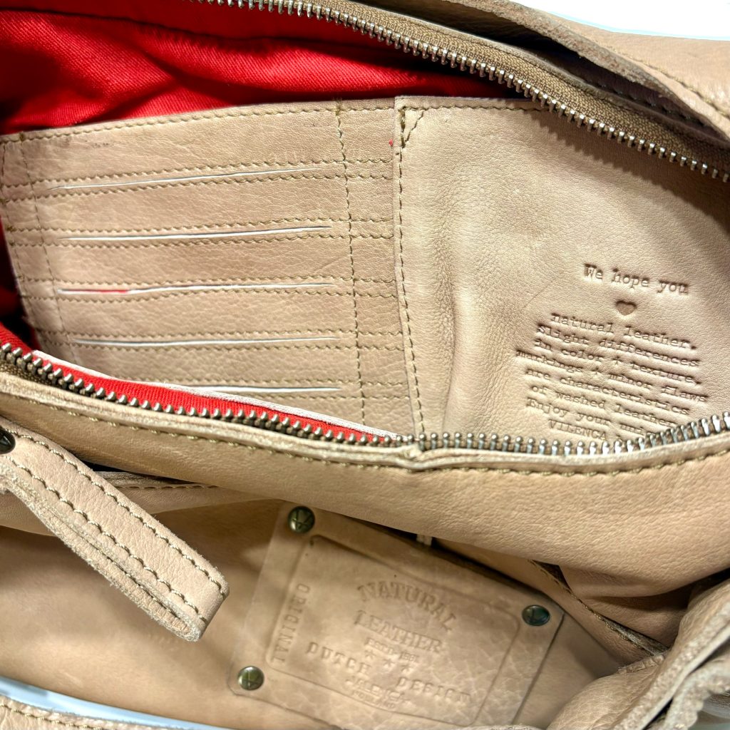 Het interieur van de tas is rood. Binnenin bevinden zich hoesjes voor pasjes en voor de telefoon en nog een extra vak met rits. Aan de buitenzijde nog twee grote zakken met rits.