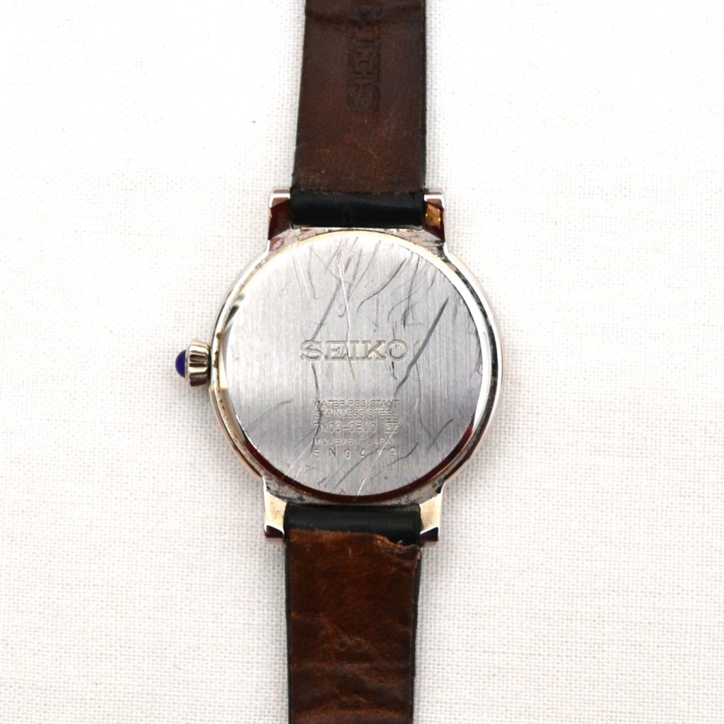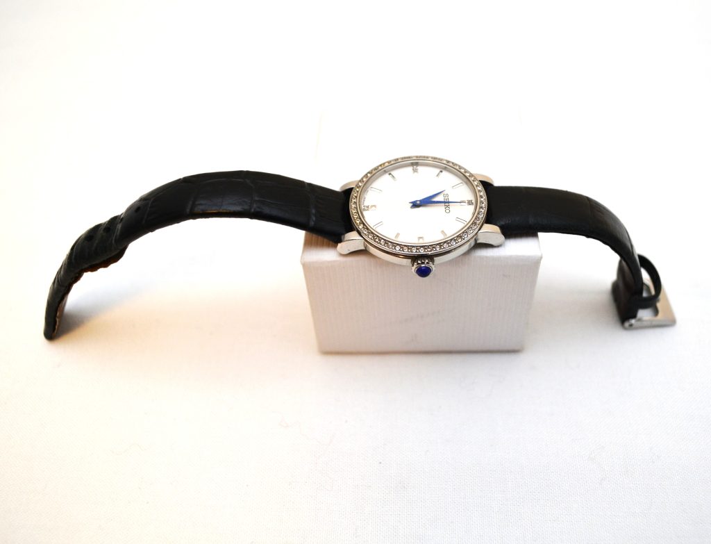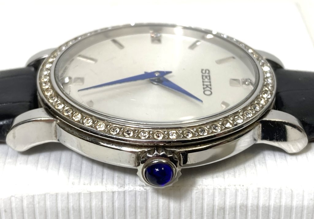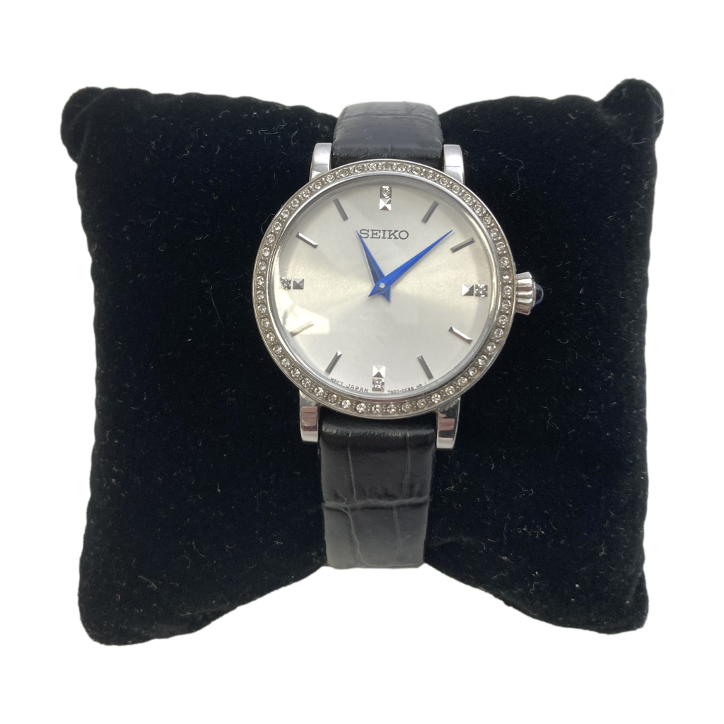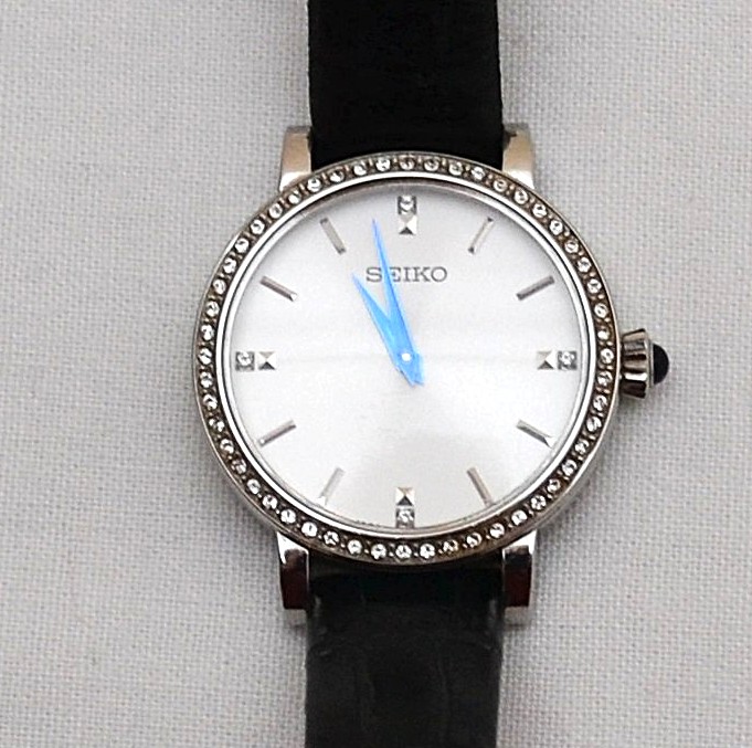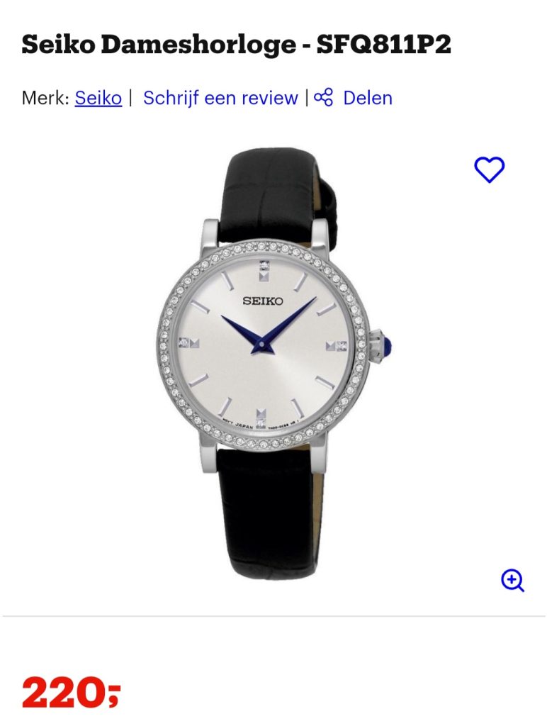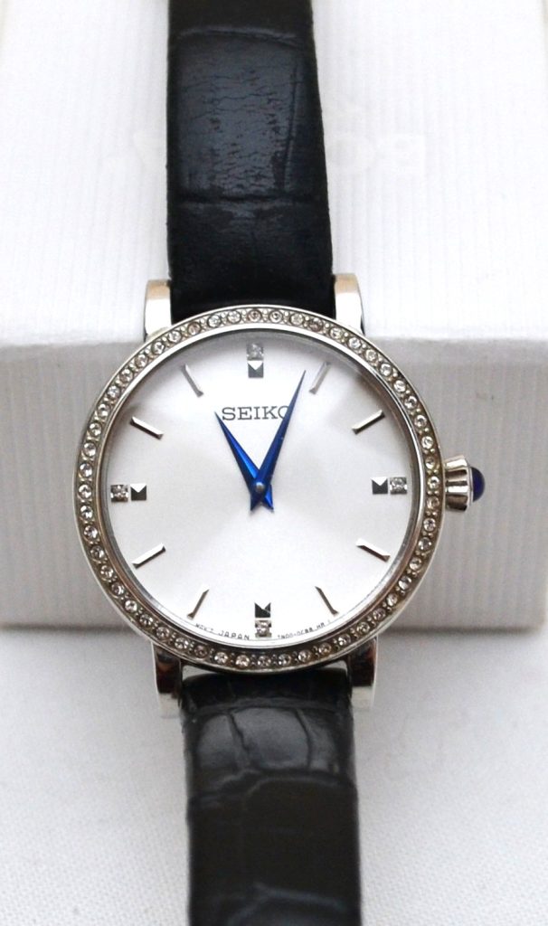 Seiko dames horloge, model SFQ811P2. Van mineraalglas met rondom strass steentjes. Met rvs kast (30 mm). Blauwe wijzers en knopje. Met zwart leren bandje. Enkele krasjes aan achterkant kast, verder in uitstekende staat. Winkelprijs: 220,00.