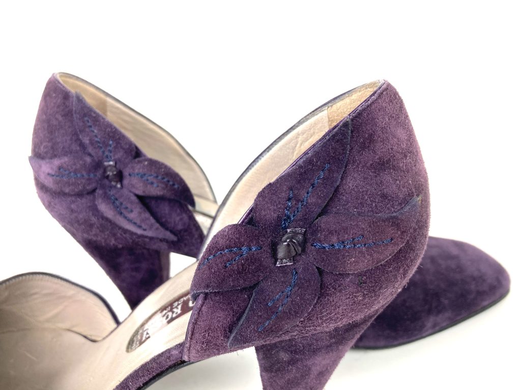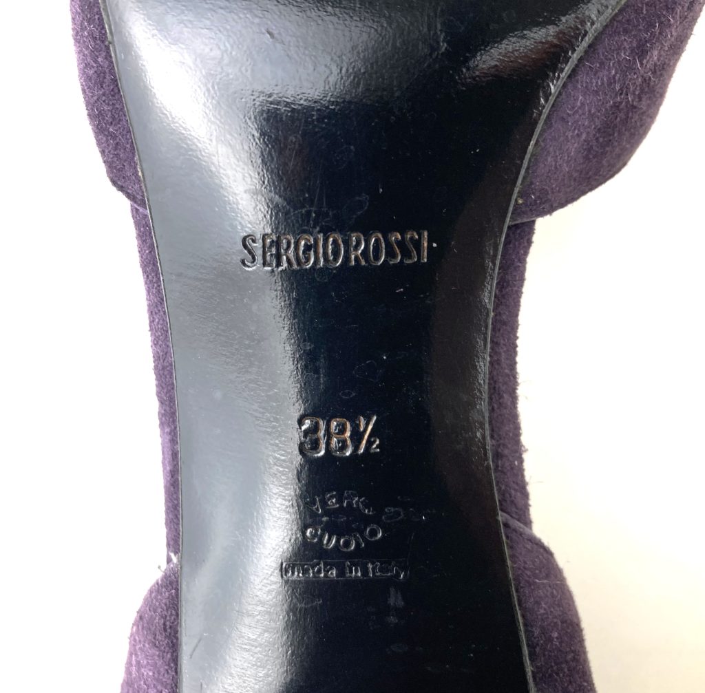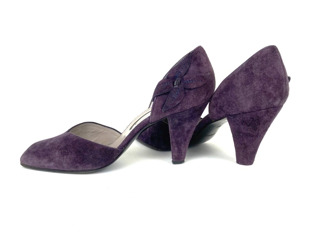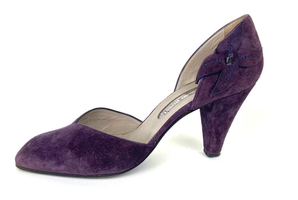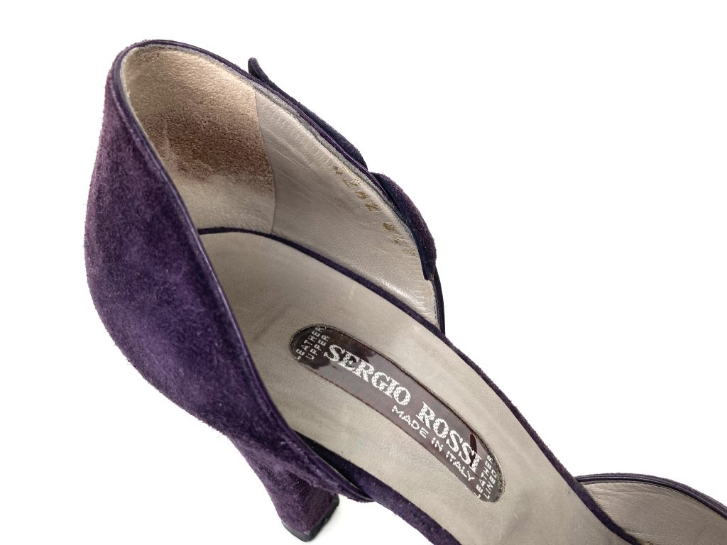 Paarse suède pumps van Sergio Rossi (Italië). Maat 38,5. Leer gevoerd. Hoogte suède hak: 7 cm. Fraai gedecoreerd met een bloem. Onderkant van één hak ontbreekt, verder in goede staat. Nieuwprijs: ca. 500 euro.