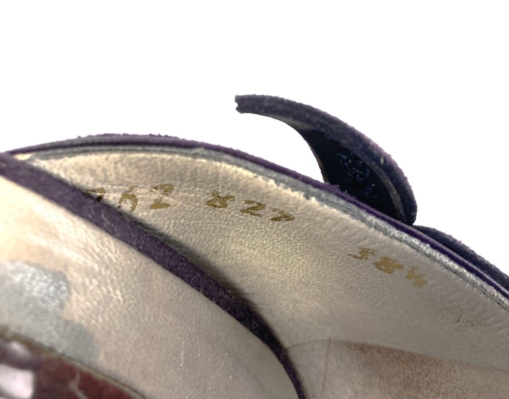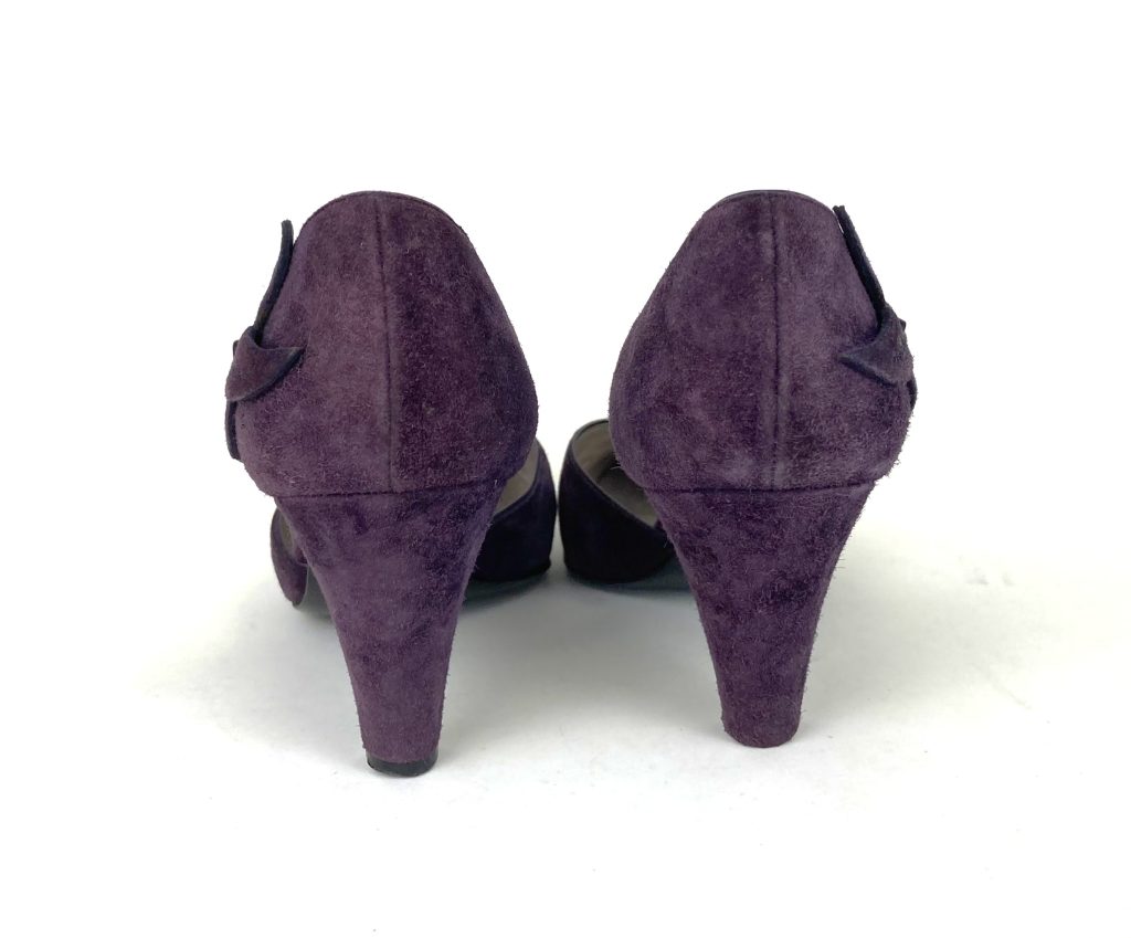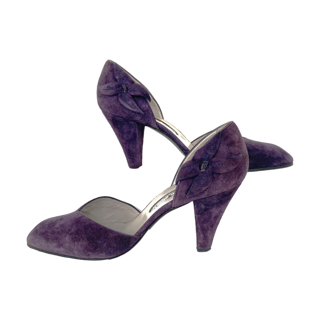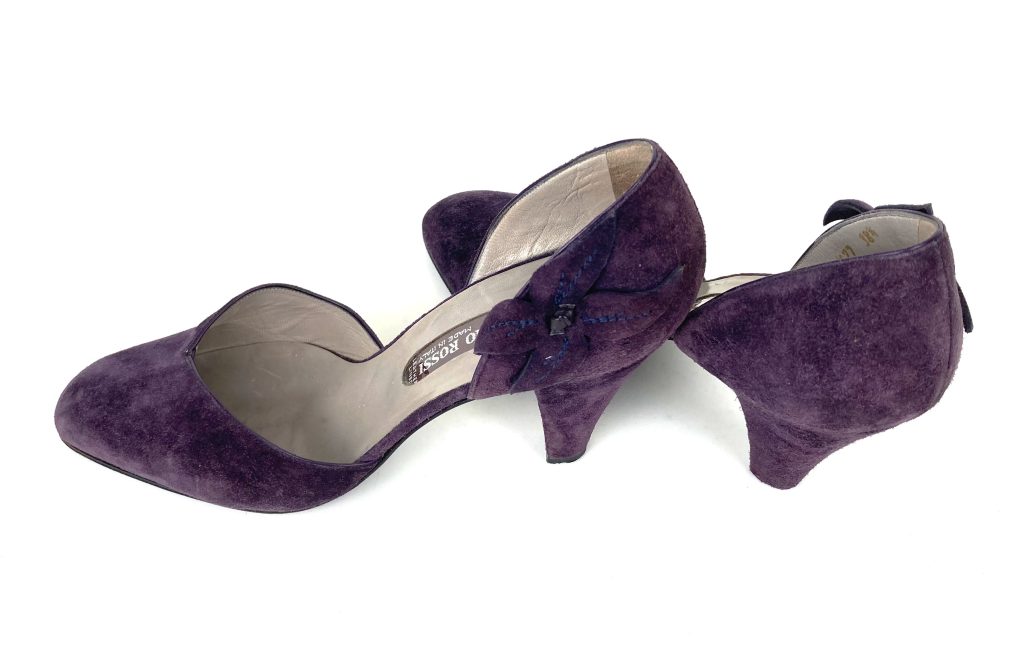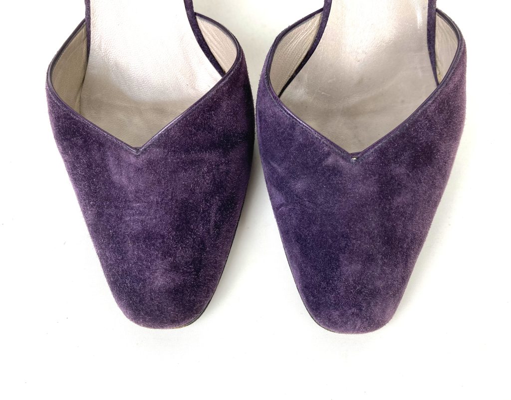 Paarse suède pumps van Sergio Rossi (Italië). Maat 38,5. Leer gevoerd. Hoogte suède hak: 7 cm. Fraai gedecoreerd met een bloem. Onderkant van één hak ontbreekt, verder in goede staat. Nieuwprijs: ca. 500 euro.