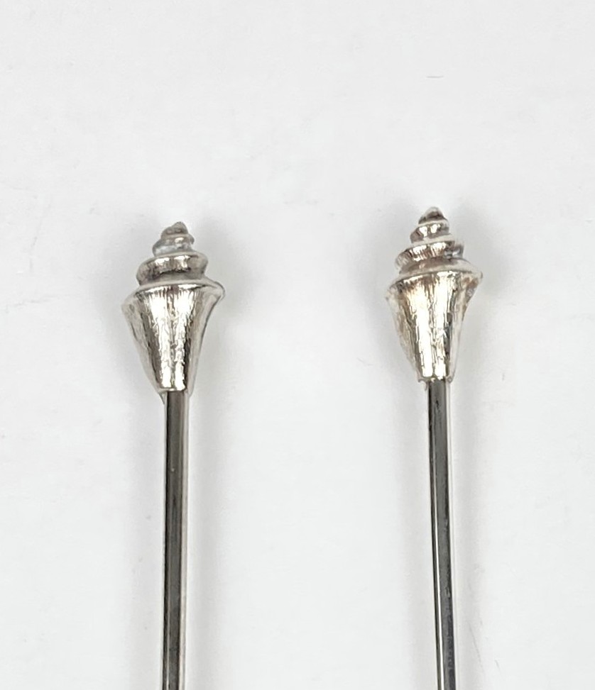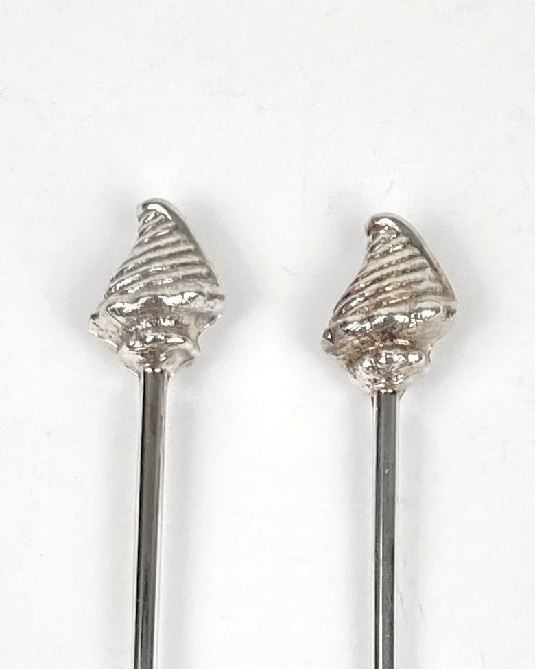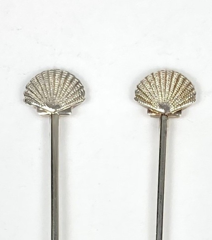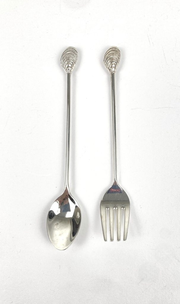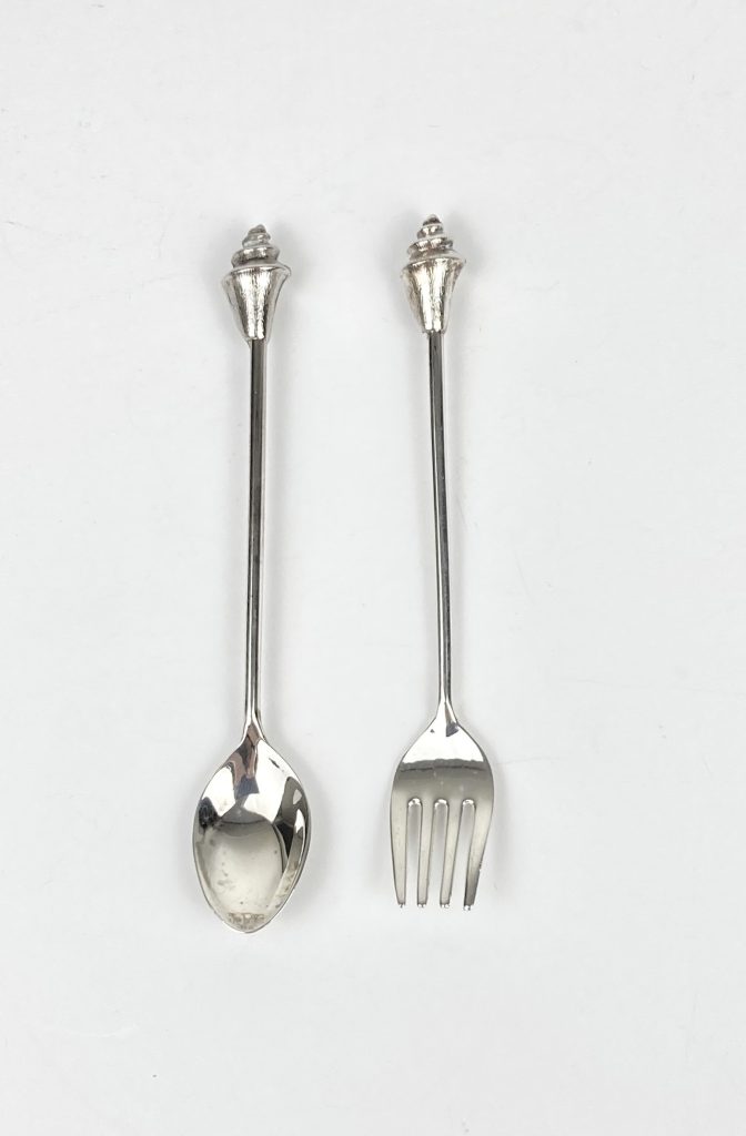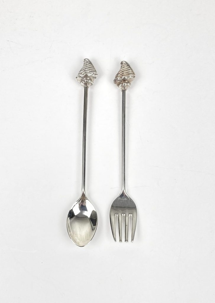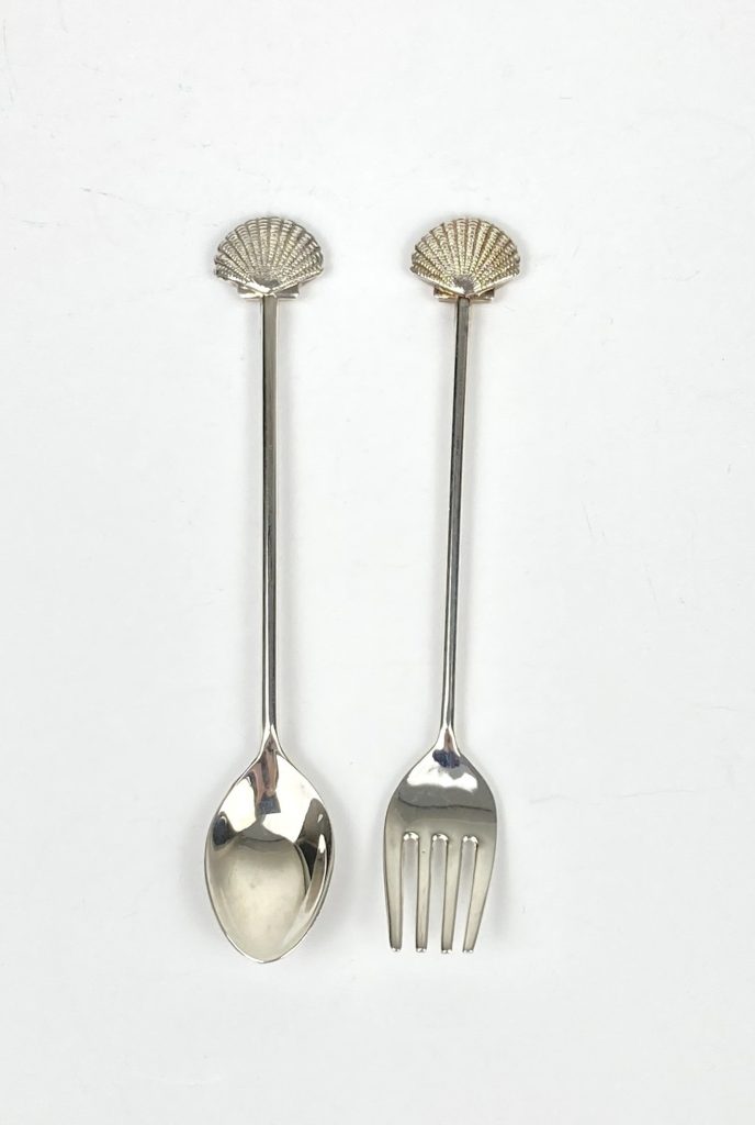 6 Shell lepeltjes en 6 gebakvorkjes. Verzilverd. Met schelpen/zeevruchten. In de jaren ’80 kon men deze aanschaffen na het sparen van Shell zegeltjes. In uitstekende staat.