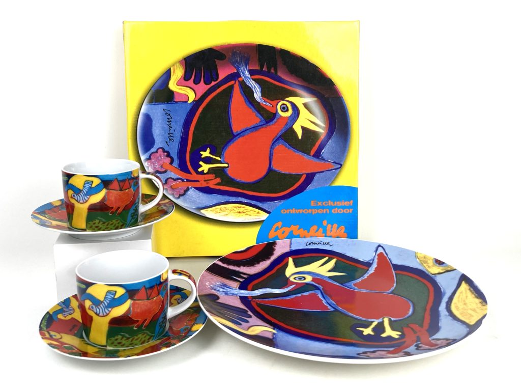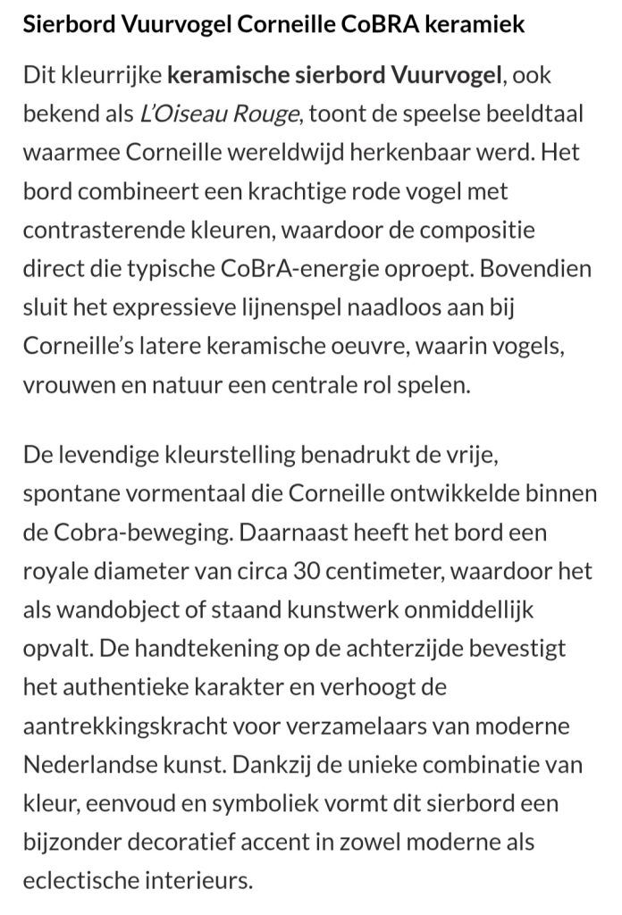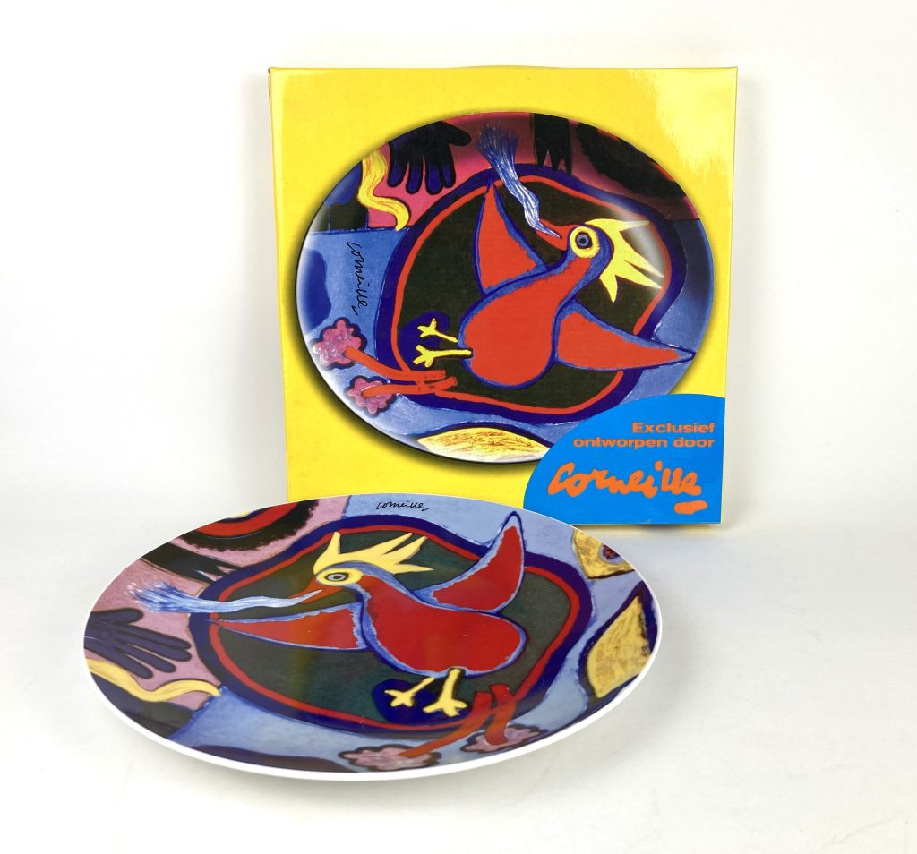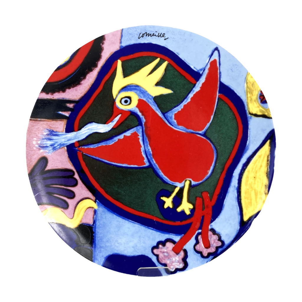 Sierbord. Kunstenaar: Corneille (1922-2010). Titel: Vuurvogel/L’Oiseau Rouge. Periode: latere carrière van Corneille. Materiaal: keramiek, polychroom beschilderd. Diameter: ca. 30 cm. Signatuur: handgesigneerd. Stijl: CoBrA, expressief modernisme. Met originele verpakking. In goede staat. Zie ook de advertentie van 2 kop- en schotels.