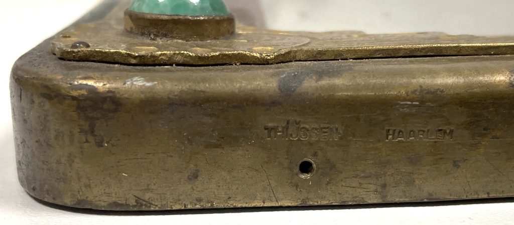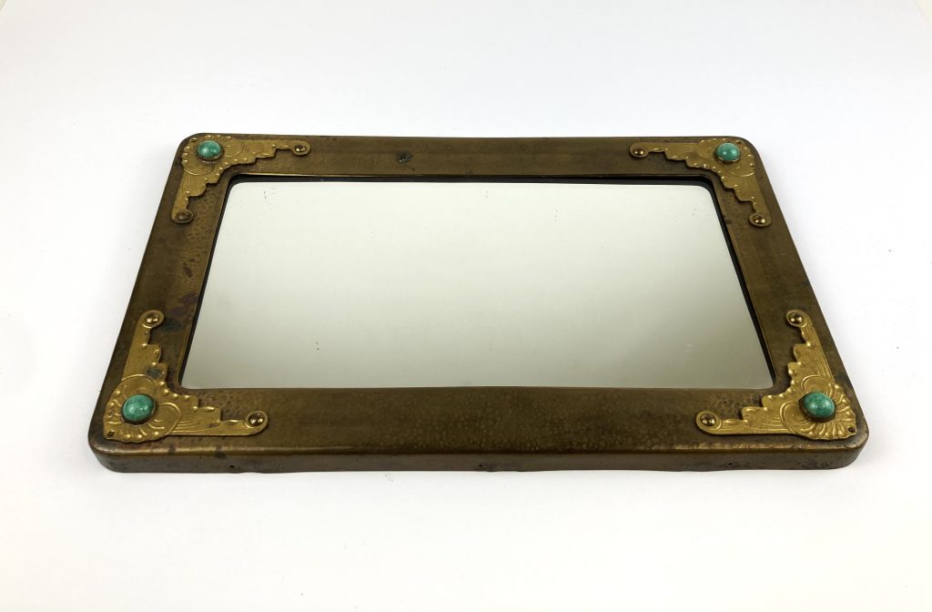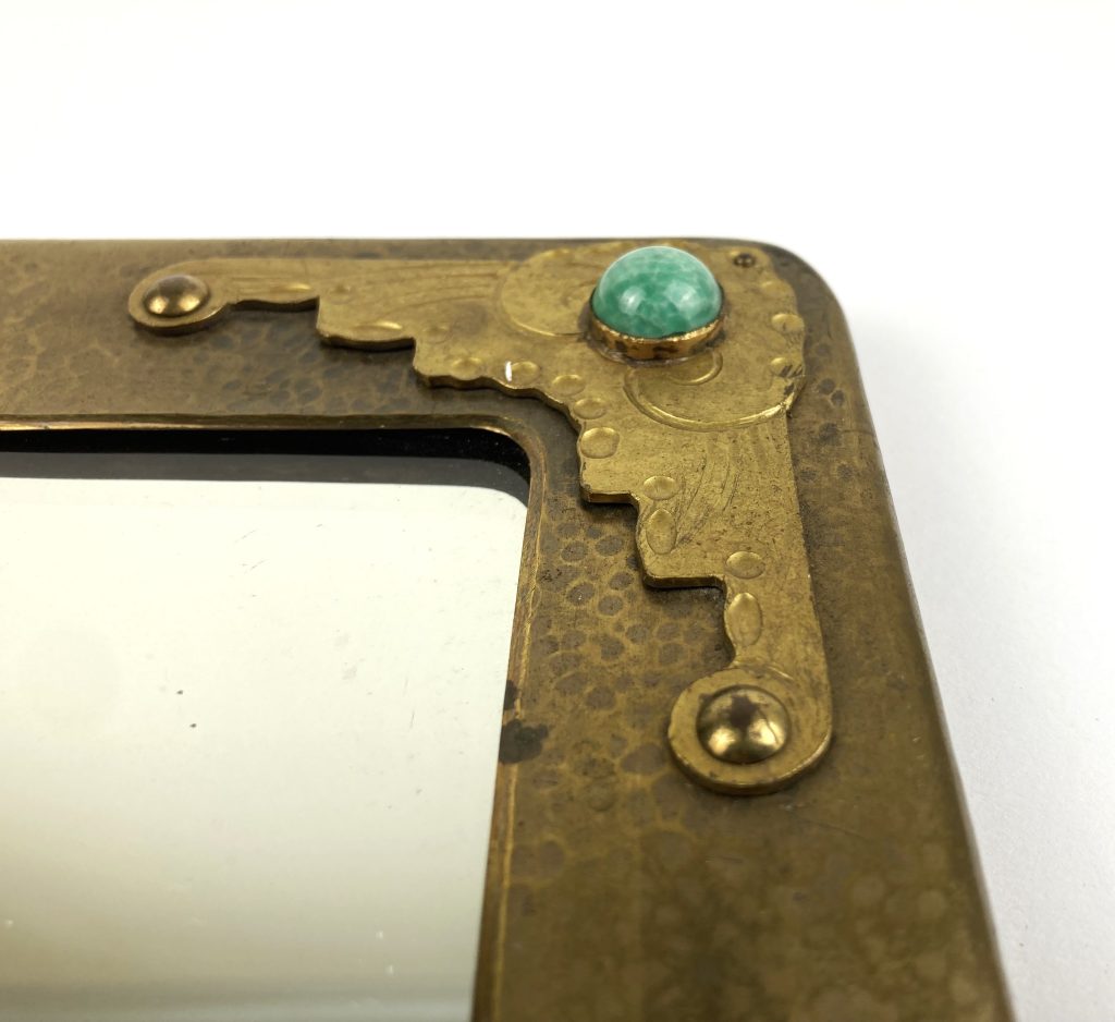 Messing spiegel in Jugendstil stijl. Gesigneerd: Thijssen Haarlem. Gedecoreerd met o.a. turkoois.