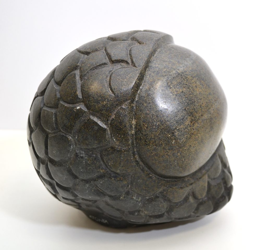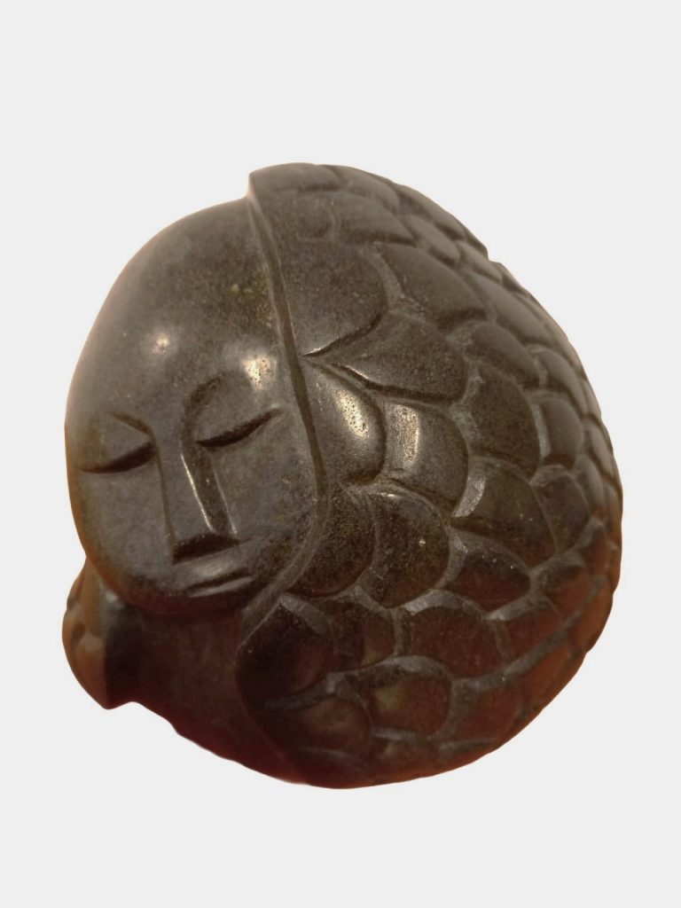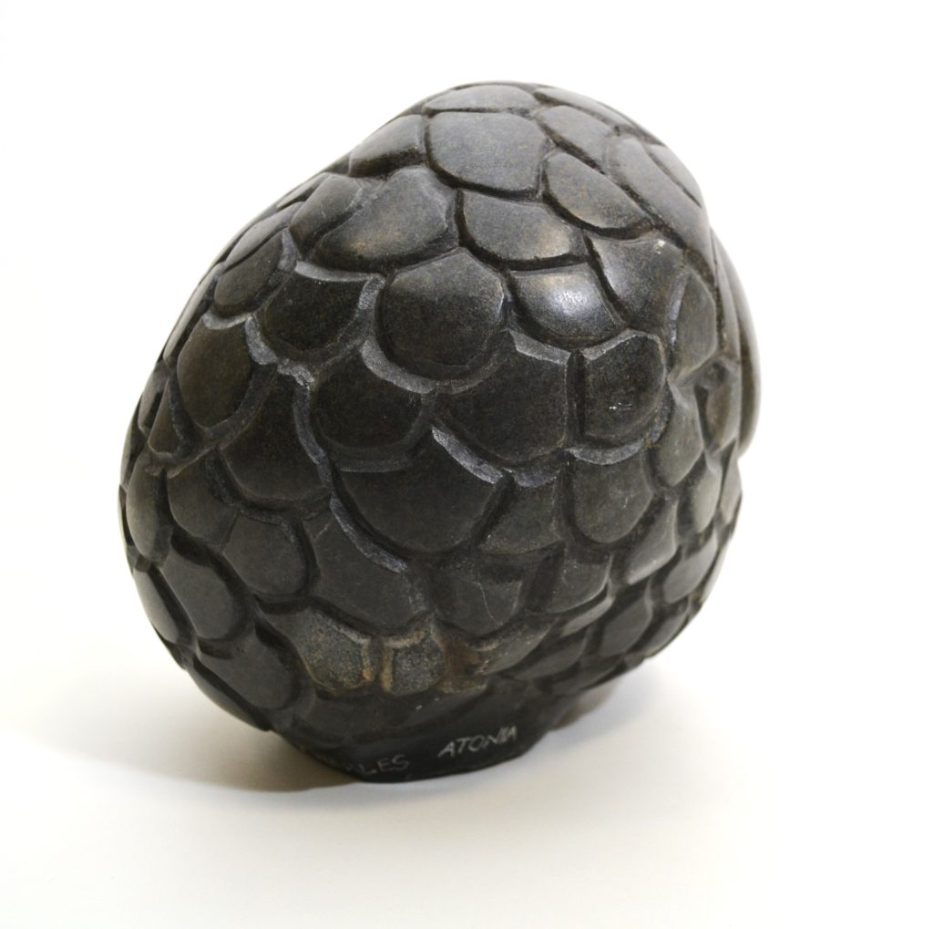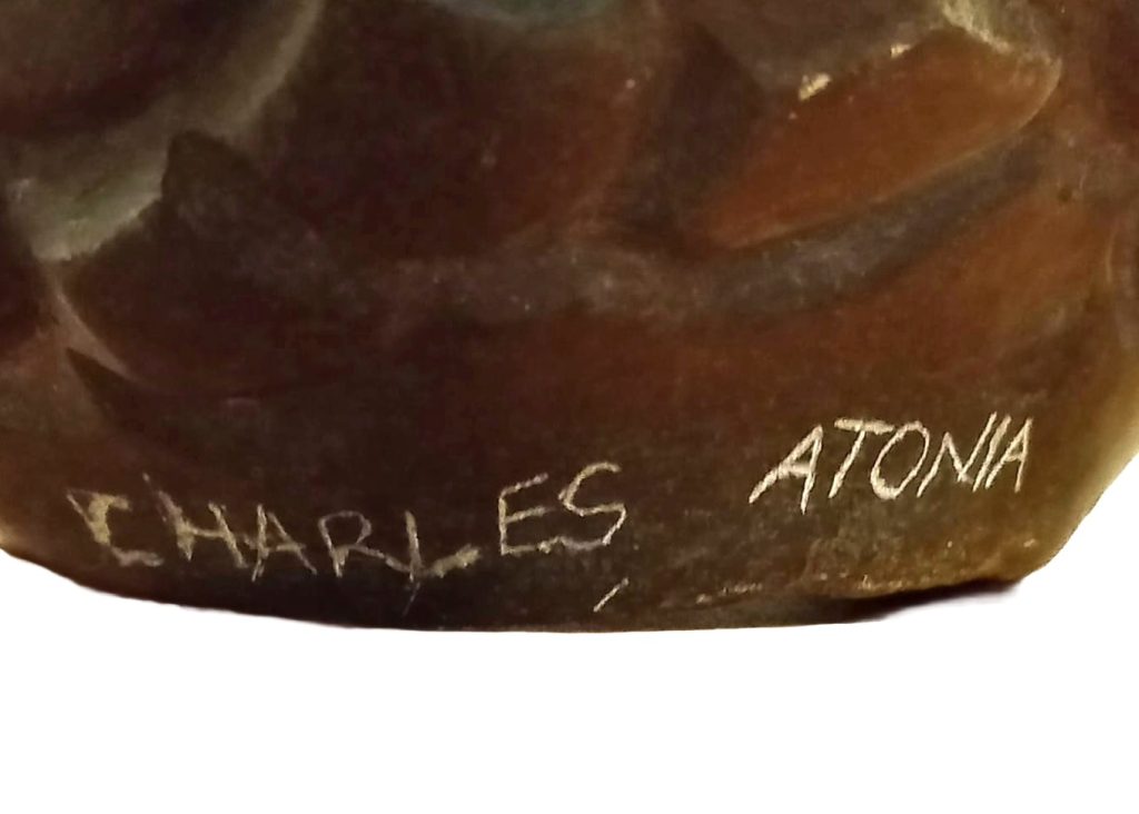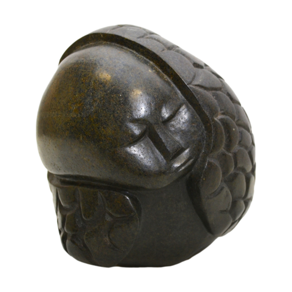 Zwaar antraciet grijs stenen sculptuur van een hoofd. Gesigneerd: Charles Atonia.