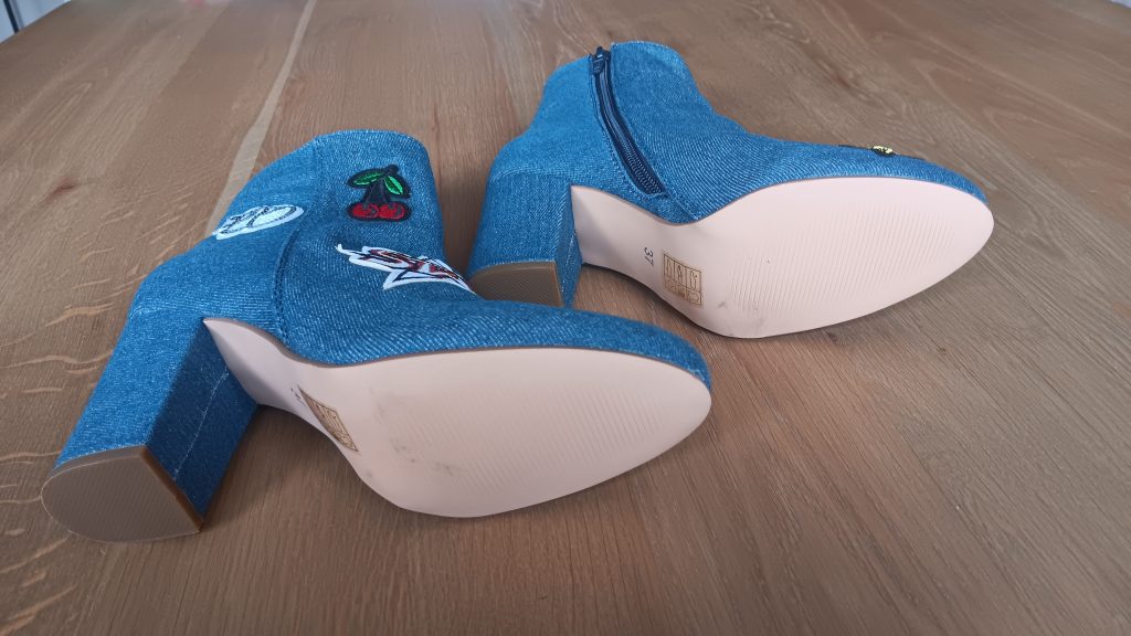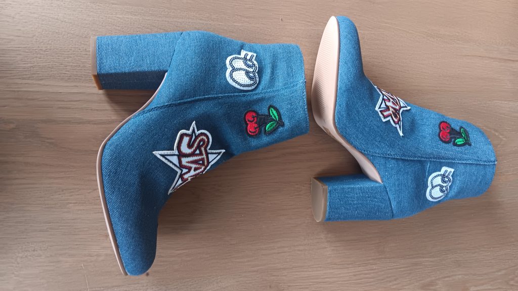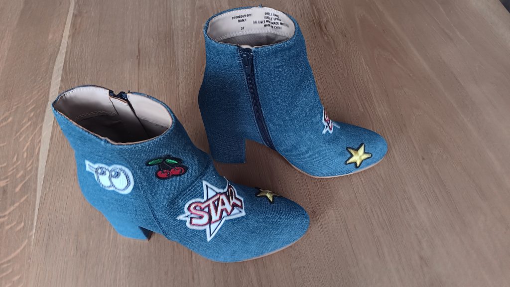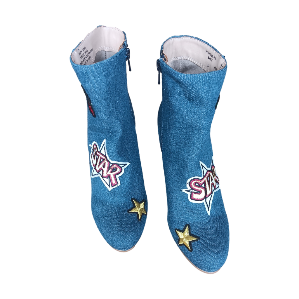 Denim (jeansblauw) enkellaarsjes met rits en applicaties aan de voorkant en zijkant van het merk Steve Madden, maat 37, hakhoogte 8,5 cm, in nieuwstaat.