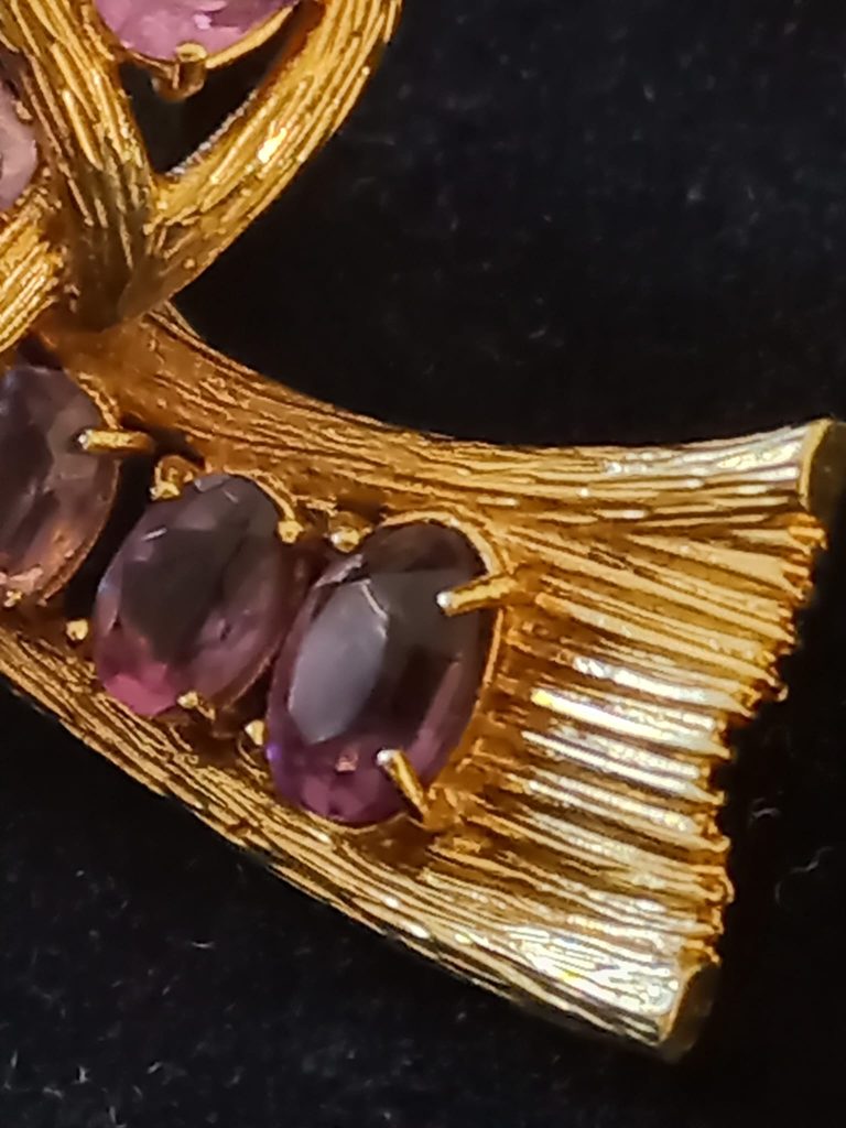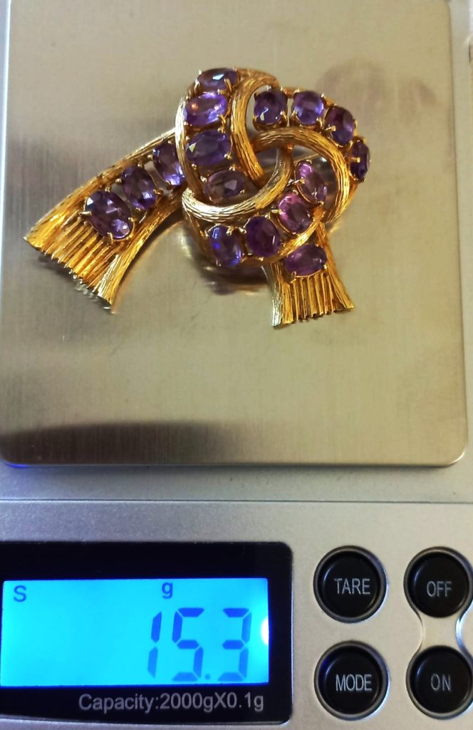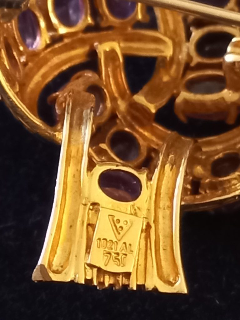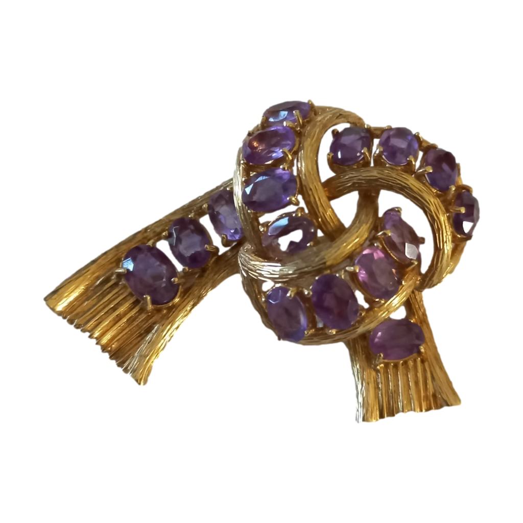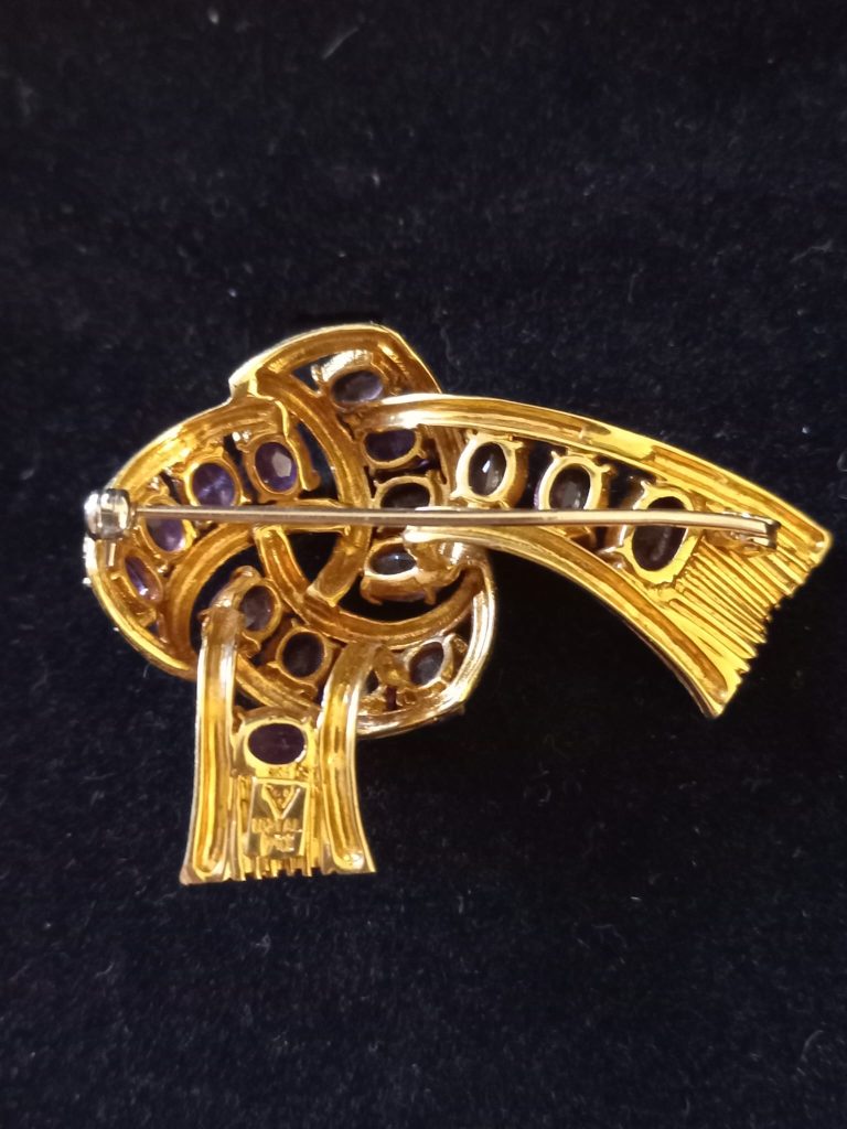 18 Karaat geelgouden strik broche. Opengewerkt en bezet met 16 ovaal geslepen amethisten. Gemaakt in Alessandria (Italië) rond 1960-80. De broche is gemerkt met 750 (= 18 karaat goud), 1021AL (= goudsmid?) en AL staat voor Alessandria, een V met aan de binnenzijde van de V 3 puntjes. Gewicht: 15,3 gram. Gewicht goud: 9,3 gram. In prachtige staat.