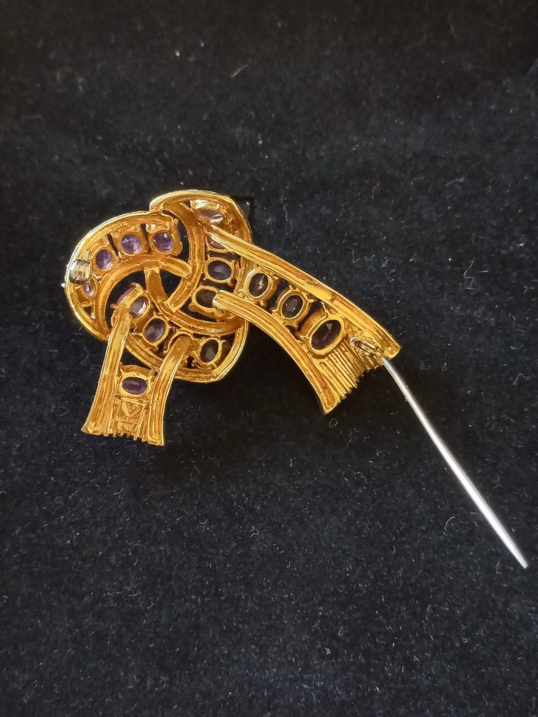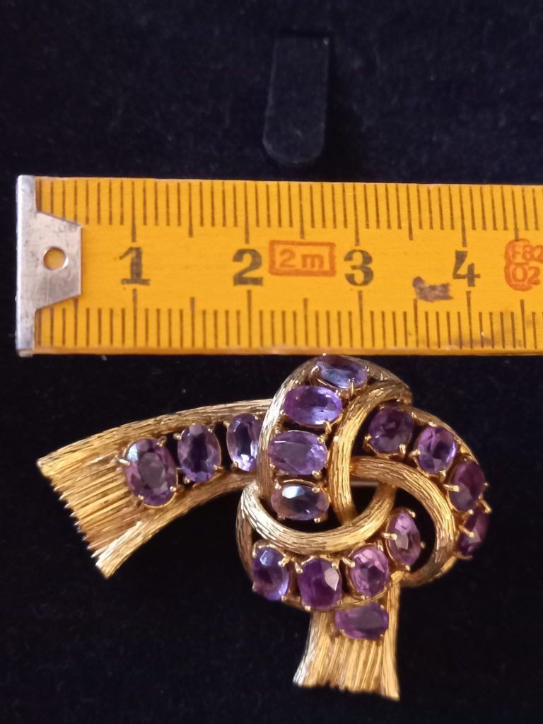 Strik broche – 18 Krt goud – Met 16 amethisten – 15,3 gram