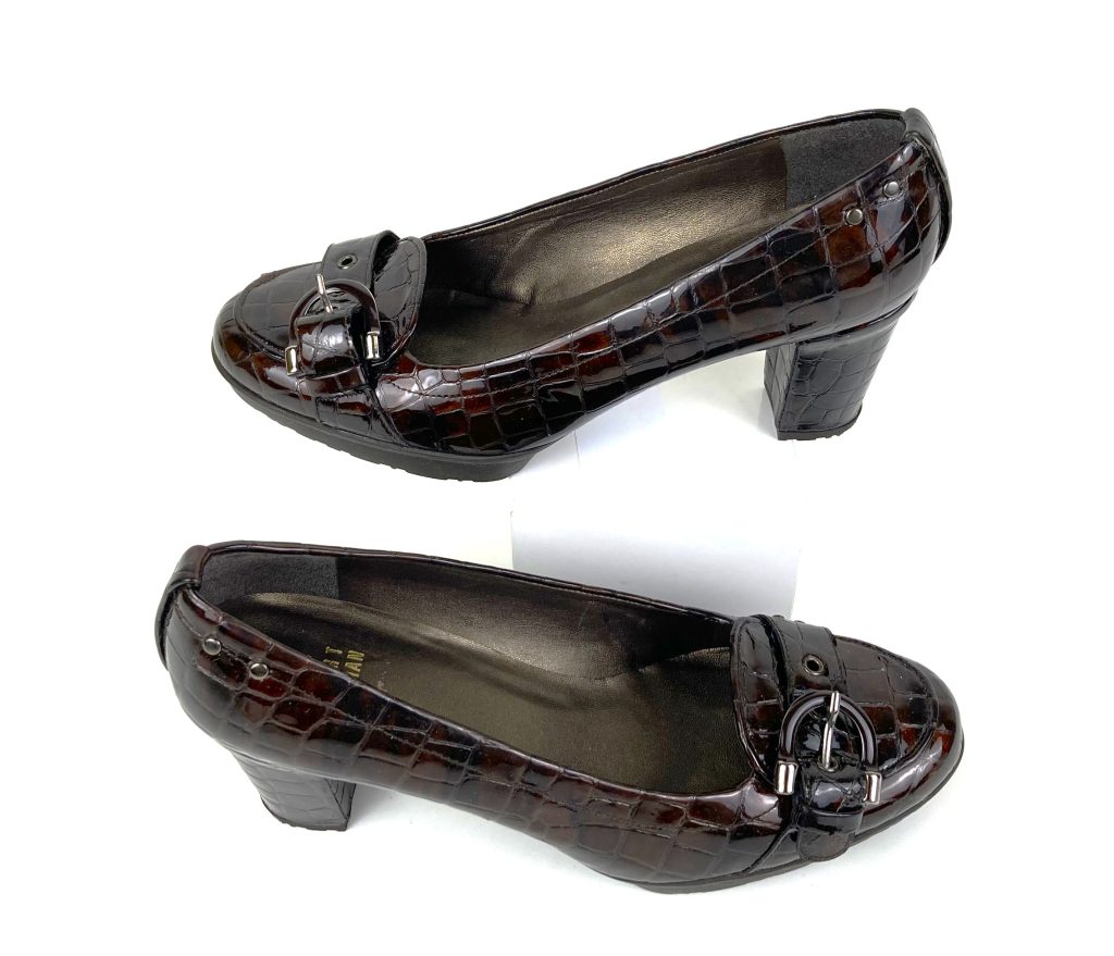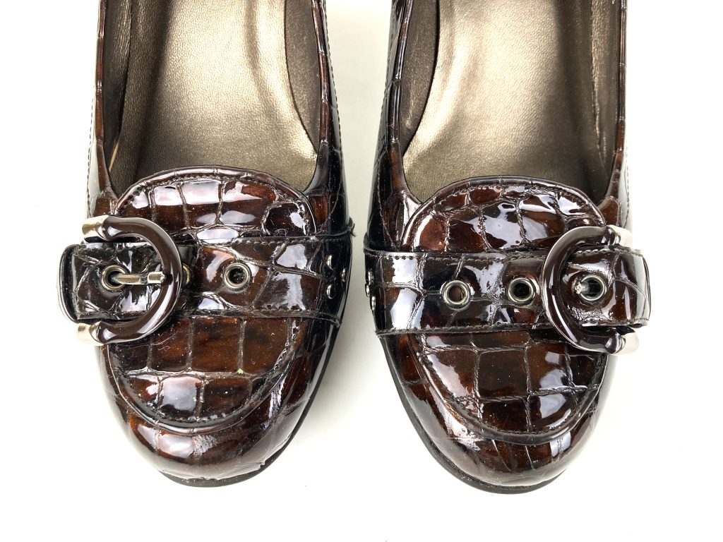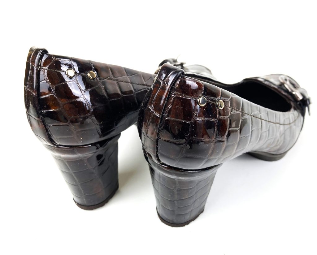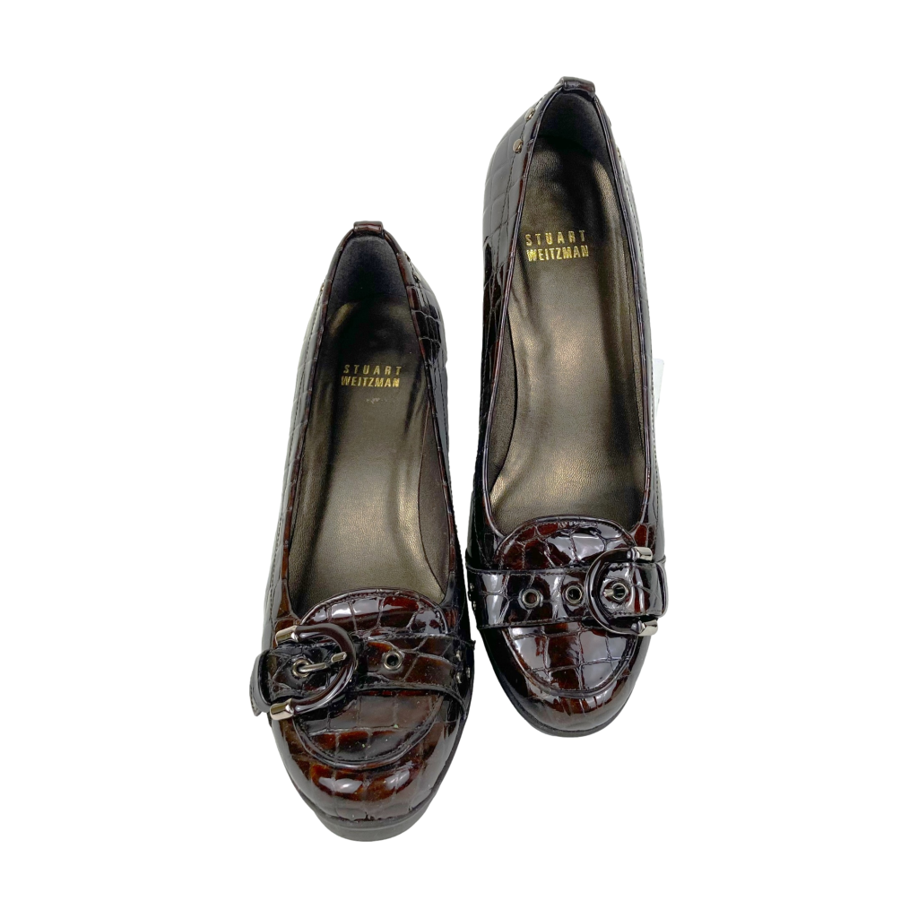 Croco lakleren pumps. Merk: Stuart Weitzman. In diverse bruin tinten. Met plateauzool, hoge hak en decoratief riempje met gesp op de neus.