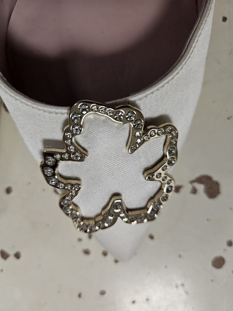 De neus van de schoen is voorzien van een zilverkleurige gesp met kleine “kristalletjes”. Ideaal voor zowel formele gelegenheden als een chique dagelijkse look.