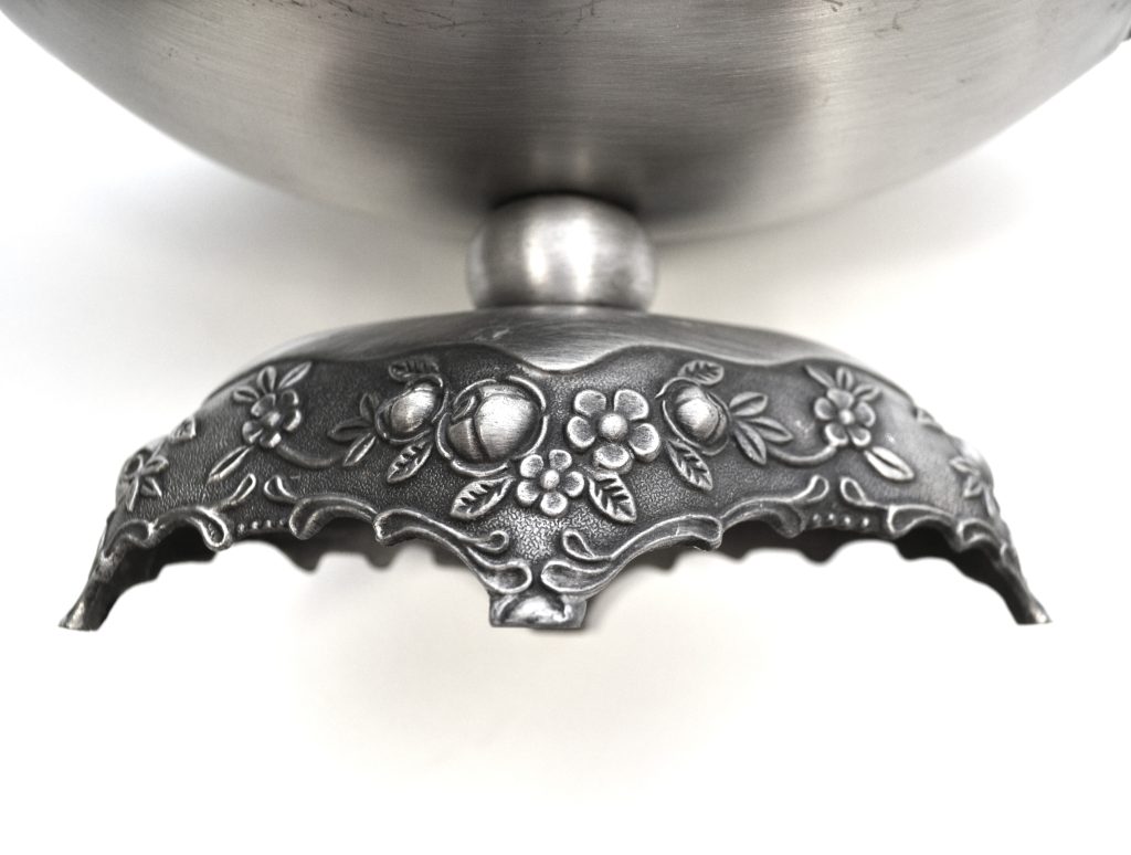 Antieke tinnen fruitschaal met in reliëf een bloemmotief.