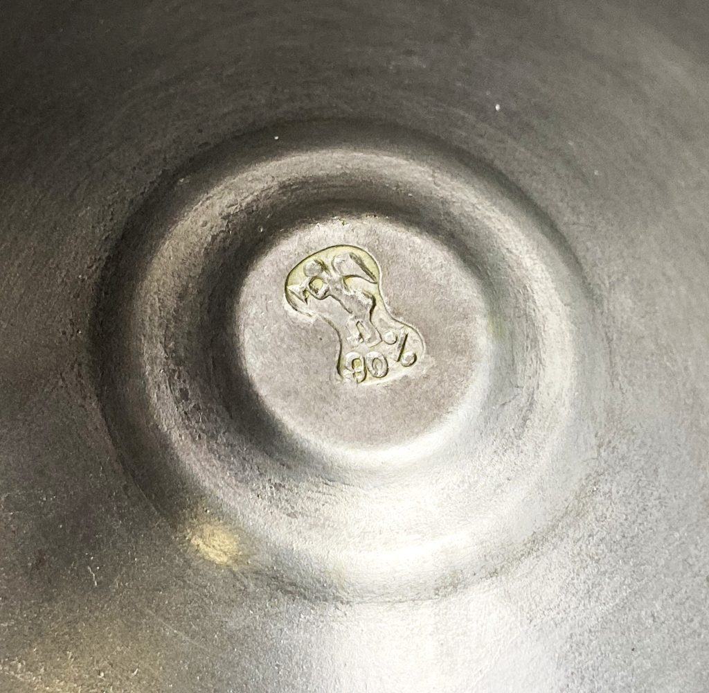 5-Armige oude tinnen kandelaar. Gemerkt aan onderzijde met een Engeltje en 90%. Hoog: 31 cm. In uitstekende staat.