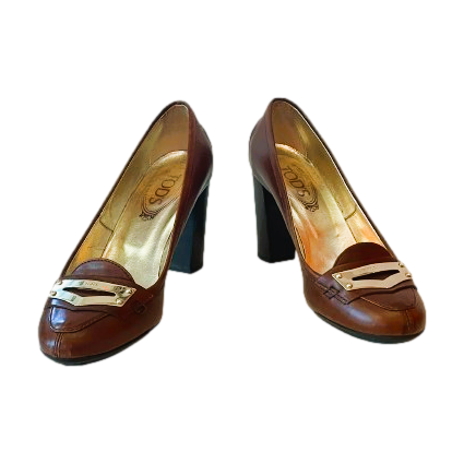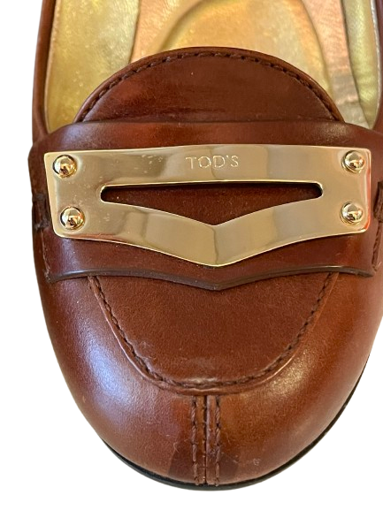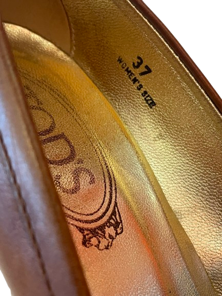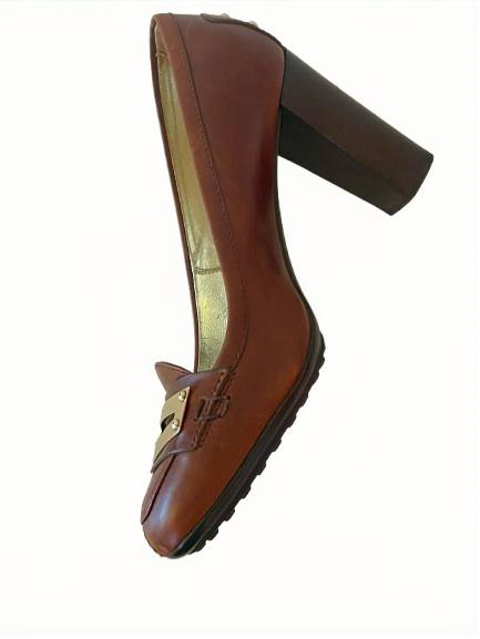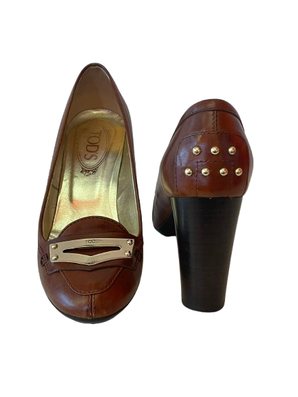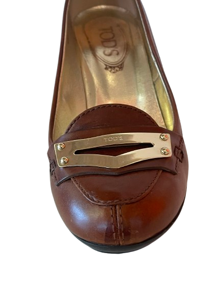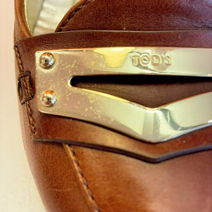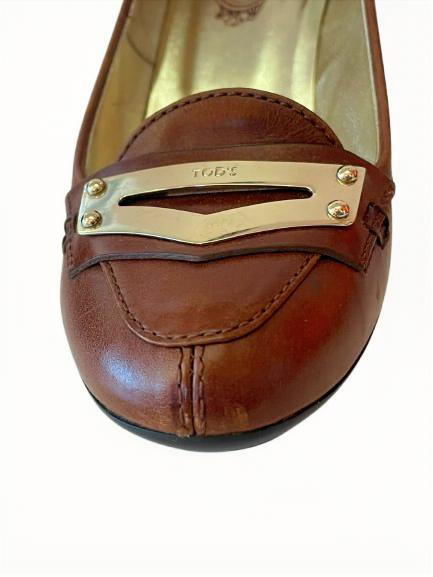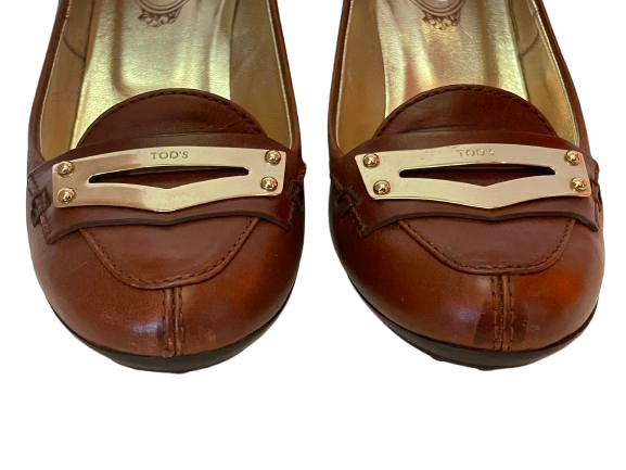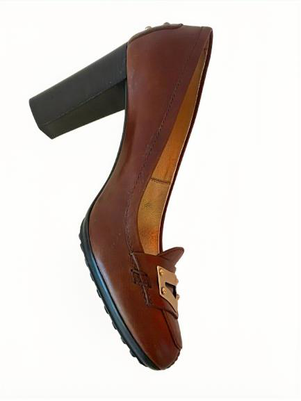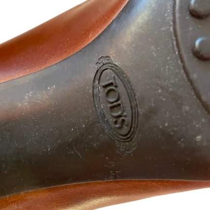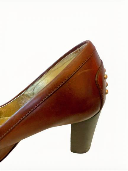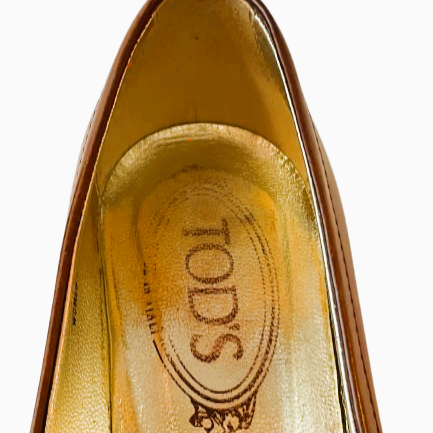 Deze pumps zijn op de hiel versierd met de iconische Tod’s noppen –de Gommini –maar dan in een eigentijdse goudkleurige versie. De Gommini werd al snel hét embleem van Tod’s, trok de aandacht van kenners over de hele wereld en werd een symbool voor vakmanschap.