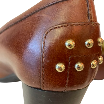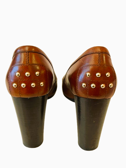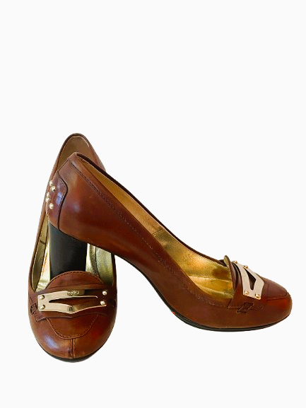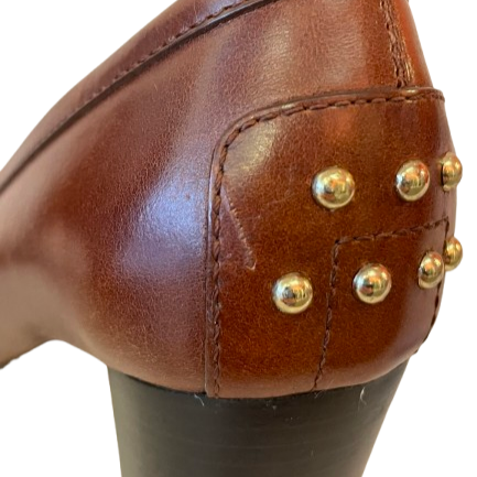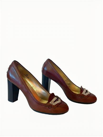 Prachtige leren pumps met 9 cm hoge hak in een mooie burgundy/bruine kleur en goudkleurige metalen accenten.