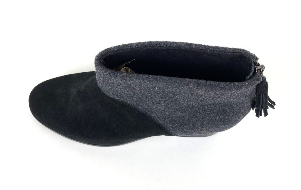 Wijdte: W. In grijze stof met zwart suède. Met klein ritsje met kwastje op de hiel. Kunststof zool.