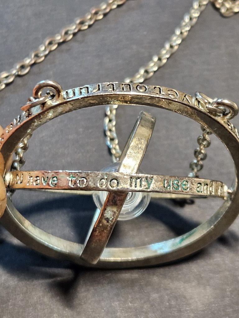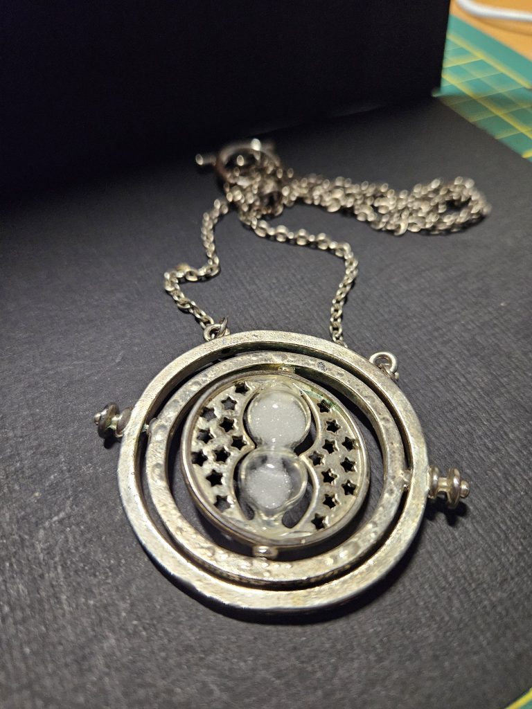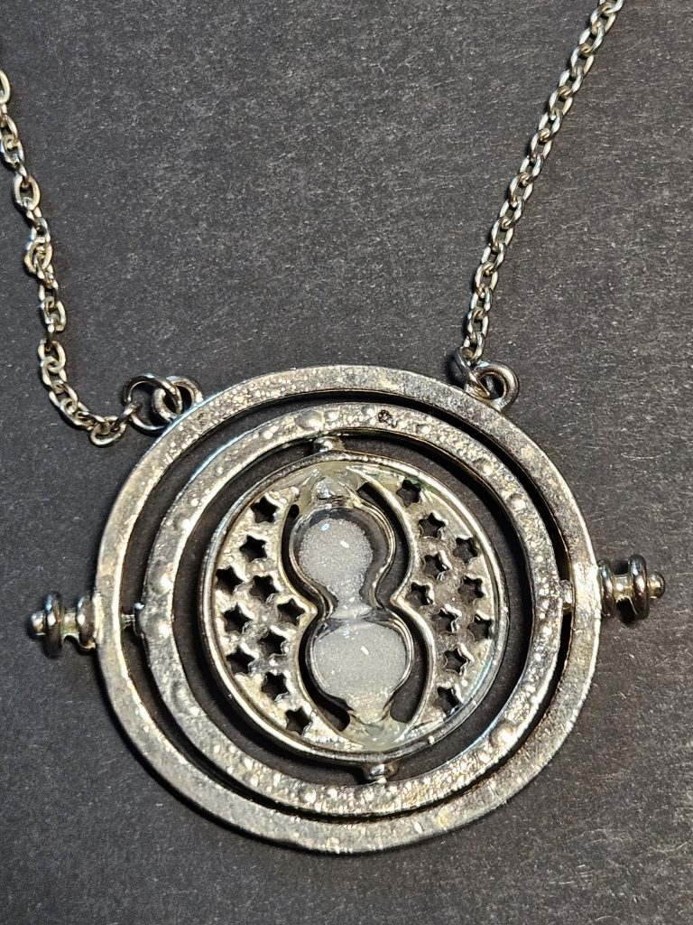De eerste ketting is de tijdverdrijver die Hermelien draagt in de derde Harry Potter film, the Prisoners of Azkaban. De ringen van de tijdverdrijver kunnen draaien. De zandloper is gevuld met wit zand. De tekst op de tijdverdrijver is de tekst uit de film “I mark the hours every one. Nor have I yet outrun the Sun. My use and value, unto you are gauged by what you have to do.”