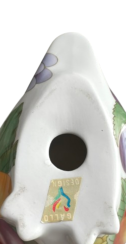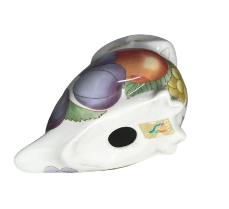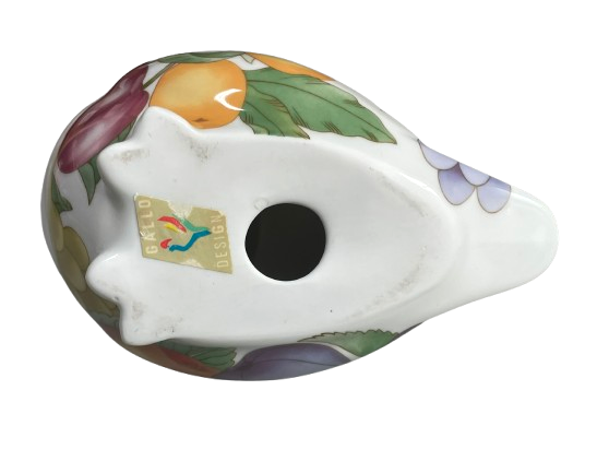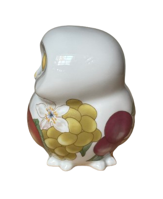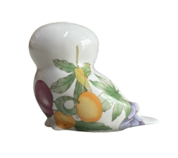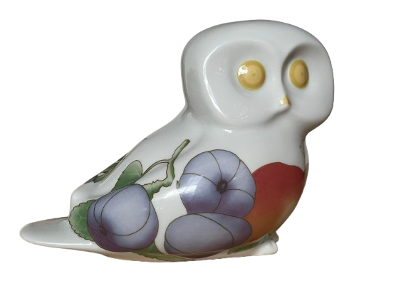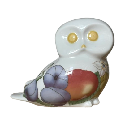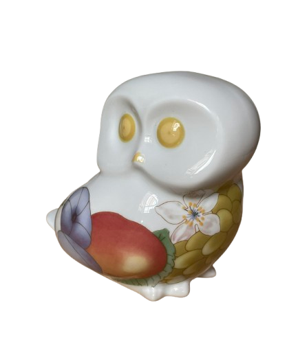 Een vintage geglazuurd porseleinen beeldje van een uil van Villeroy & Boch -Gallo Design. Het witte beeldje is versierd met een veelkleurig fruitpatroon.