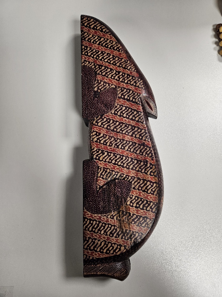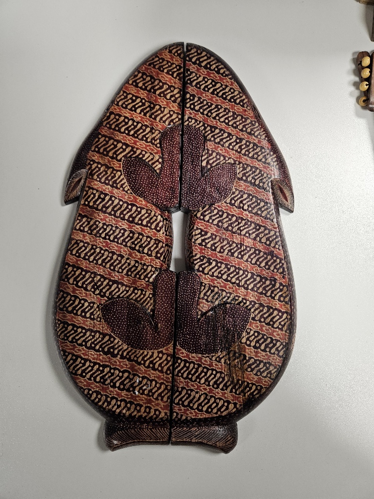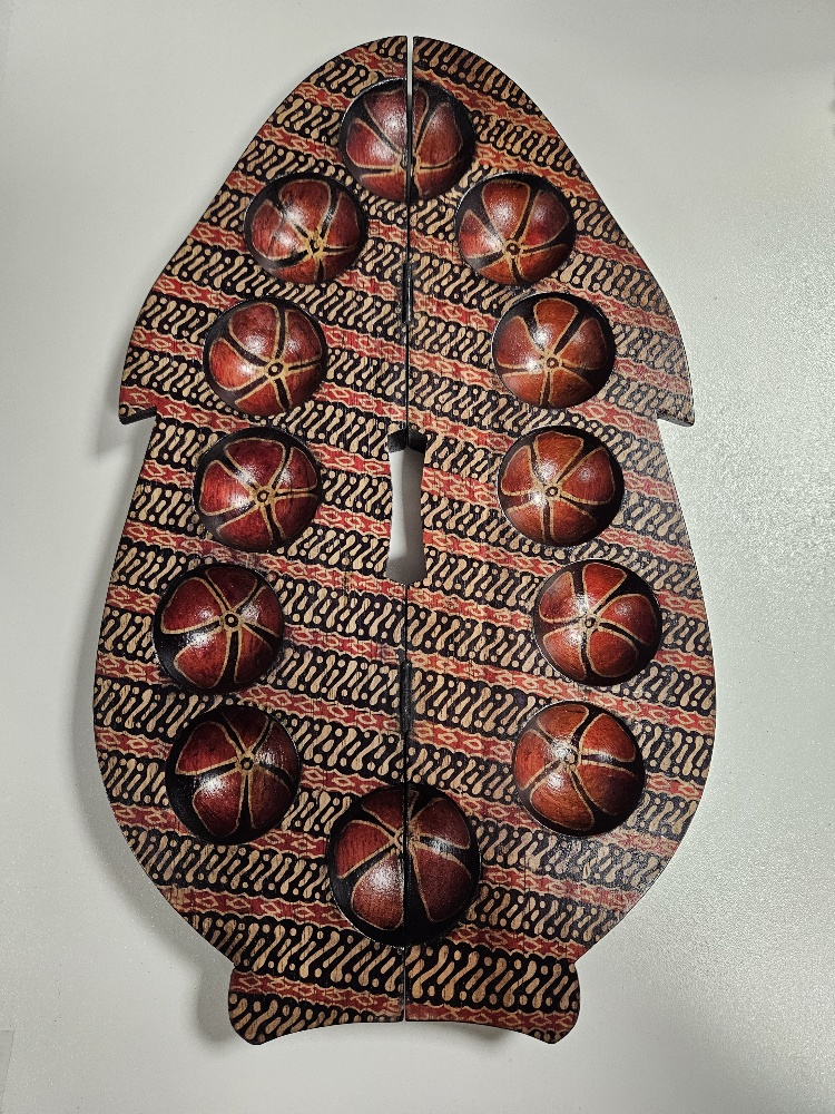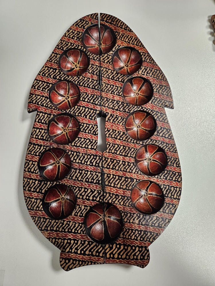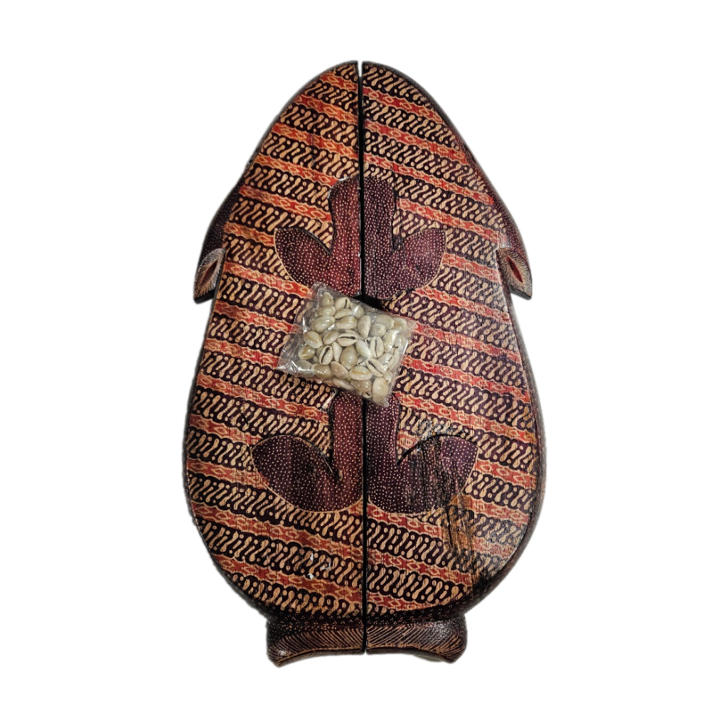 Dit bijzondere Dagon- of schelpenspel is een prachtig stukje cultureel erfgoed uit Oost-Java. Het spel wordt gespeeld met echte schelpjes en is rijk versierd met traditionele afbeeldingen, die elk hun eigen verhaal en symboliek dragen. Geen standaard spel, maar een authentiek object met geschiedenis en karakter.
