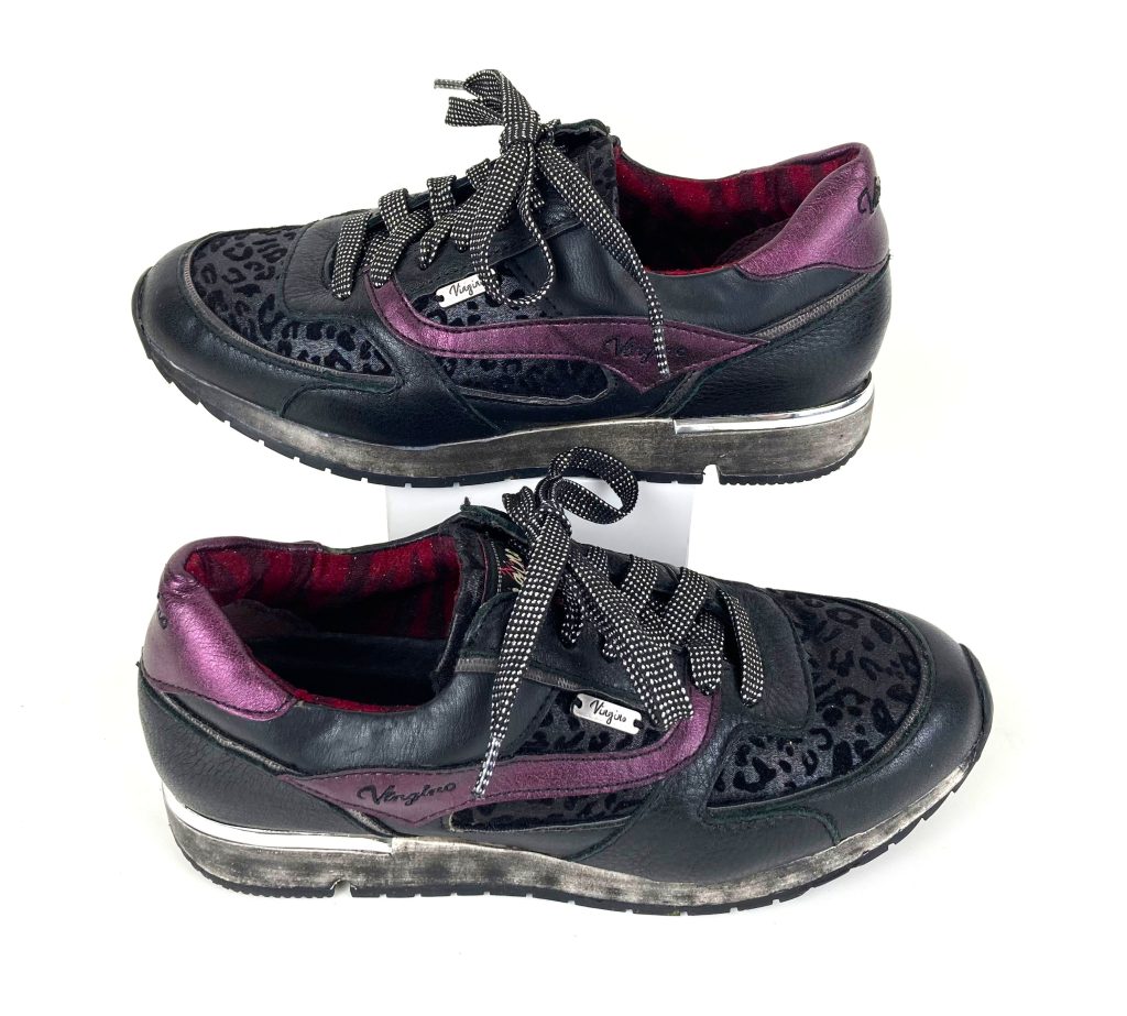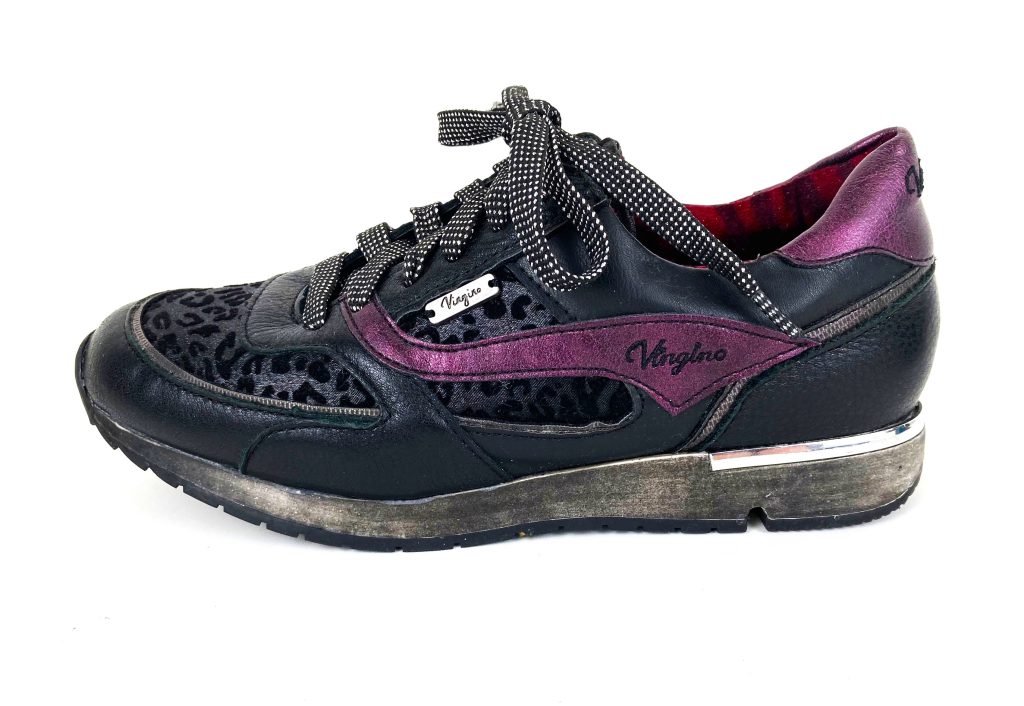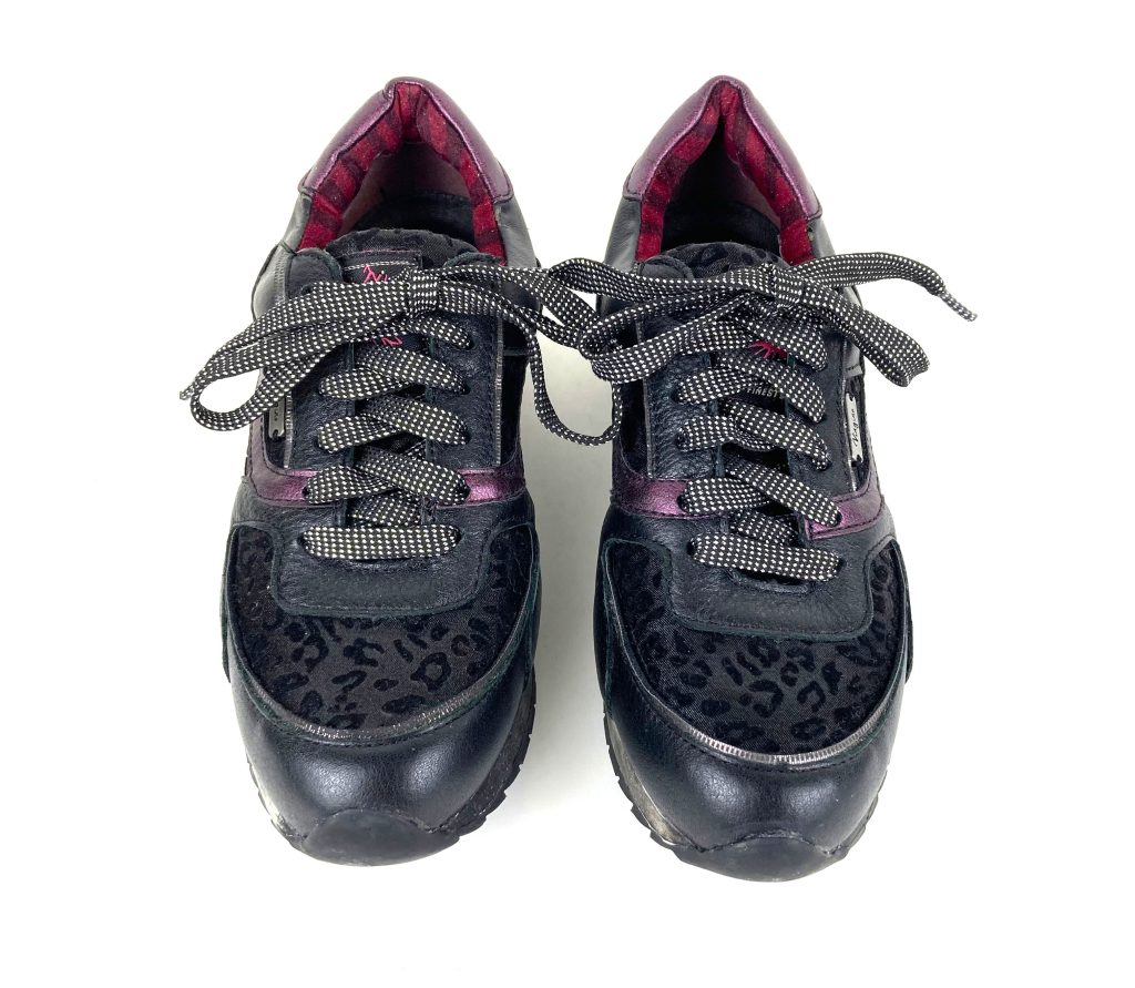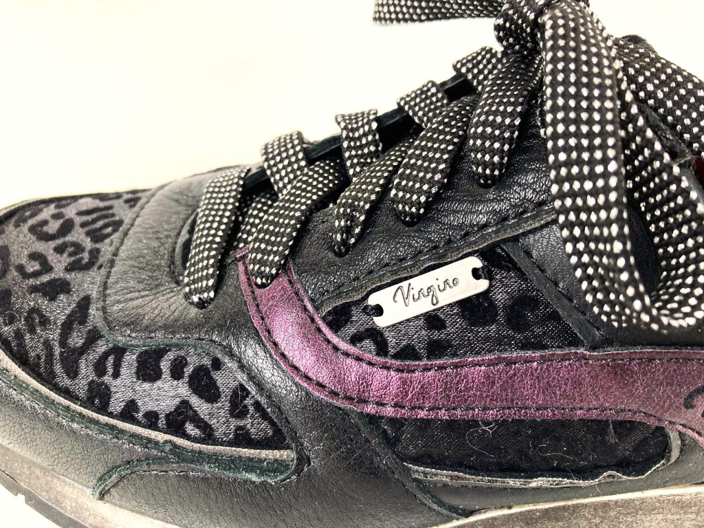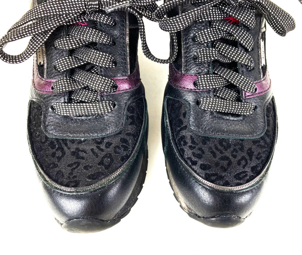 In zwart leer met stoffen panterprint. Aubergine kleurige streep en goud metalen rand langs de hak. Veter met zilveren glitter. Uitneembare binnenzool. Kunststof zool.