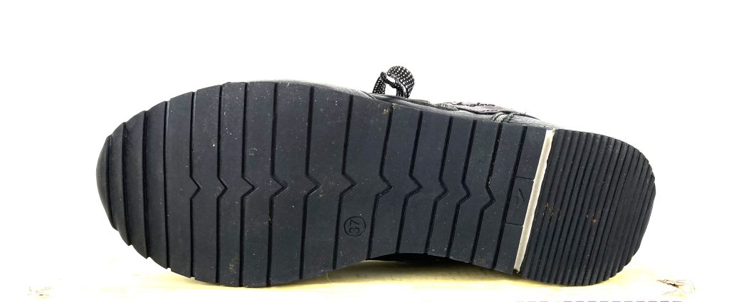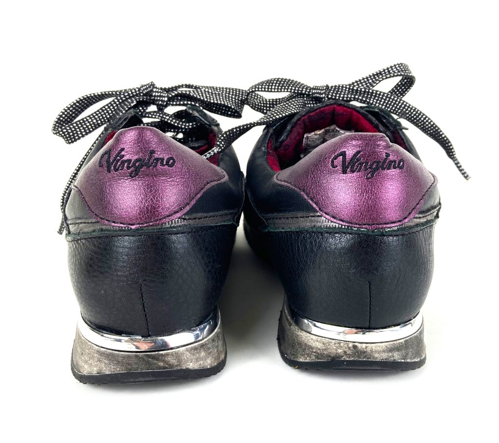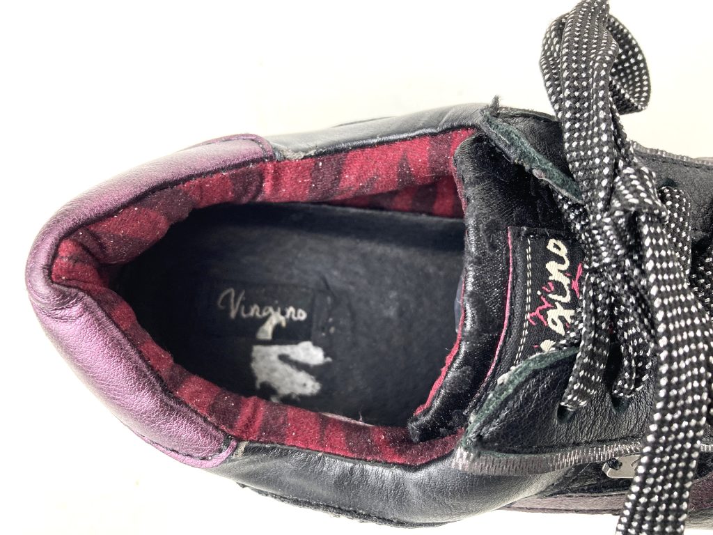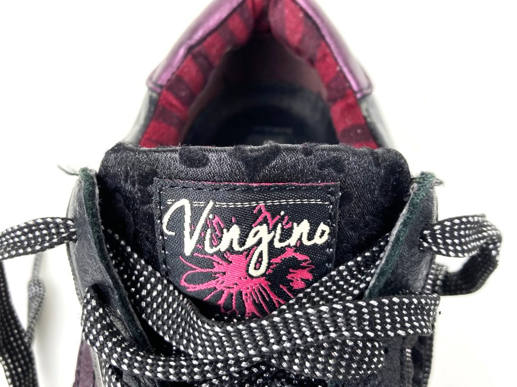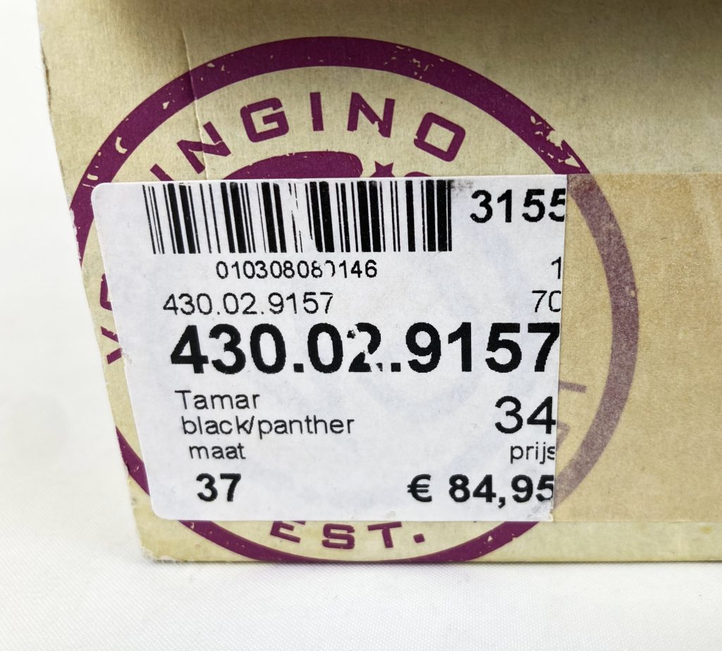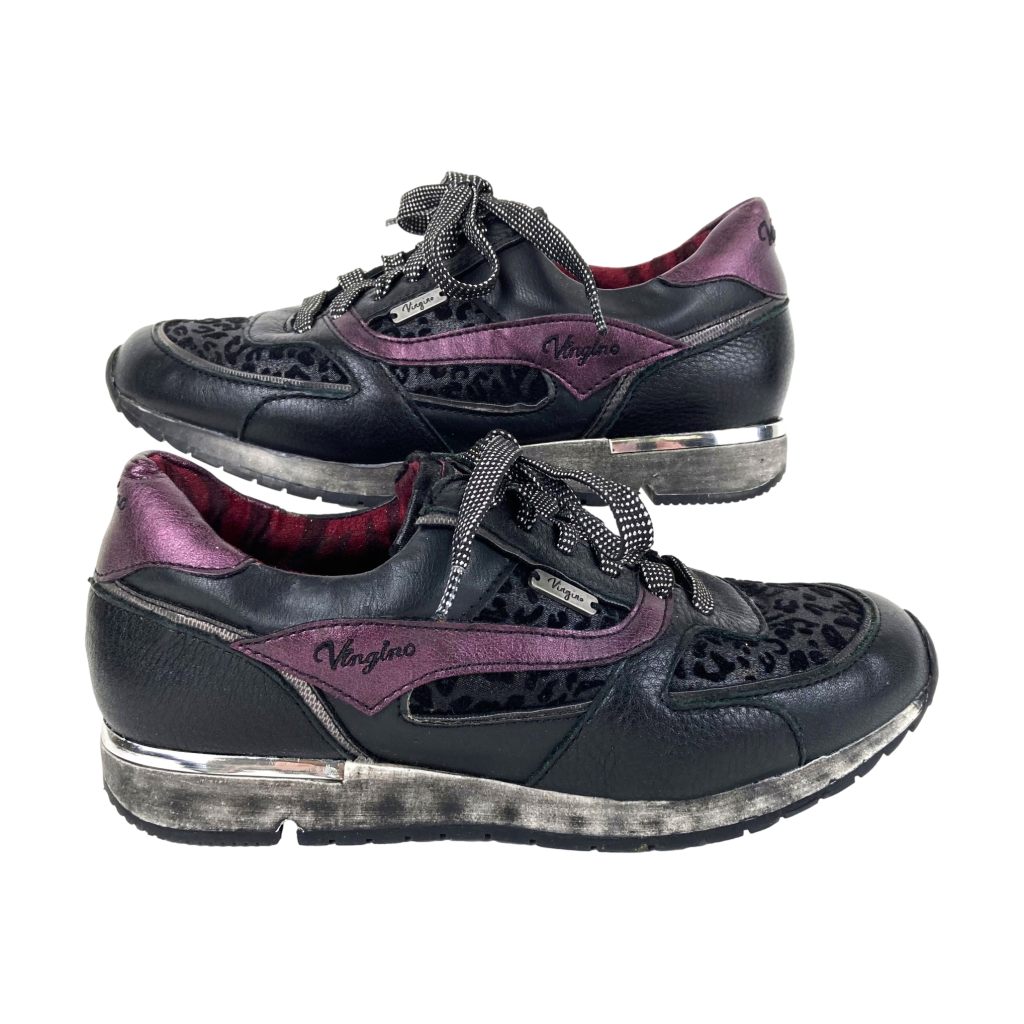In zwart leer met stoffen panterprint. Aubergine kleurige streep en goud metalen rand langs de hak. Veter met zilveren glitter. Uitneembare binnenzool. Kunststof zool.