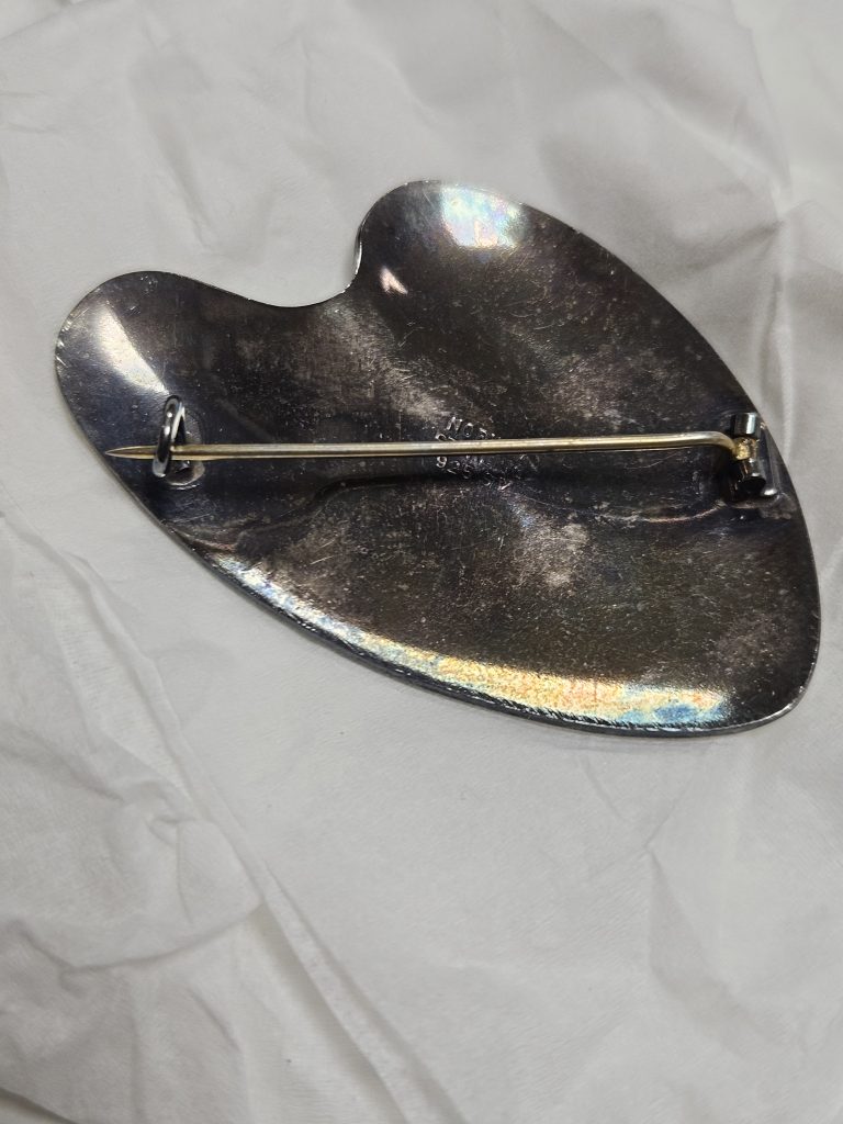 Finn Jensen was een Noorse goud‑ en zilversmid die actief was vanaf de jaren 1940. Hij richtte samen met een partner een bedrijf op onder de naam Jensen and Aamodt. Hij ontwierp onder meer abstracte en natuur-geïnspireerde guilloché-email sieraden—een verfijnde techniek waarbij kleurig email in dunne, gesneden zilveren patronen wordt aangebracht Zijn sieraden zijn gemerkt met een “FJ” logo in de vorm van een klein driehoekje, wat later herkenbaar werd als zijn handelsmerk. Finn Jensen overleed in 1976, maar zijn bedrijf bleef sieraden produceren onder dezelfde naam. Broche is aan de achterkant gemerkt met Norway Sterling 925S en Finn Jensen merkteken. Broche is ca. 5 x 3 cm