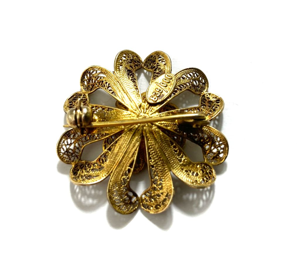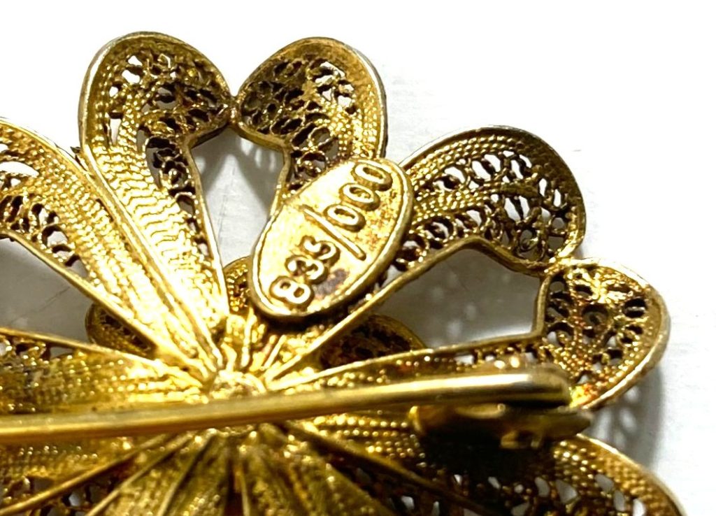 Vintage zilver vergulde filigrain broche in de vorm van een bloem.