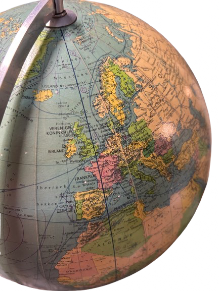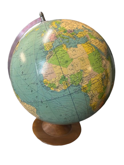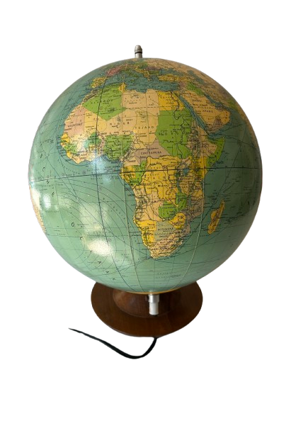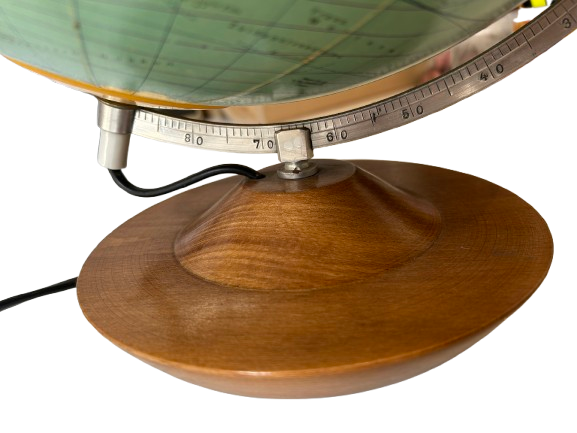 Staatkundige wereldbol uit de jaren 80 met lamp. De globe is gevat in een aluminium gradenboog en staat op een houten voet. De bol kan worden verlicht met een intern lampje, verbonden met een snoer met schakelaar. Nederlandstalig.