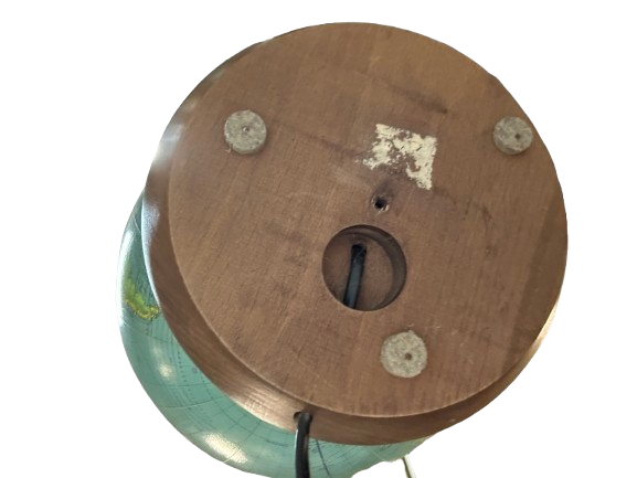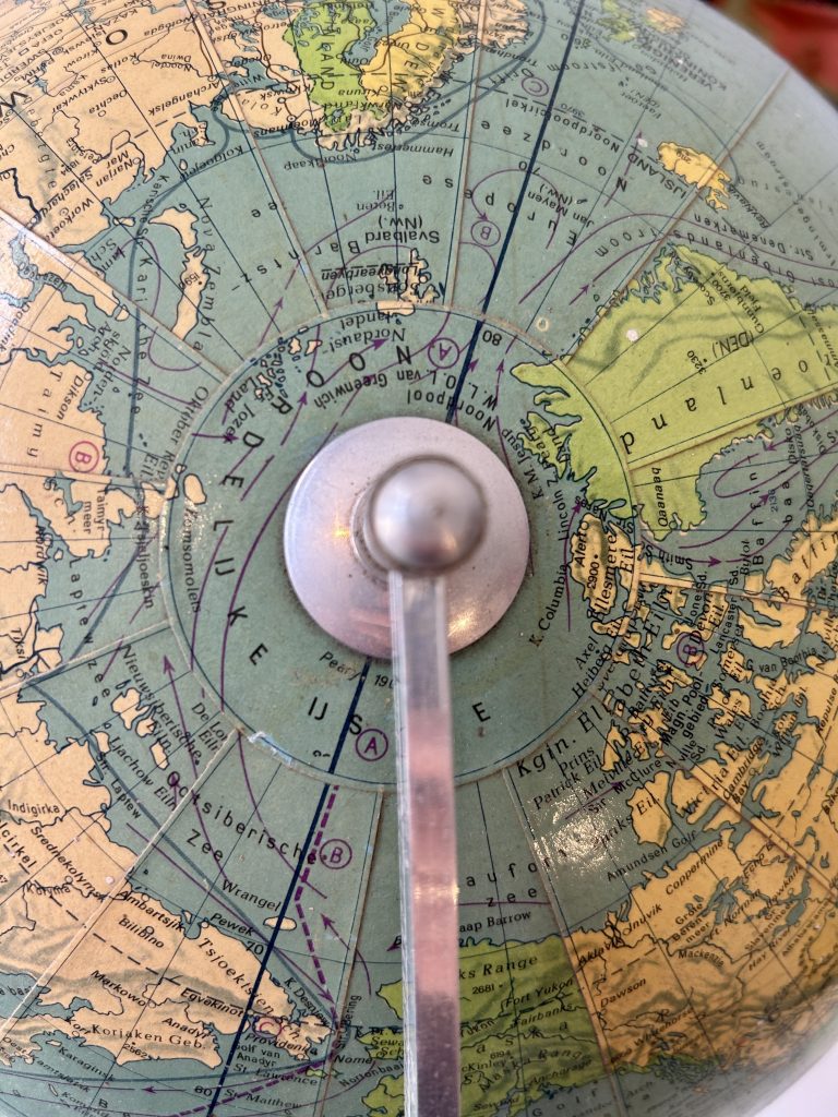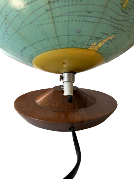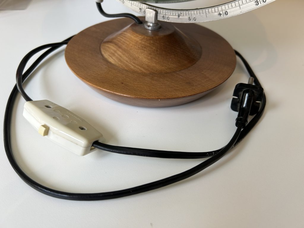 Wereldbol uit de jaren 80 met lamp. De globe is gevat in een aluminium gradenboog en staat op een houten voet. De bol kan worden verlicht met een intern lampje, verbonden met een snoer met schakelaar.