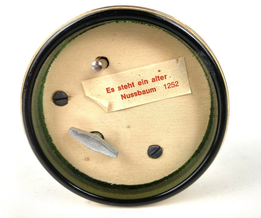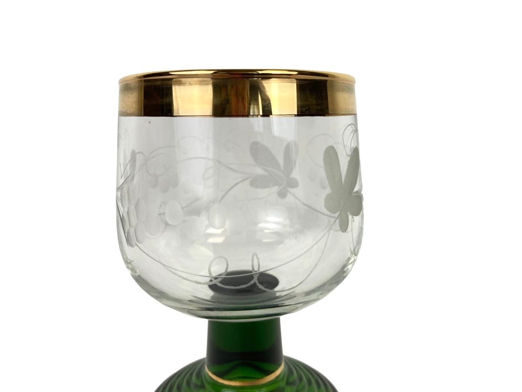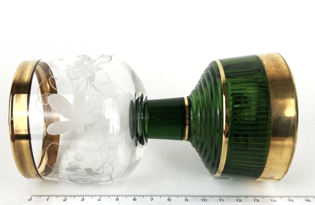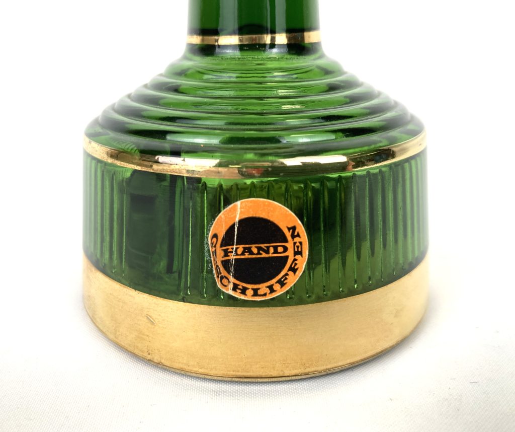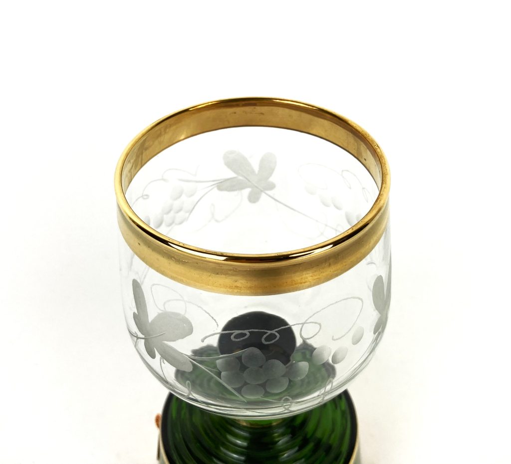 Wijnglas met jaren 60-muziek, met gouden rand op smaragdgroene sokkel. Het glas is handgeslepen met druiventrossen. Vermoedelijk afkomstig uit Duitsland. Genummerd: 1252. Na het opwinden hoor je de melodie “Es steht ein alter Nussbaum”. Totale hoogte: ca. 14 cm. Iets slijtage aan de gouden randen maar in uitstekende staat.
