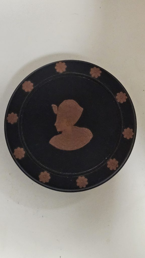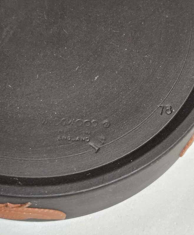 Vintage Wedgwood snuisterijendoosje uit 1978 in elegante Egyptian Revival-stijl. Het dooosje is uitgevoerd in zwart basalt. Het deksel heeft een terracottakleurig profiel van Farao Toetanchamon, omlijst door gestileerde bloemmotieven, terwijl de basis is versierd met een gevleugelde scarabee,De combinatie van klassieke Wedgwood-kwaliteit en exotische Egyptische invloeden maakt dit een bijzonder verzamelobject. Gemerkt aan de onderzijde met “Wedgwood England 1978”. Ideaal voor het bewaren van sieraden of als decoratief accent in een stijlvol interieur. In mooie vintage staat met lichte gebruikssporen passend bij de leeftijd. Het doosje heeft een diameter van ca. 10 cm en een hoogte van ca. 3 cm.