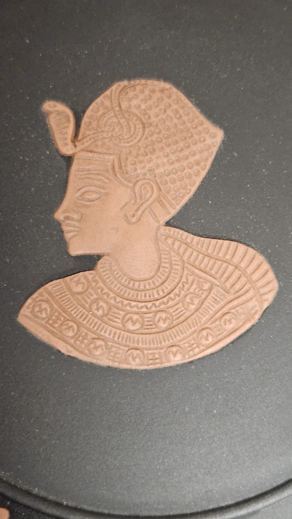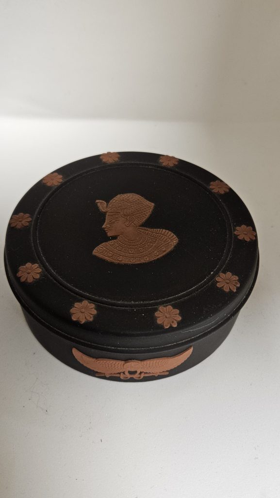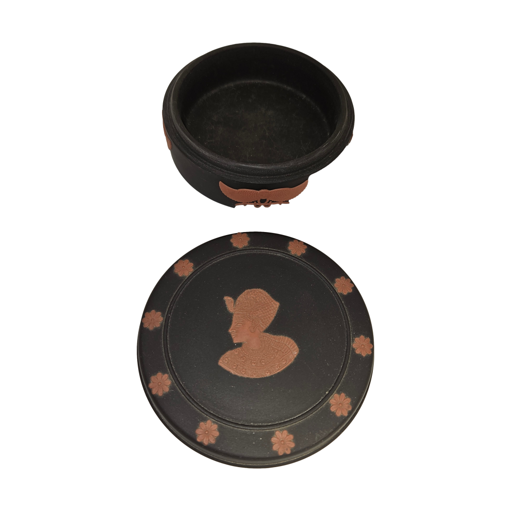 Mooi vintage sieradendoosje van Wedgwood uit 1978, uitgevoerd in zwart basalt. Het deksel is versierd met een reliëf van Toetanchamon in Egyptian Revival-stijl.