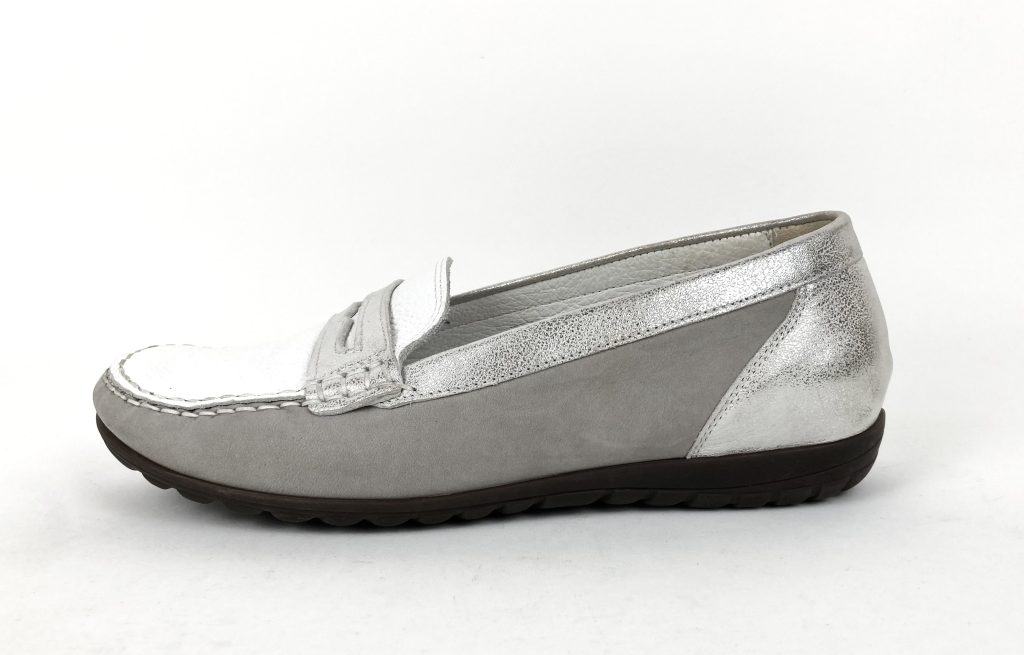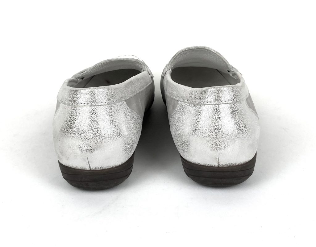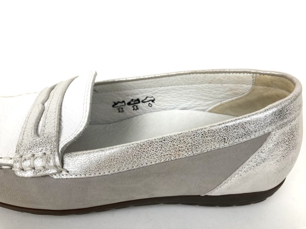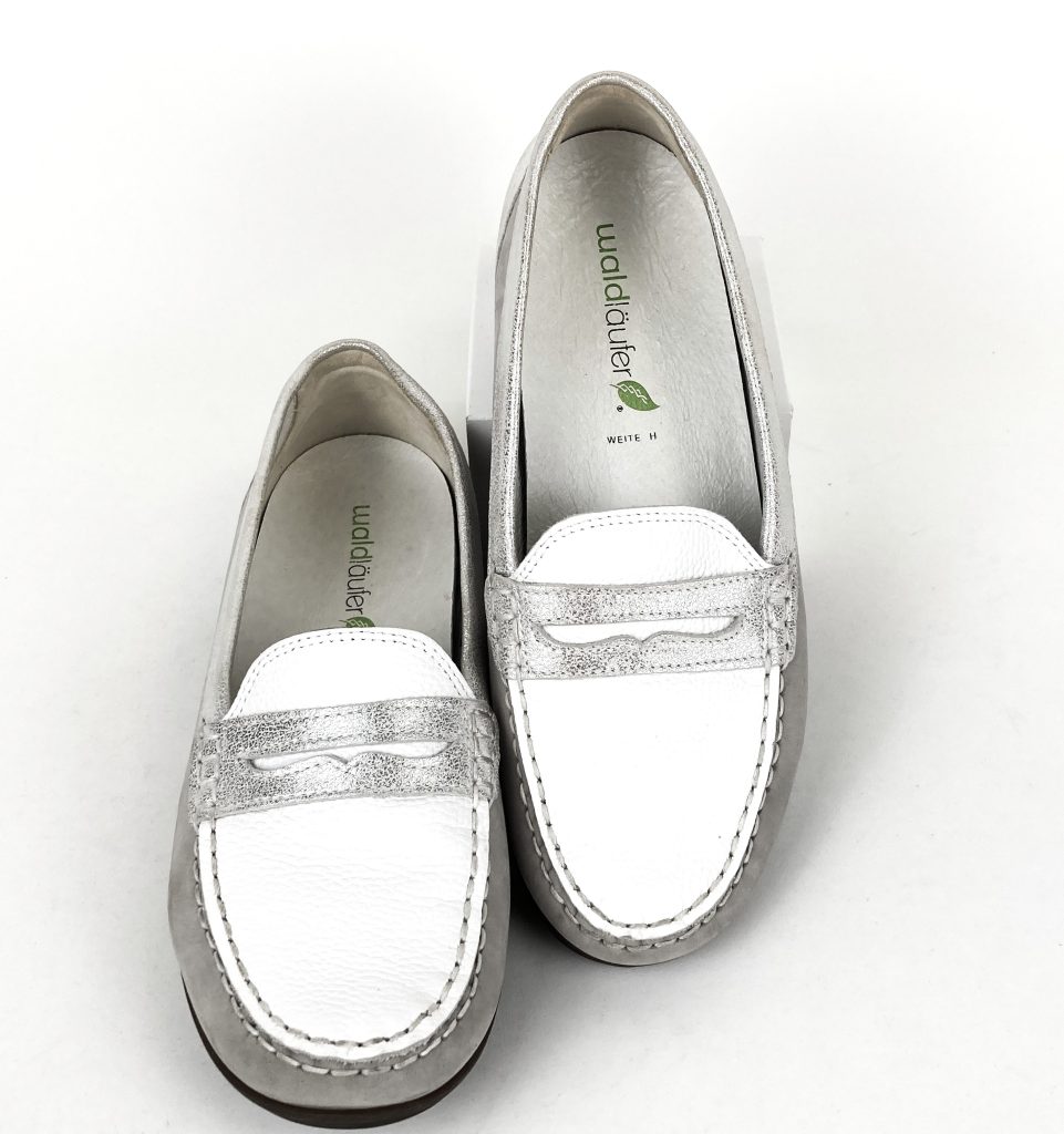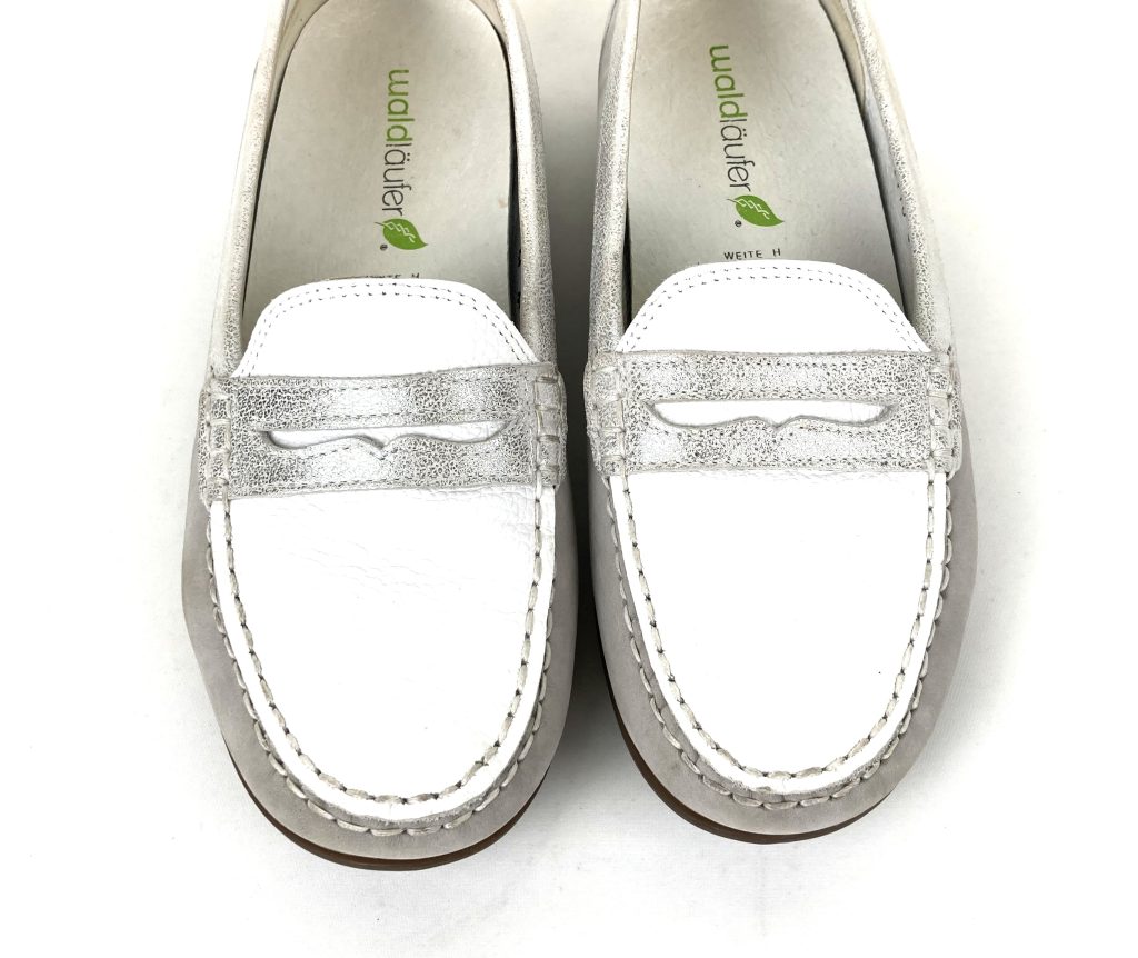 Nieuwe dames mocassins van Waldläufer. Maat 37,5 H (=4,5). Kleur: wit met zilver. Met uitneembare binnenzool. Materiaal: binnen en buiten leer. Zool: kunststof.