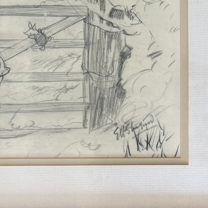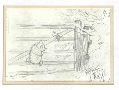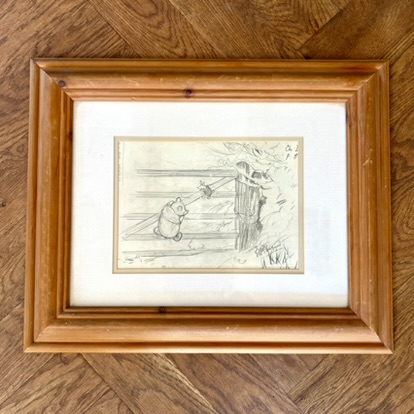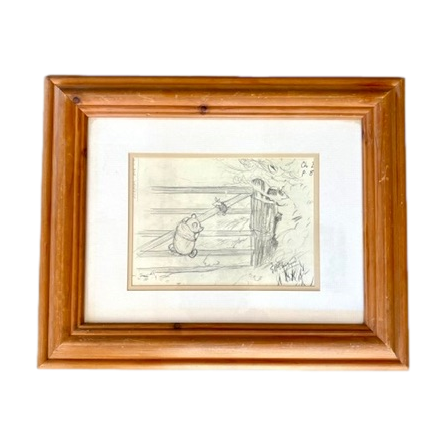 Prachtige print van potloodtekening van A.A. Milne in robuste houten lijst.