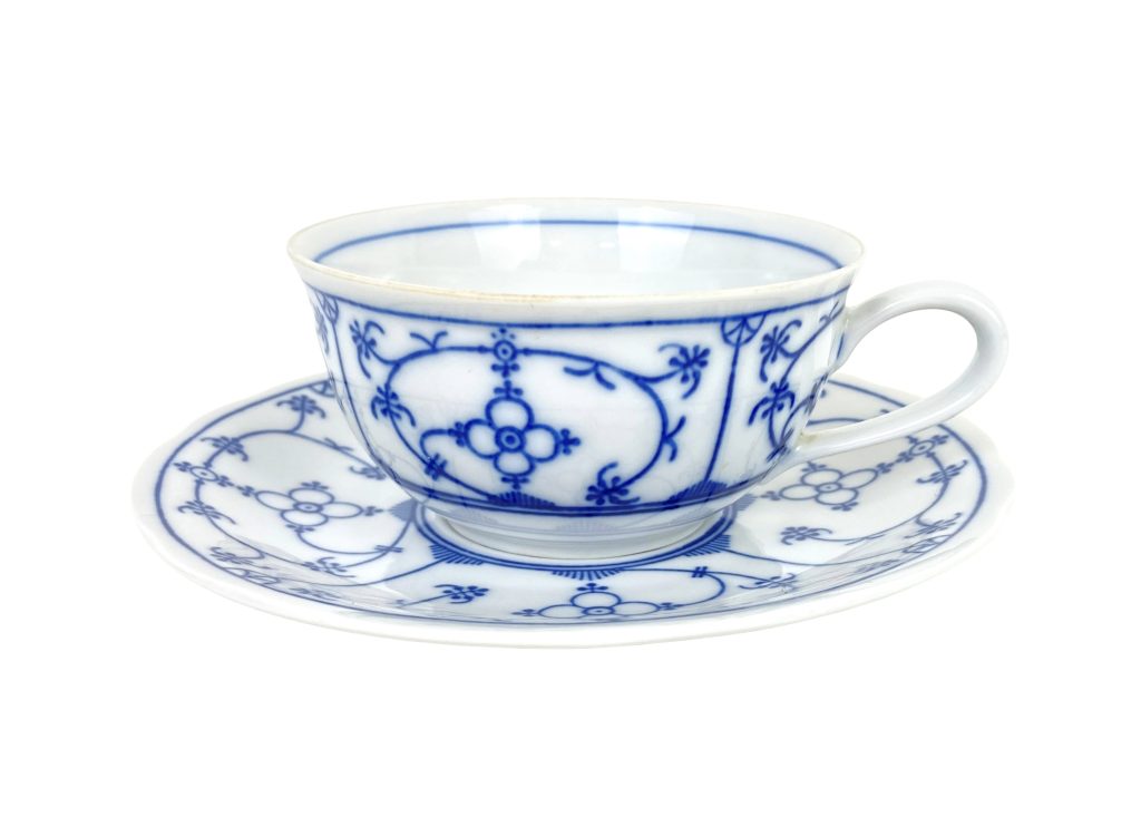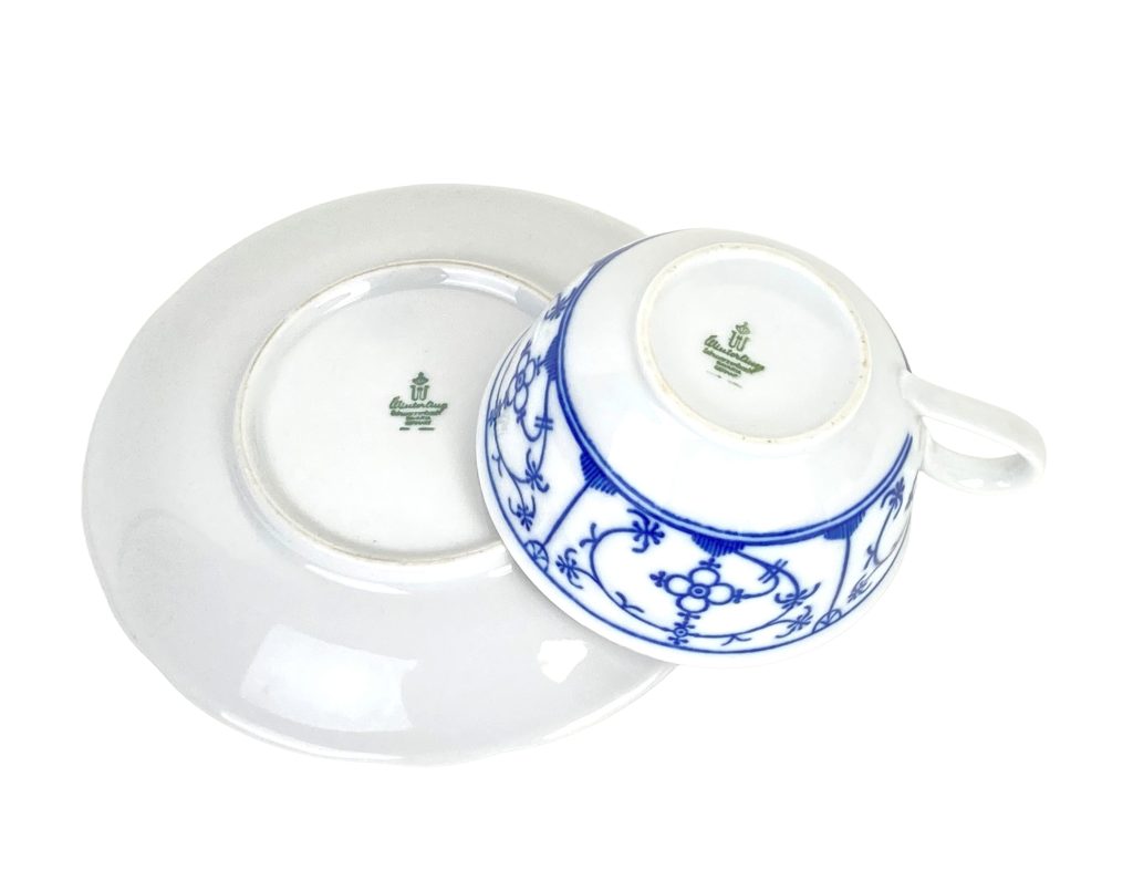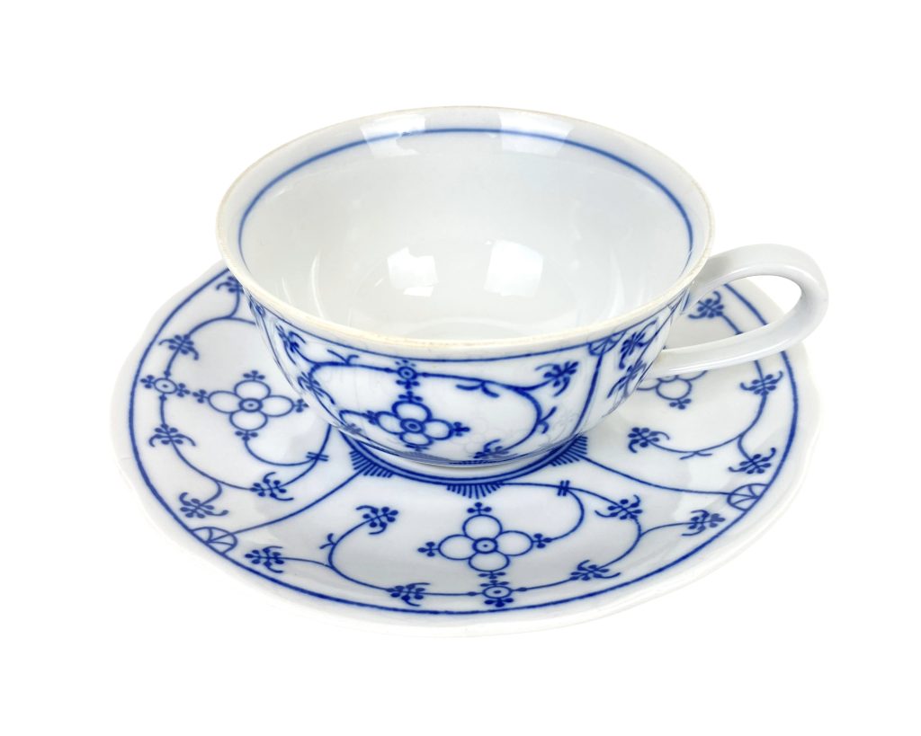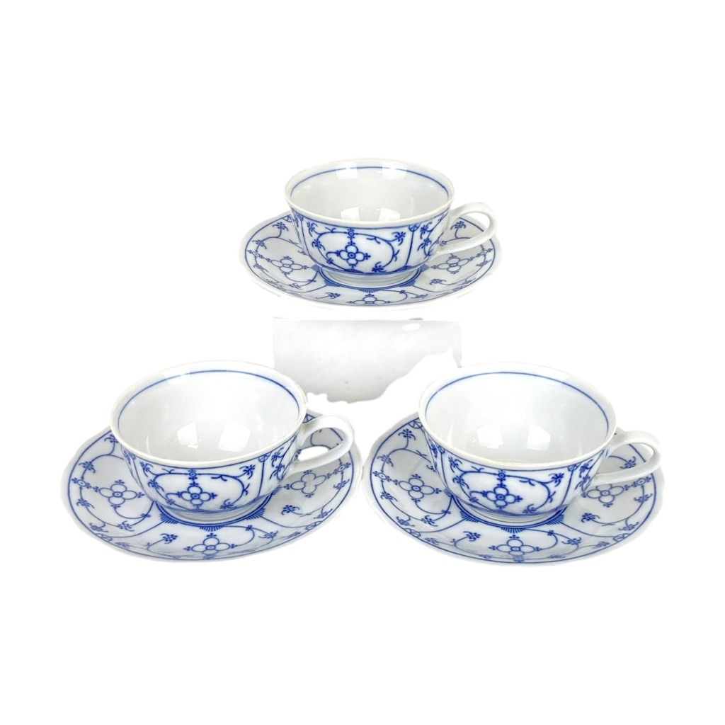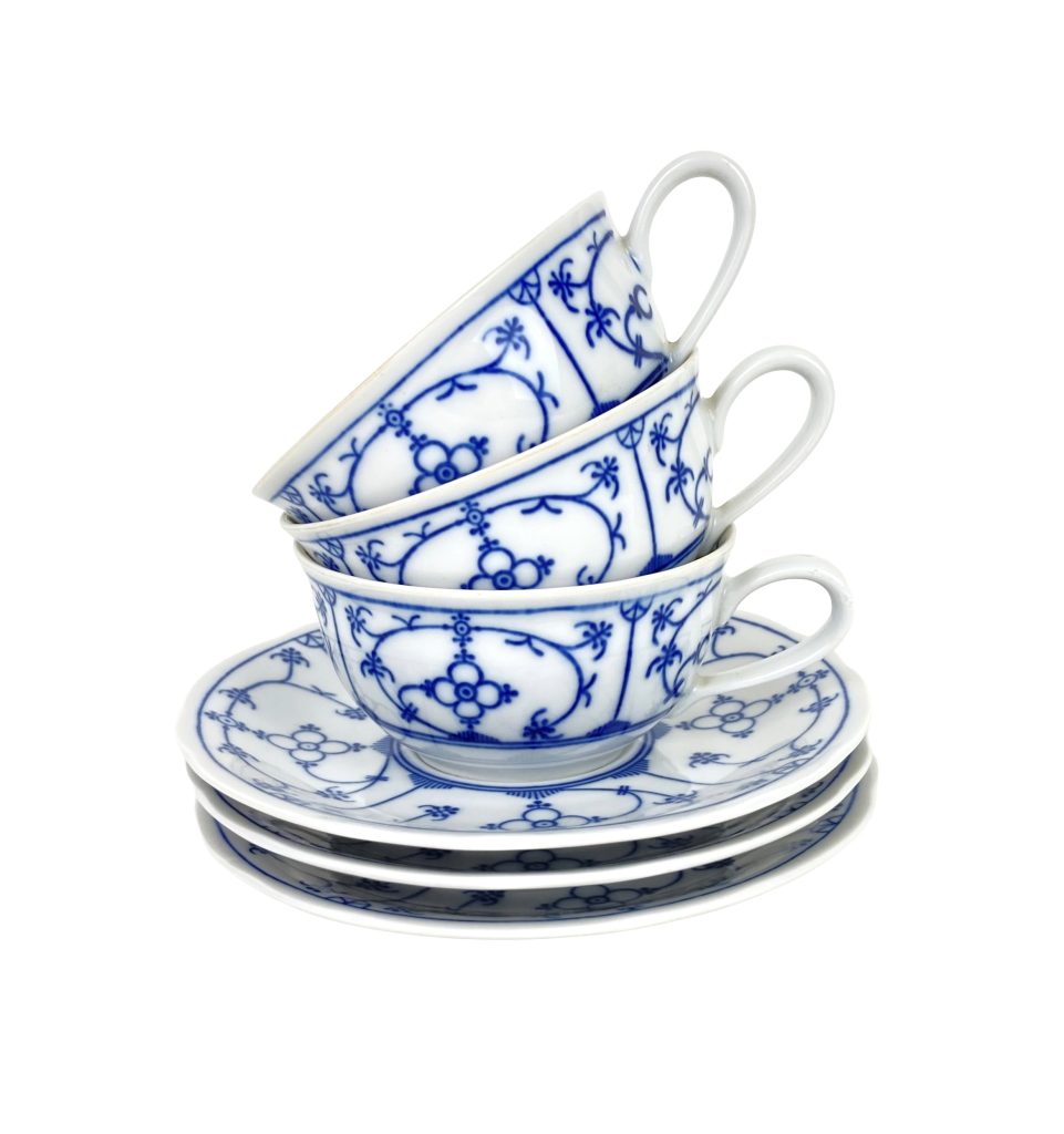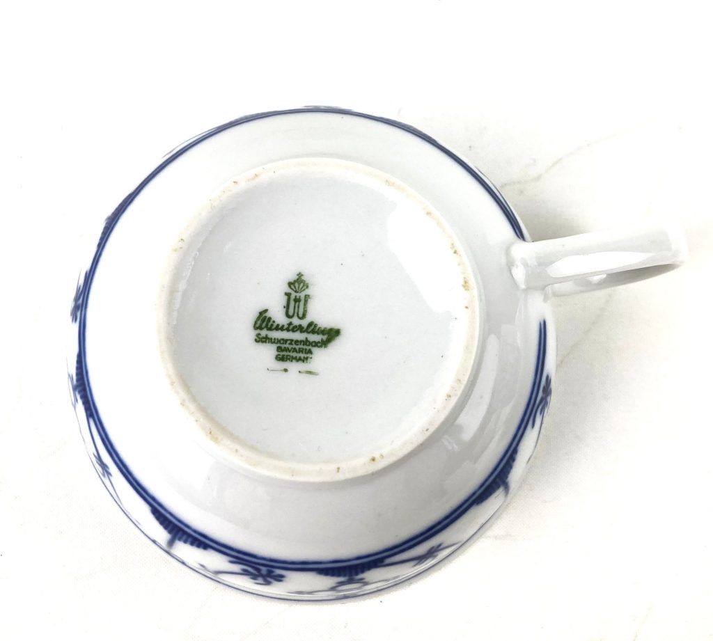 3 Porseleinen thee kop- en schotels van Winterling. Décor Blau Saks. Met schulprand. Afmeting: Kopje: diameter 9,5 cm, hoog: 5 cm. Schotel: diameter 15 cm. In uitstekende staat.