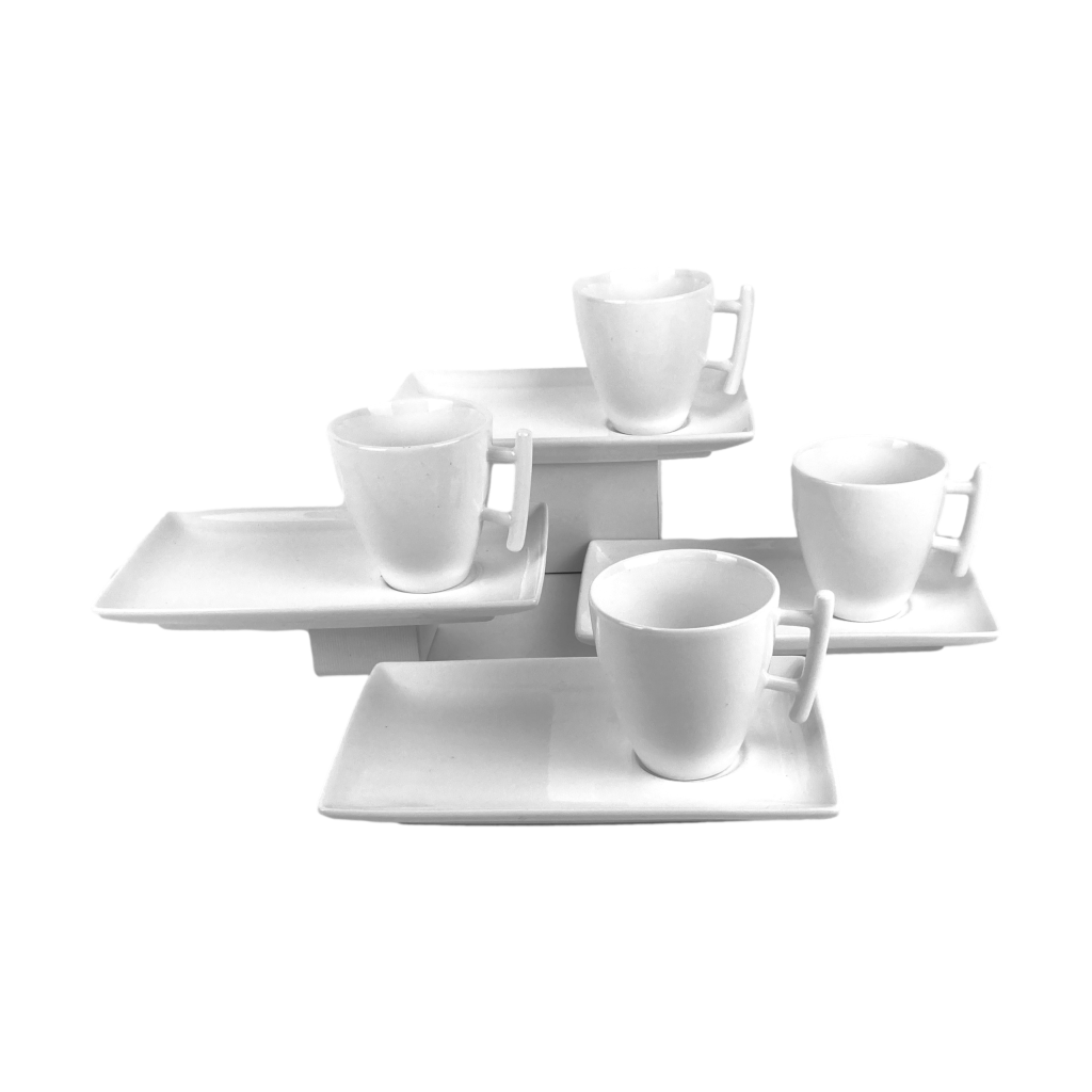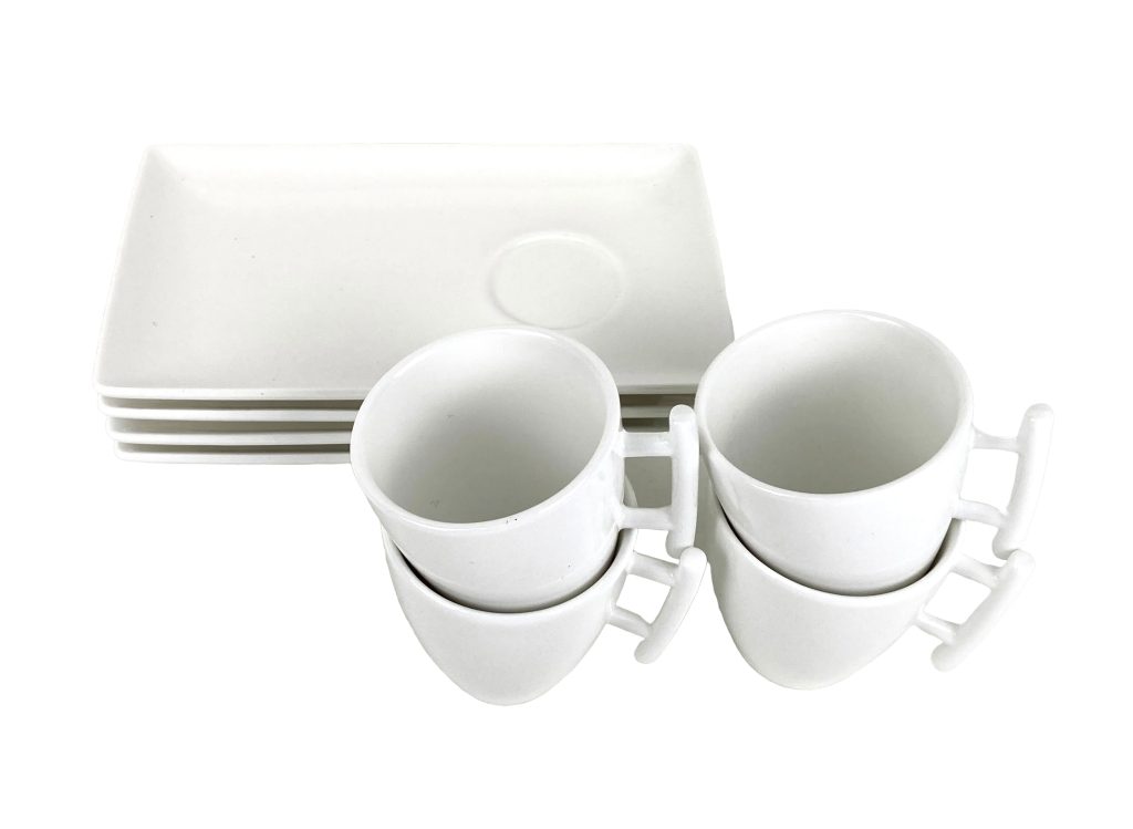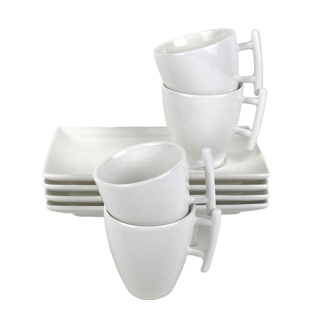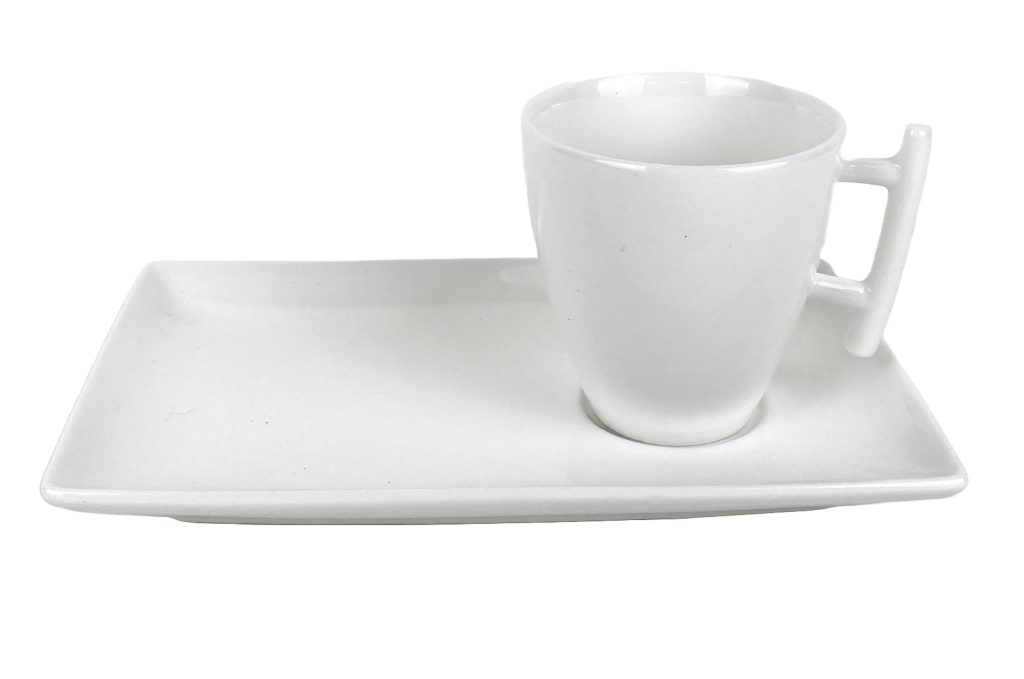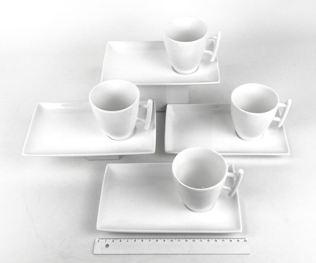 Witte porseleinen kop- en schotels van Yong (Bon Bistro). Lijn: Squito.