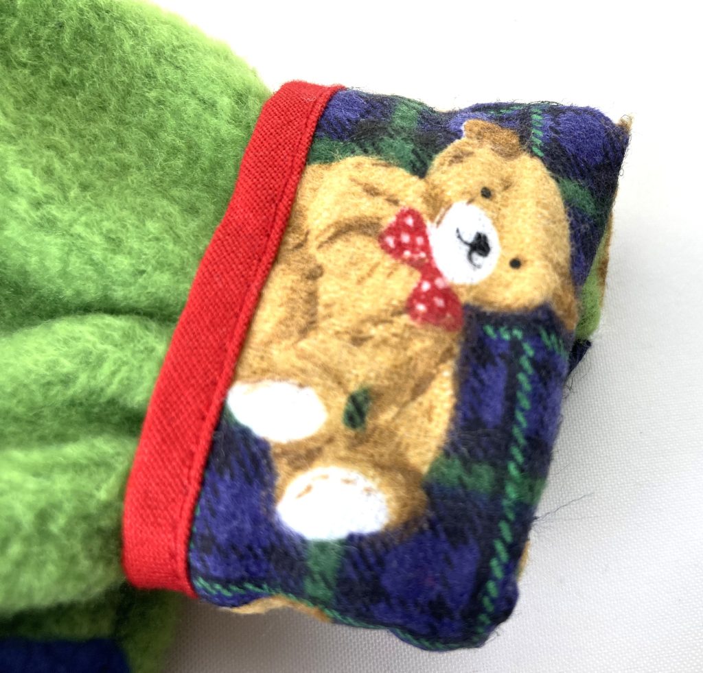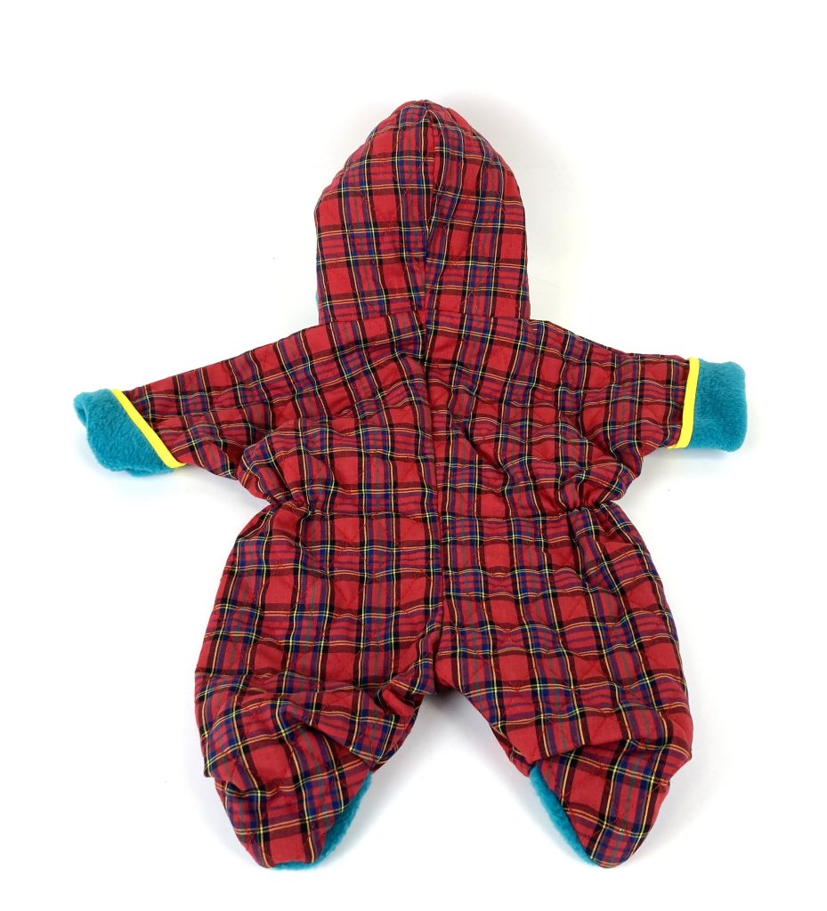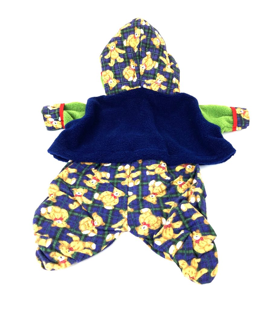 Bestaande uit: een rood geruit skipak met groen fleece; een groen met blauw geruit skipak met geel fleece en groen met blauw fleece jasje met beren broekje.
