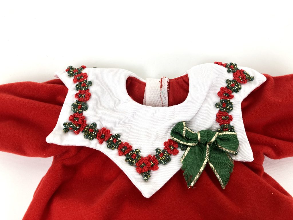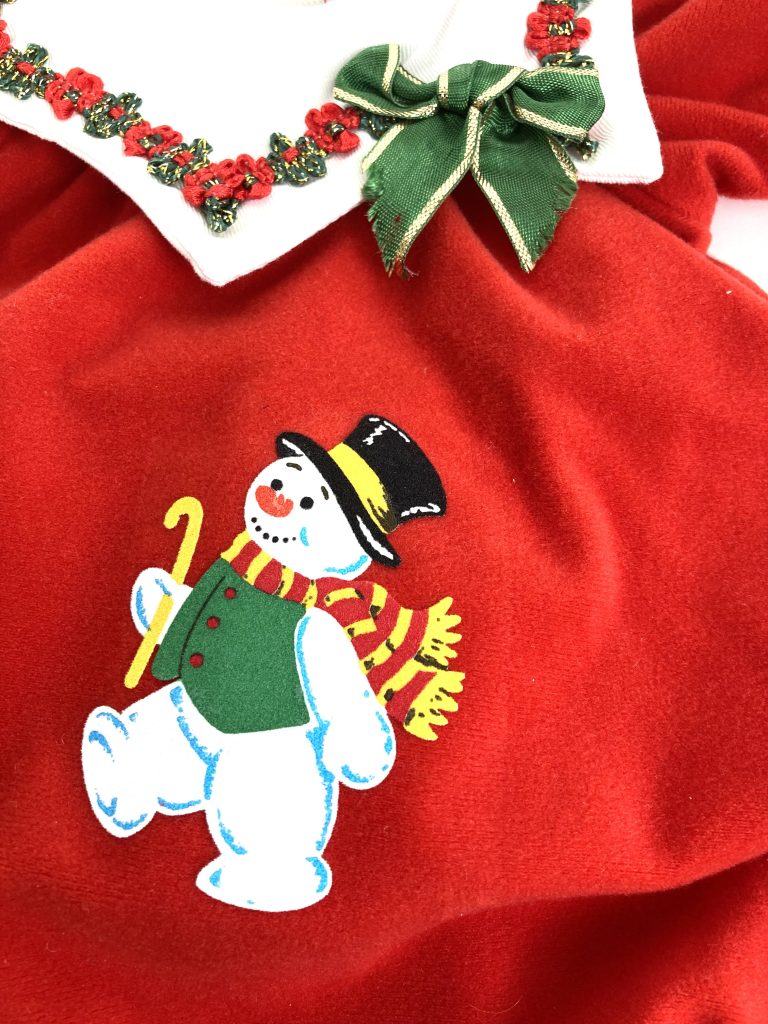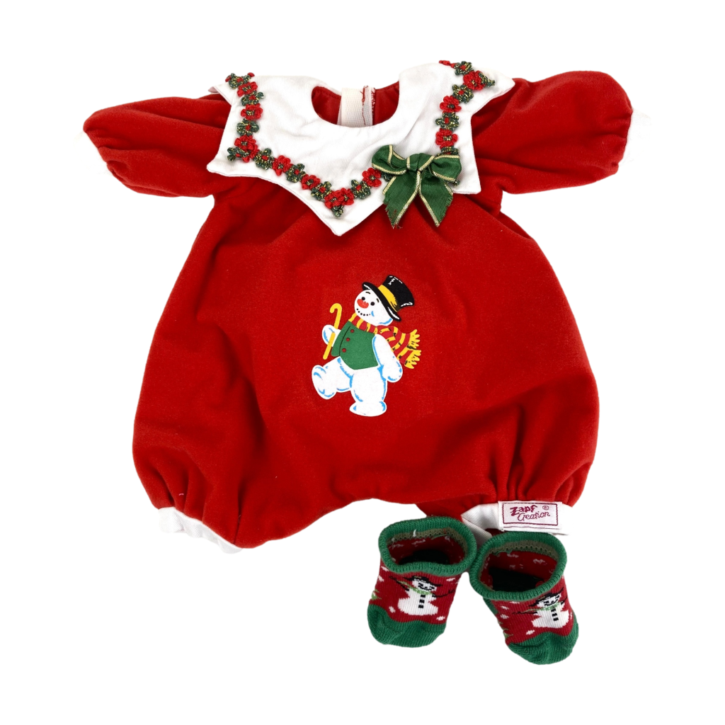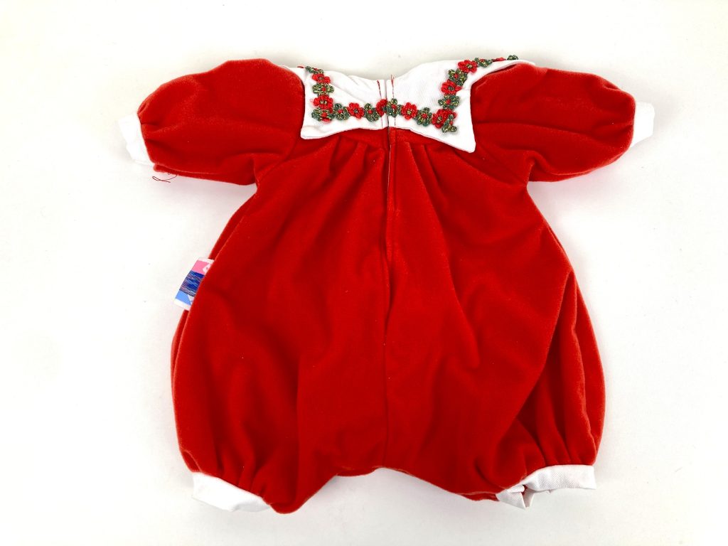 In zachte rode stof met sneeuwpop en kraag met opgeborduurde bloemetjes en strik. Met bijpassende sokjes. In prachtige staat.
