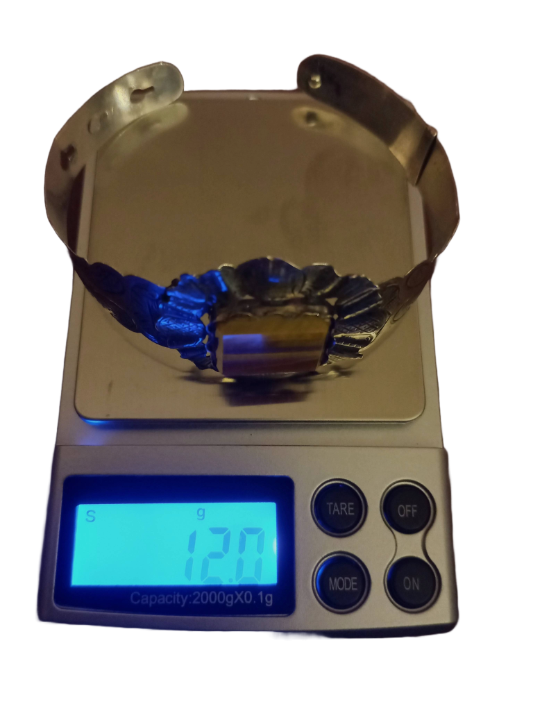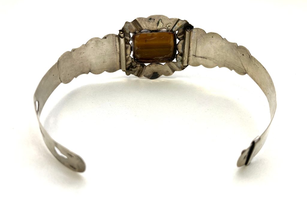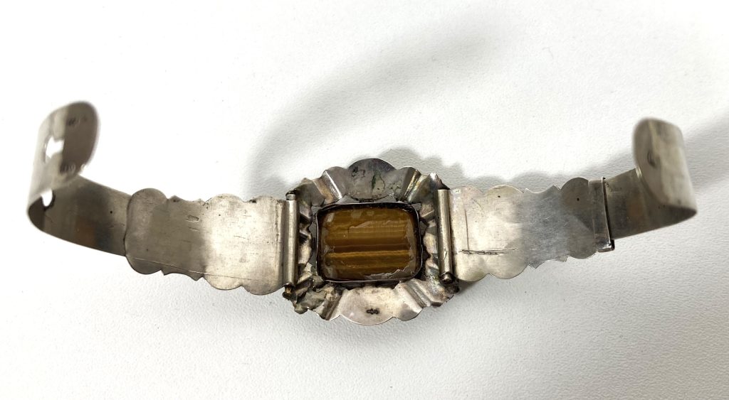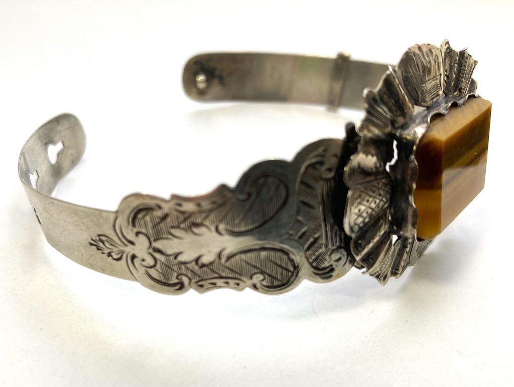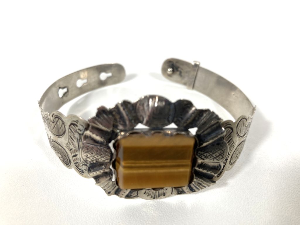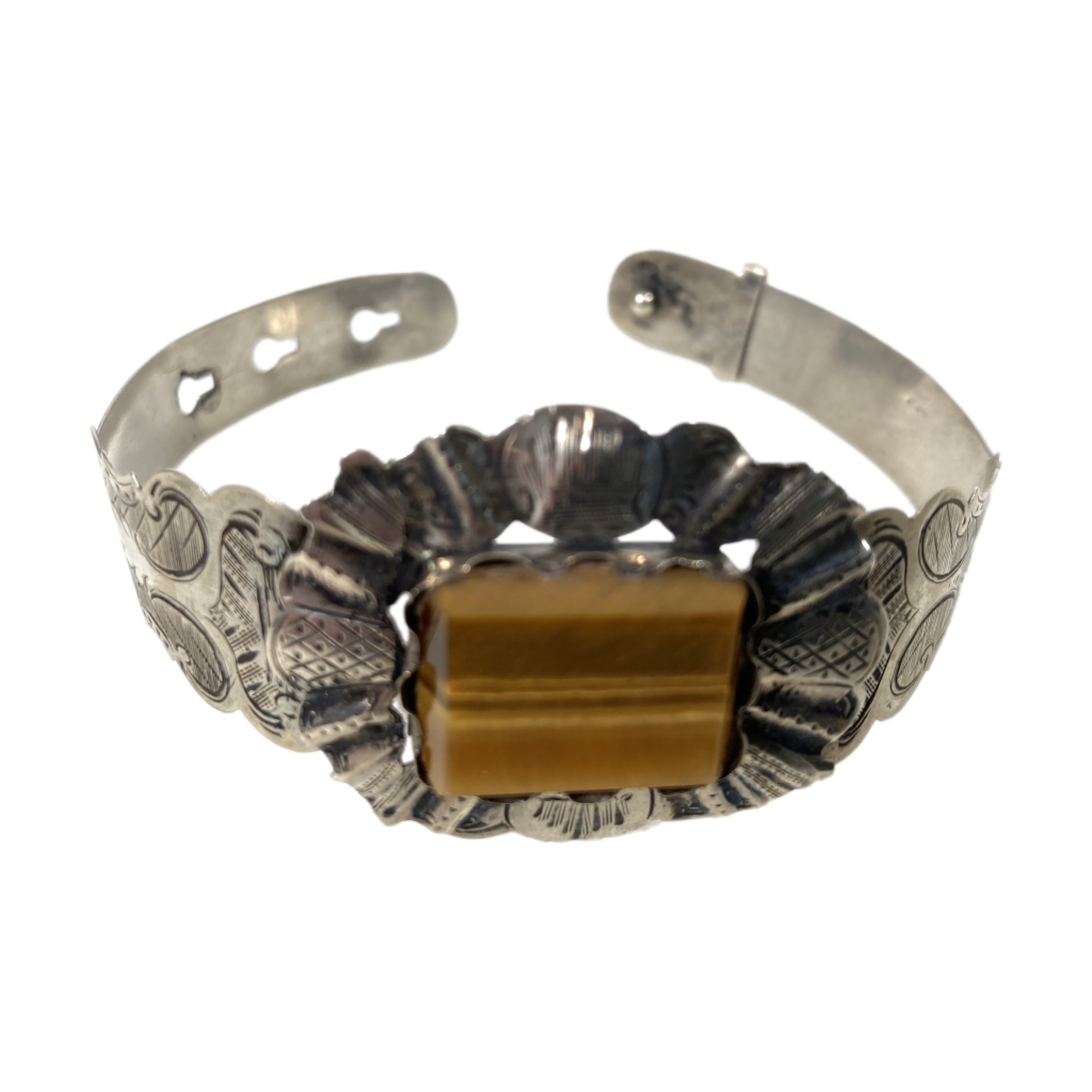 Zilveren manchet armband met tijgeroog inleg. Fraai gegraveerd. Formaat tijgeroog: 1,5×2 cm. Breedte band: 1-2 cm. Gekeurd met zwaardje en gemerkt: v.v.i.? Verstelbaar.