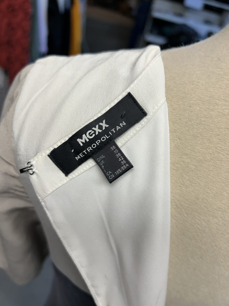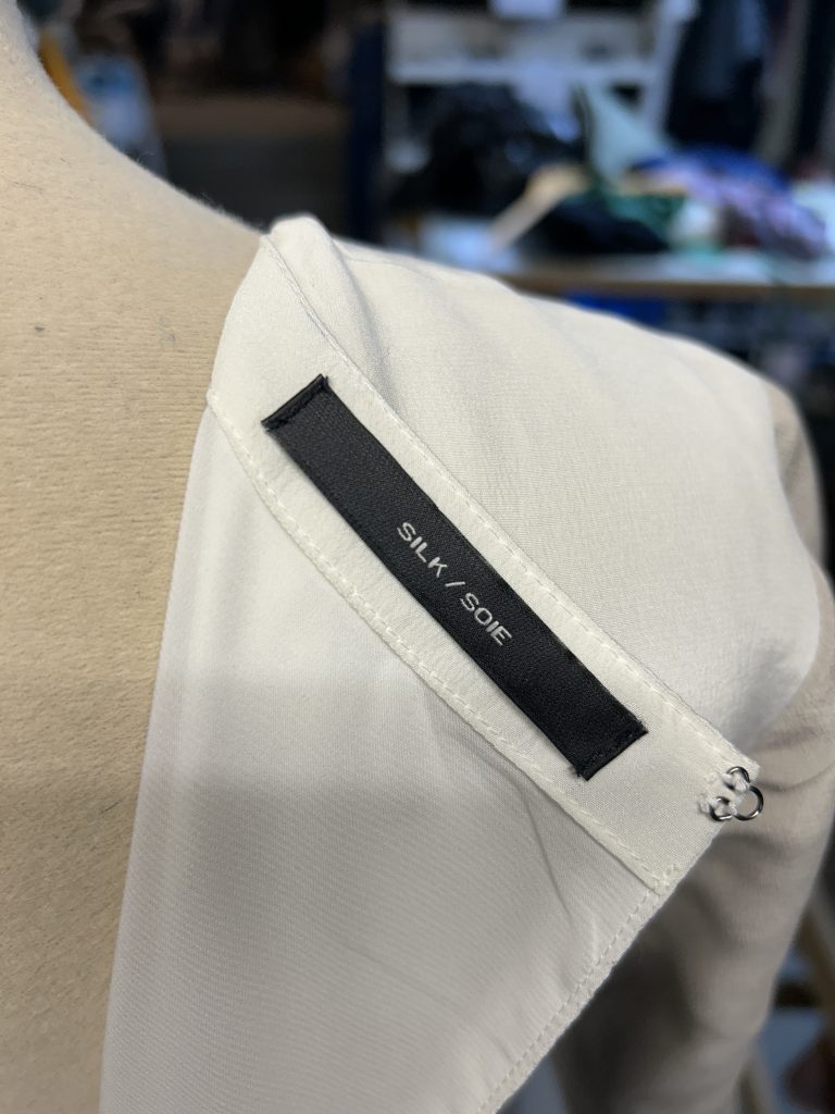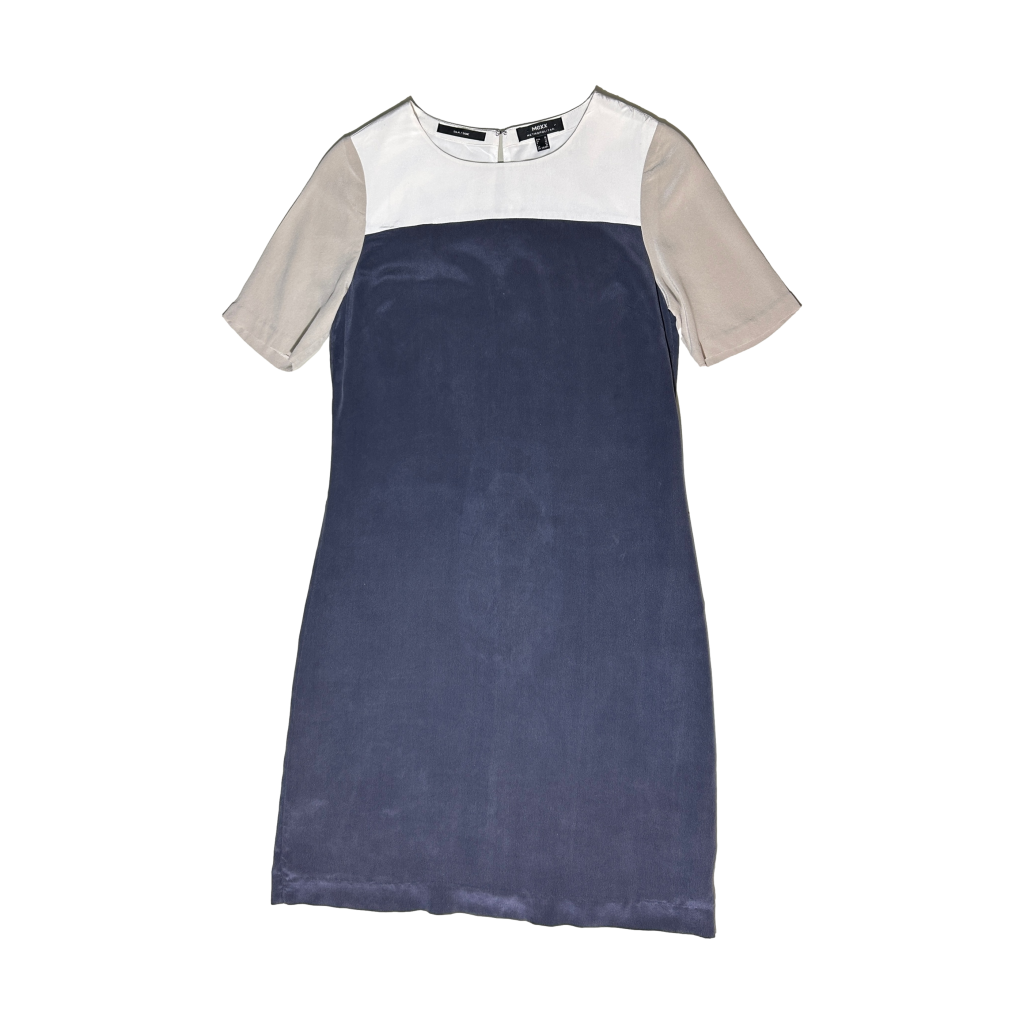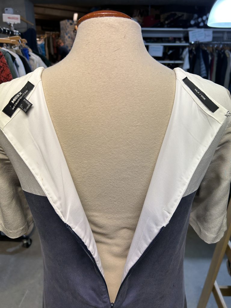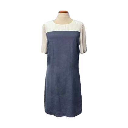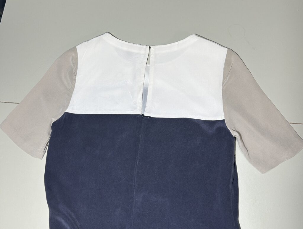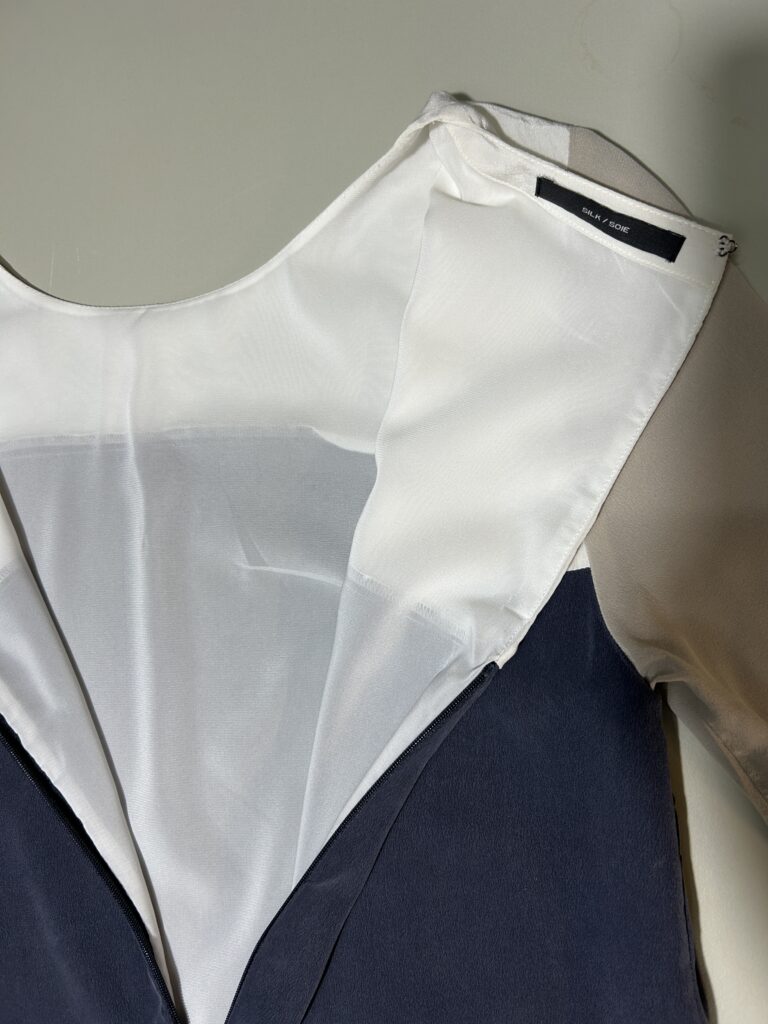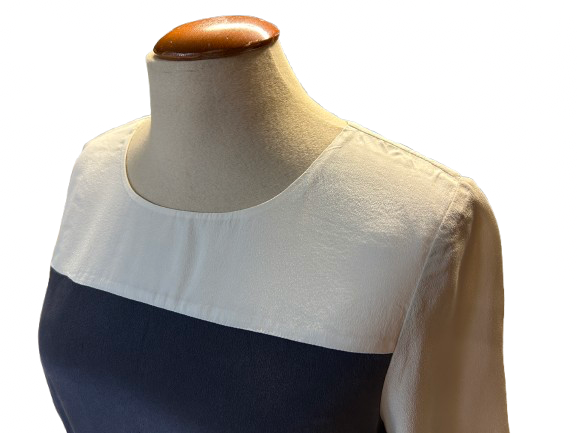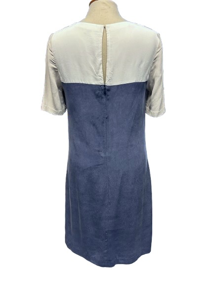 Soepel vallende jurk met korte mouwen van blauwe zijde gecombineerd met gebroken witte en ecru viscose. Recht, aangesloten model. De rits op de rug loopt tot op de hoogte van de schouderbladen, het bovenste gedeelte wordt gesloten met een knoop. De jurk heeft een witte voering.